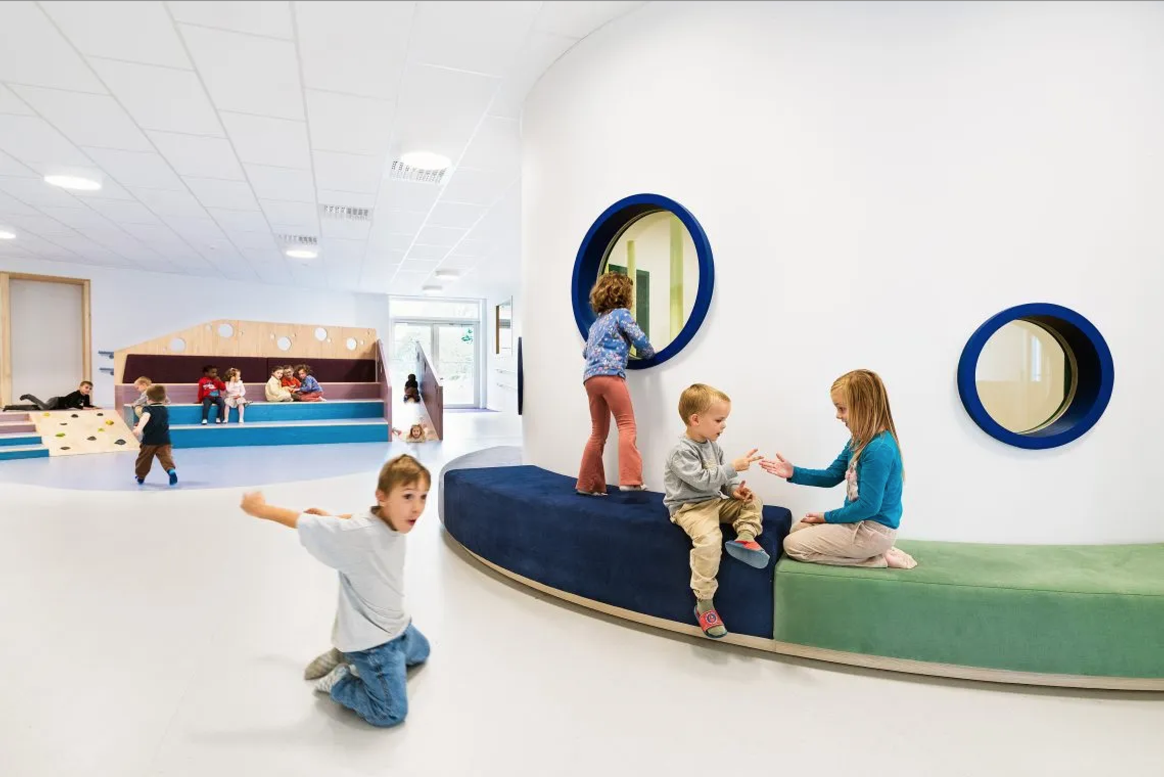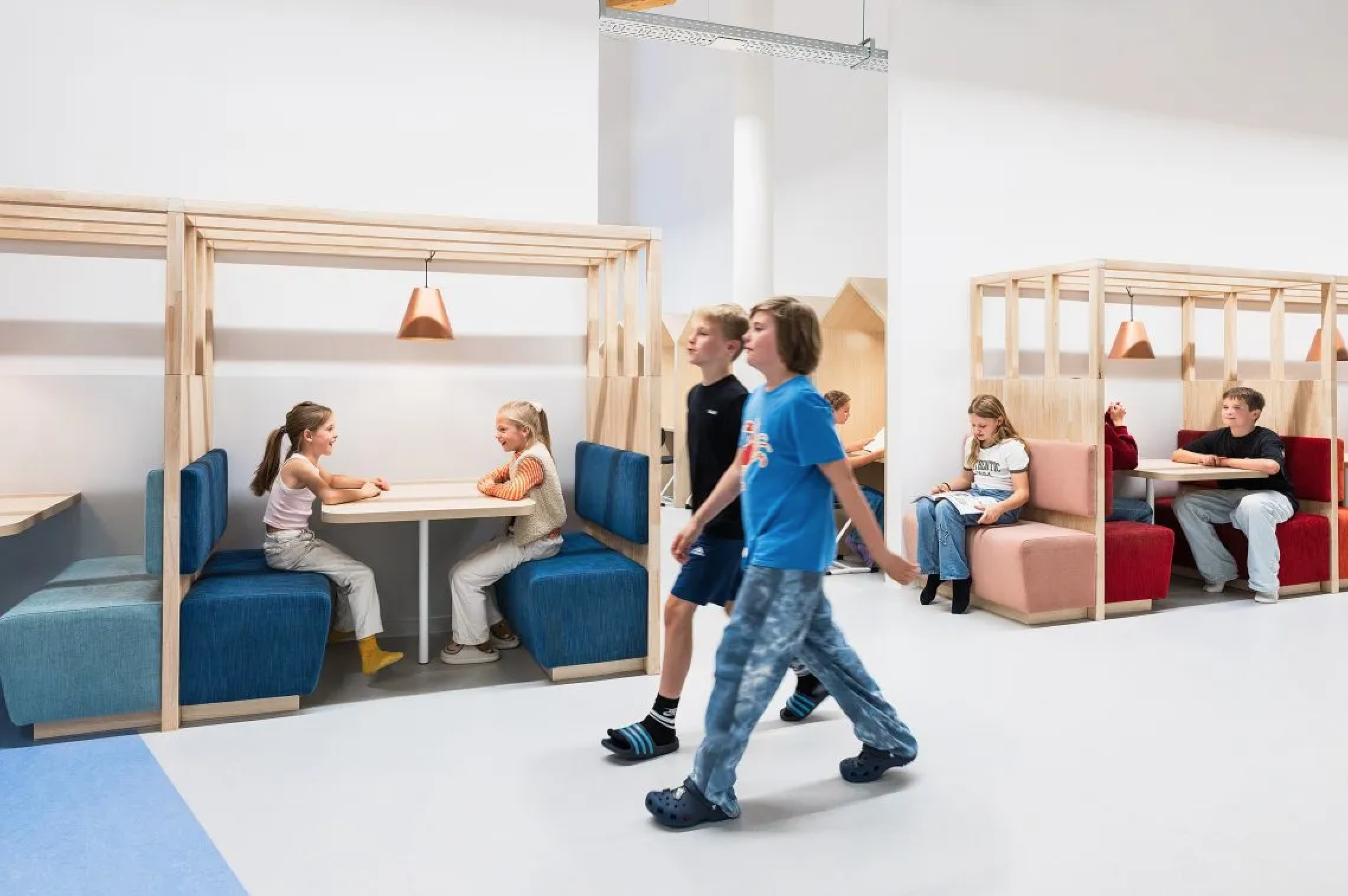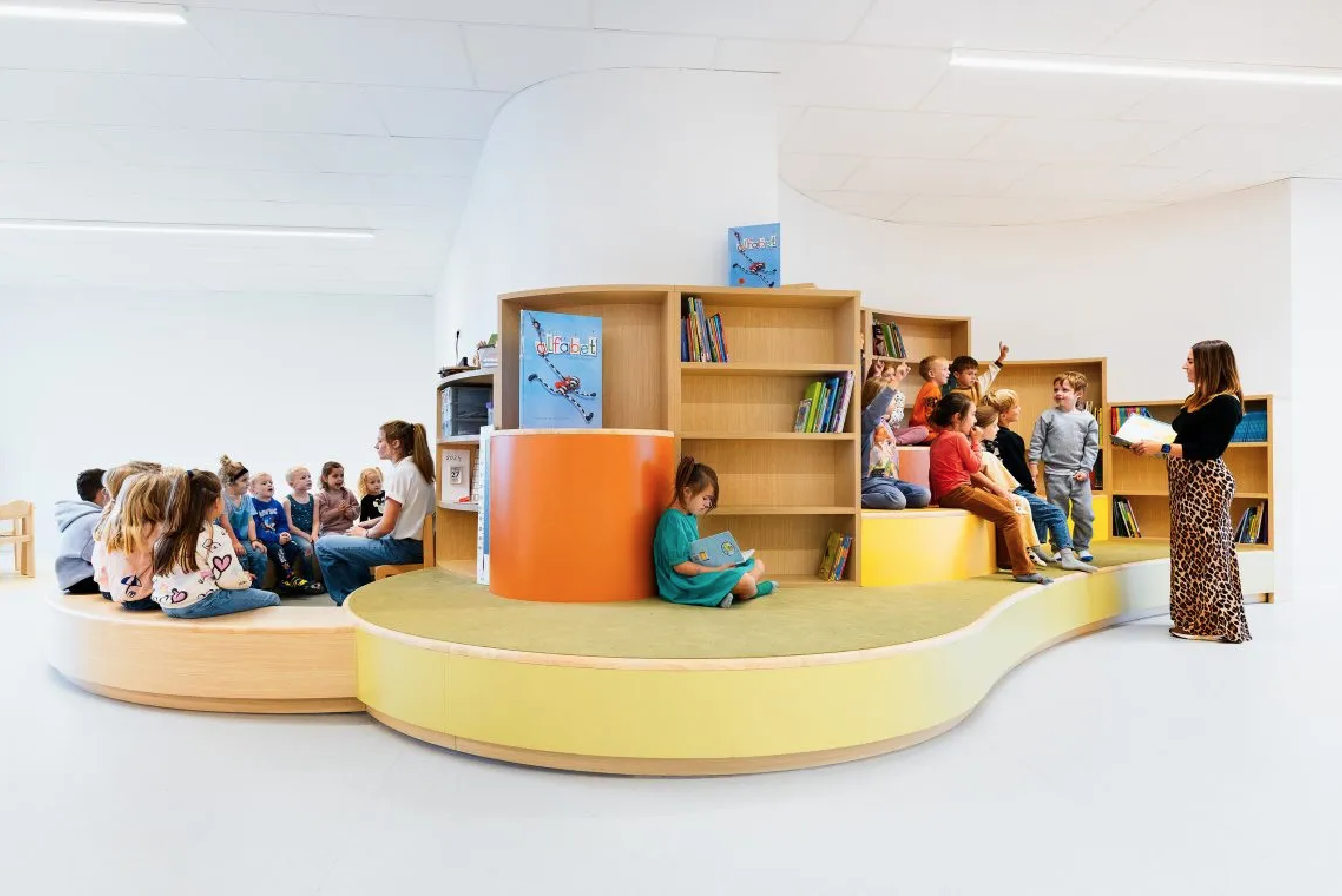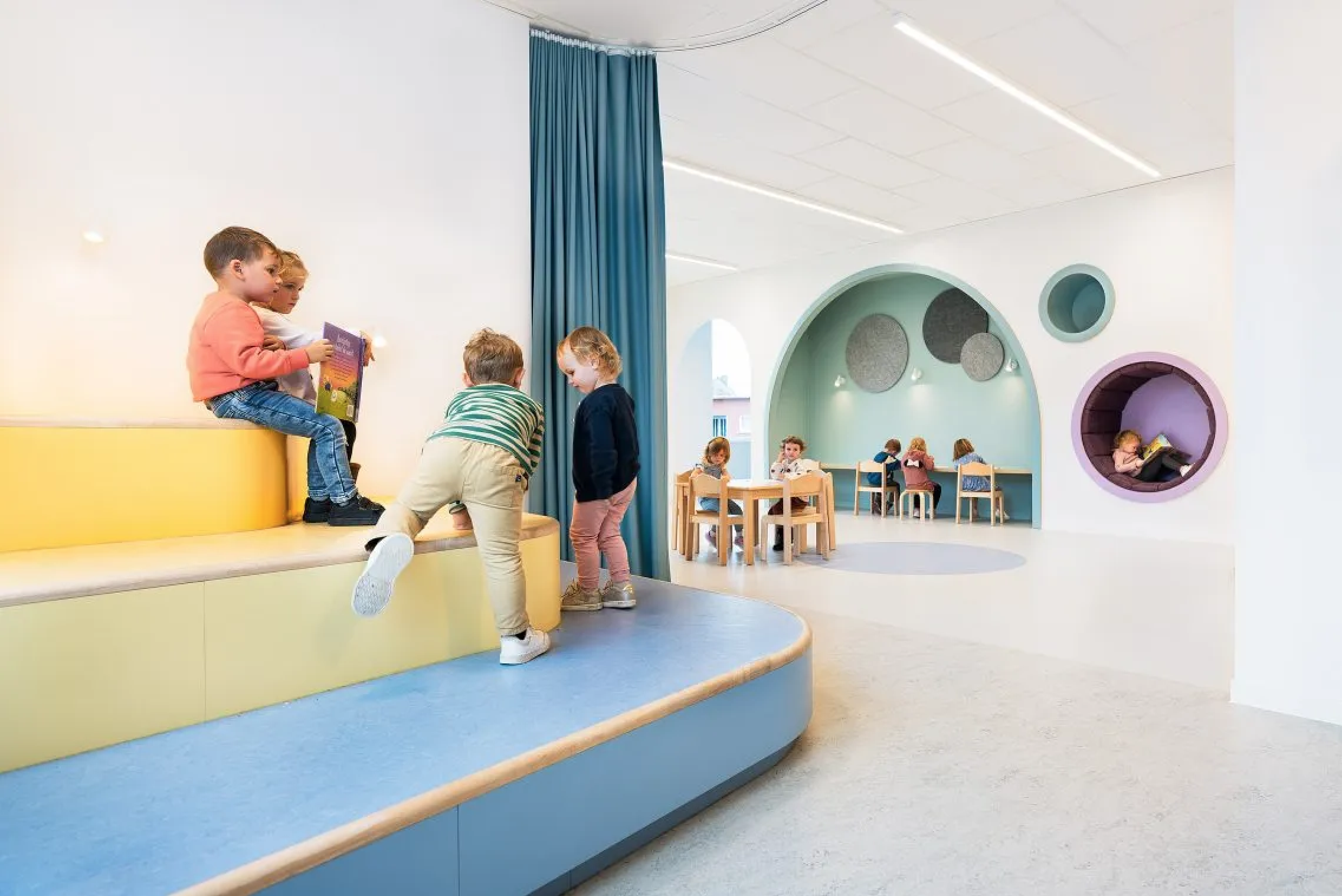 Обучение через игру, движение и вдохновение – ключевые понятия для концепции BS Klim Op Zandbergen, новой государственной начальной школы в Зандбергене, Бельгия. Школа ставит перед собой задачу в первую очередь развивать у детей и подростков креативные и социальные навыки, а также критическое мышление. Поэтому в интерьере школы основное внимание уделено созданию вдохновляющих пространств для активных игр, коммуникации и самостоятельных занятий учеников. Интерьер школы воспринимается как своего рода «третий учитель». Для разных возрастных групп предусмотрены разные по оформлению и оснащению пространства, в каждом из которых есть спокойные зоны для концентрации, комнаты для групповых занятий и помещения с гибкой функцией. Общий приоритет – естественный свет и естественный воздухообмен.