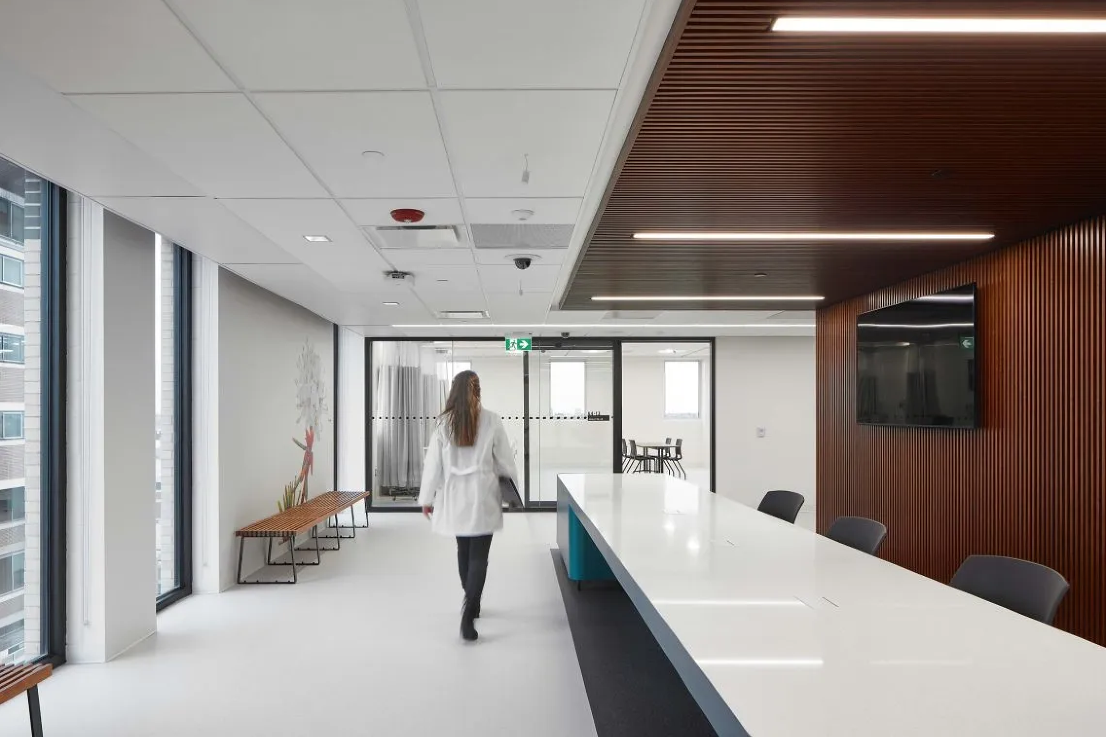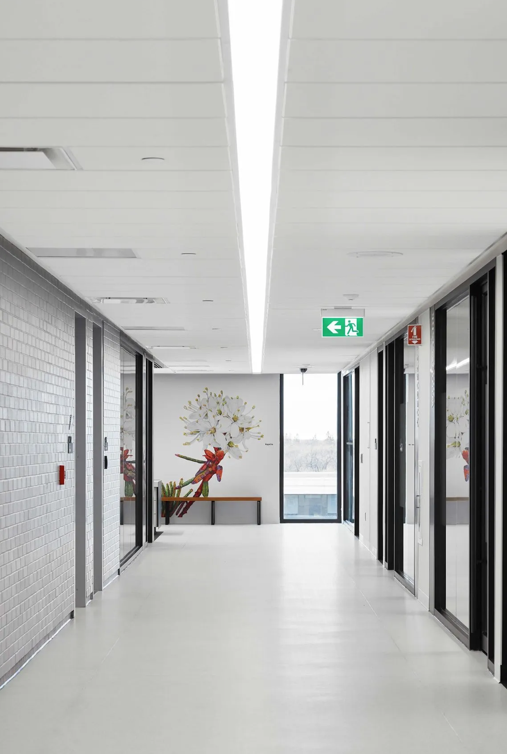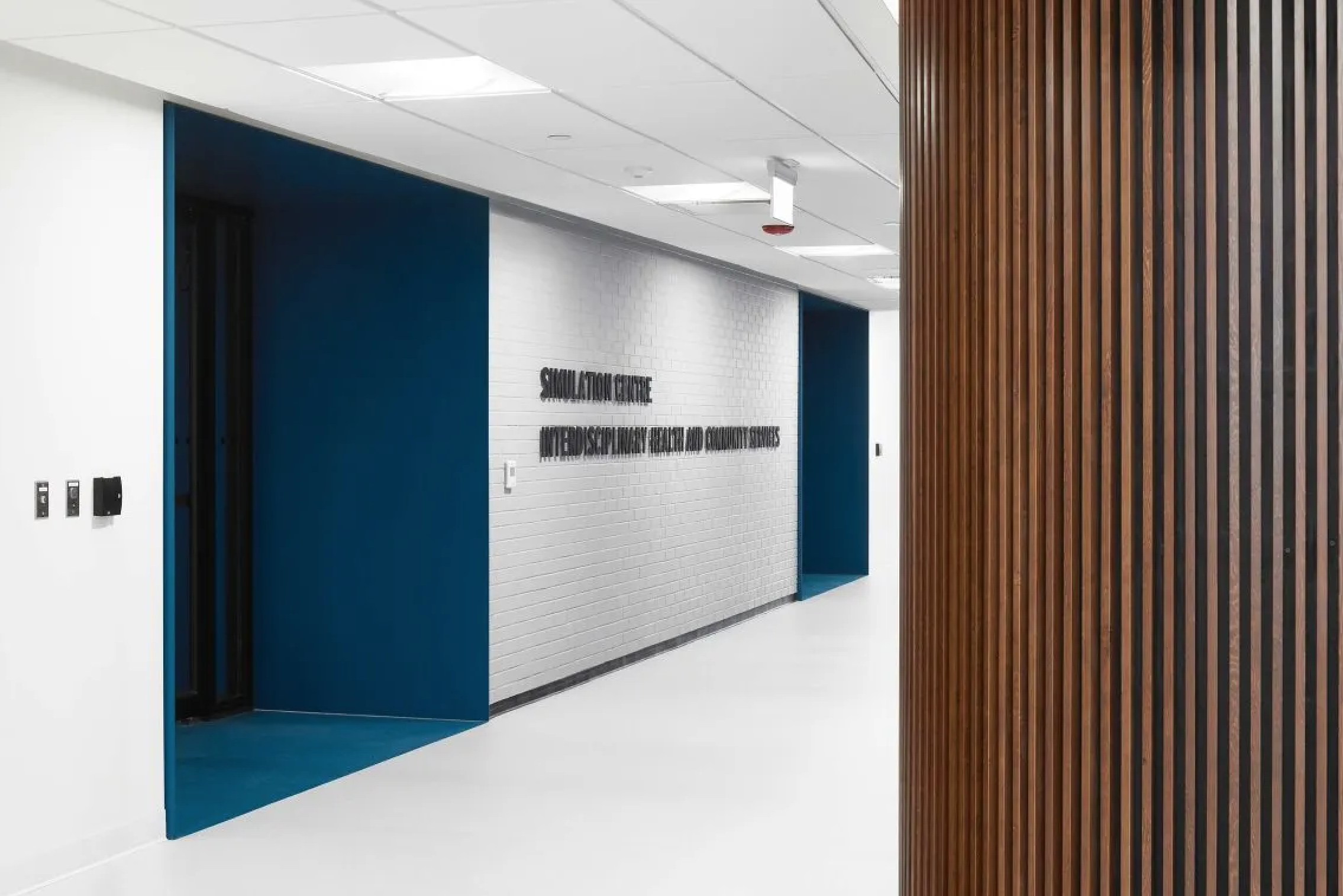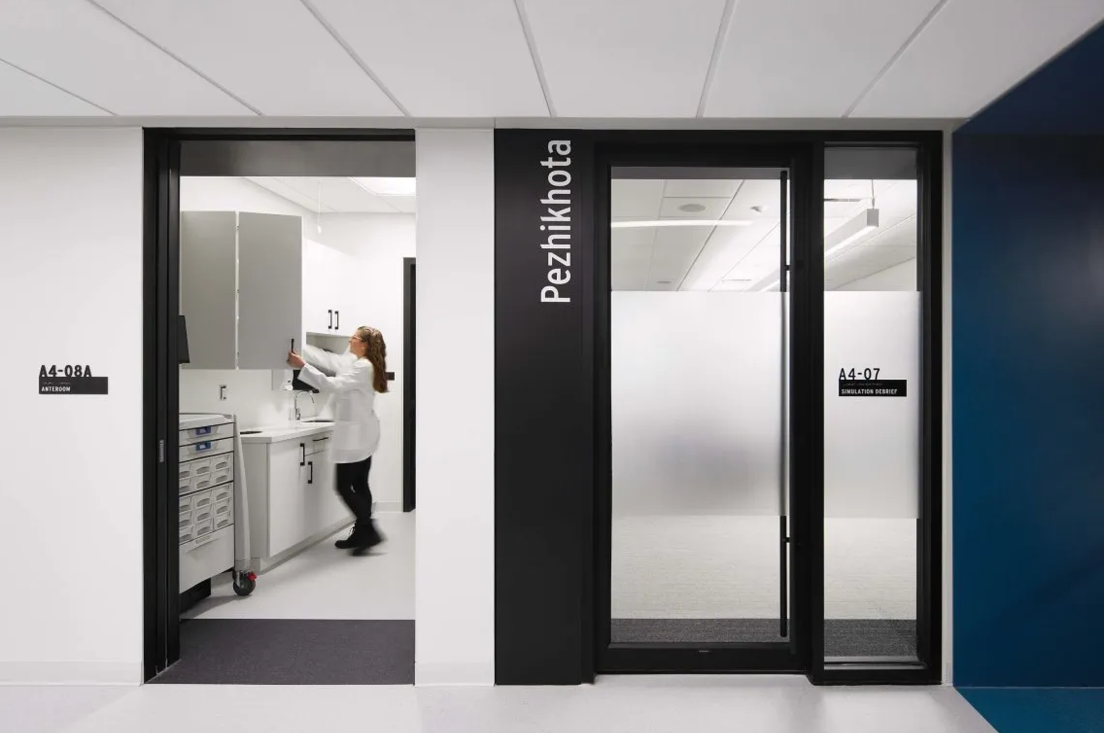 Симуляции – стрессовый метод обучения, и для того чтобы снизить эмоциональное напряжение у студентов, в интерьере преобладает белый цвет. Для маркировки симуляционных кабинетов используются порталы бирюзового цвета, остальные помещения имеют черные порталы.