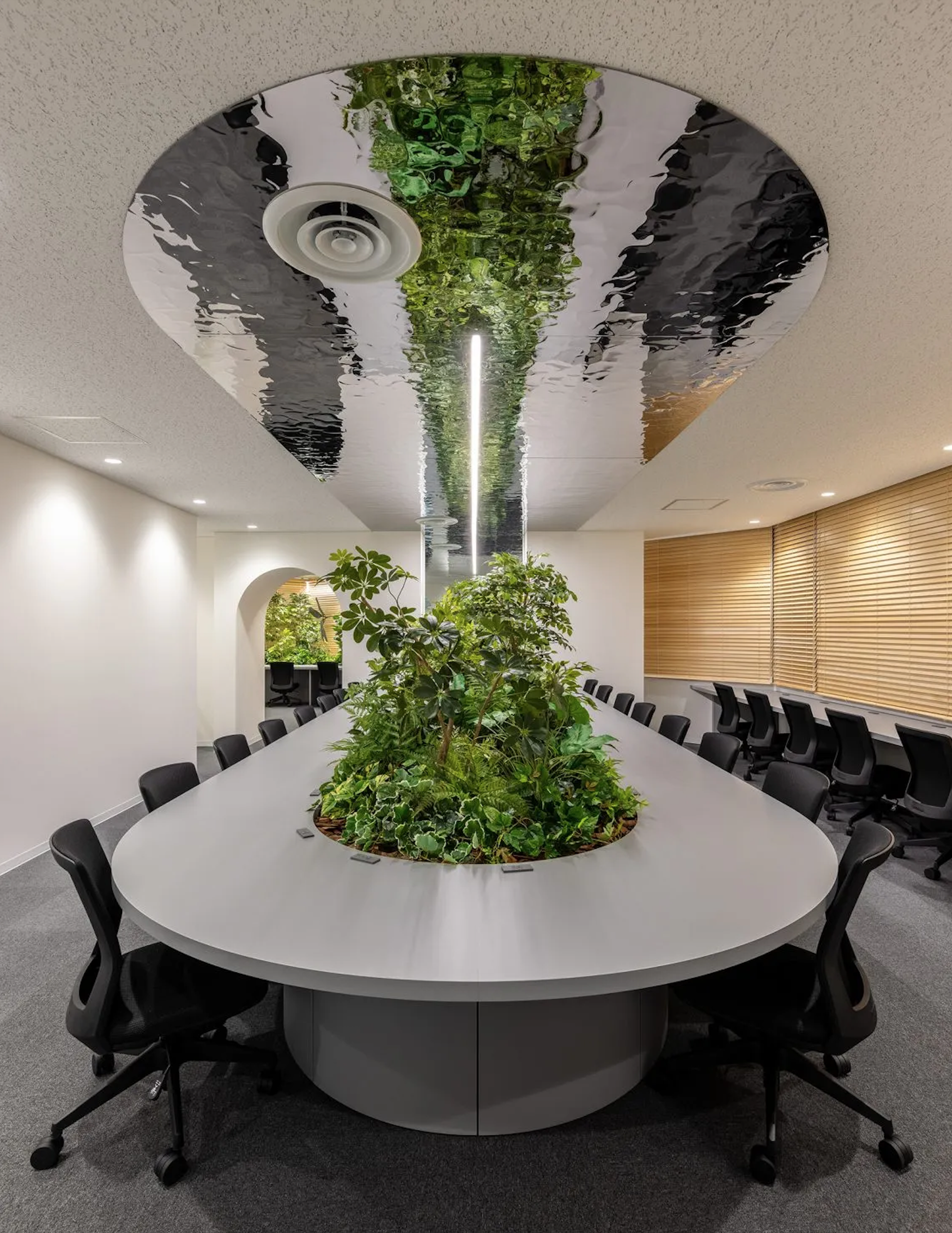 В задачу архитекторов входило максимально эффективно использовать имеющуюся площадь, создав как можно больше мест для занятий при сохранении требований к индивидуальному комфорту. С точки зрения оформления интерьеров приоритетом была спокойная атмосфера, способствующая концентрации внимания. Общий минималистичный подход слегка смягчают деревянные жалюзи на окнах и живые растения, включенные в интерьер с двоякой целью: с одной стороны – сделать пространство более уютным, с другой – служить ширмой между рядами столов для занятий. Потолок в холле и комнатах для занятий отделан рифленой нержавеющей сталью, что визуально увеличивает высоту помещений. Этой же цели служит зеркальная стена в холле, создающая иллюзию большого круглого в плане зала.