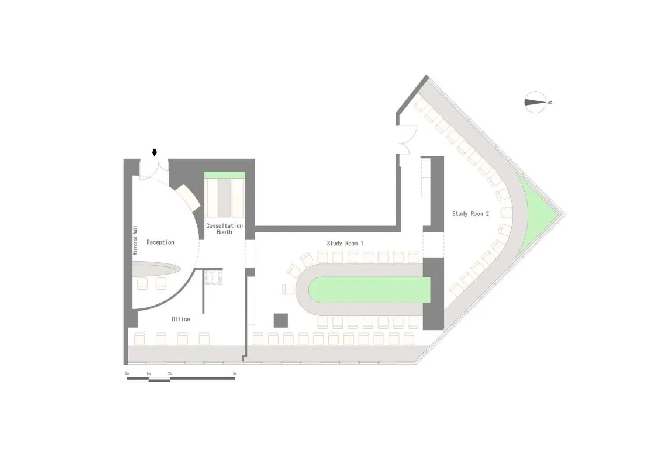 Pure Semicircles – это центр для дополнительной подготовки учащихся младших и старших классов школы к экзаменам. Процесс обучения проходит на компьютерах и ноутбуках, поэтому помещения центра не похожи на обычные классы с рядами столов и доской, на которой учитель пишет задания. Под центр выделено компактное помещение в обычном офисном здании в центре города Осака.