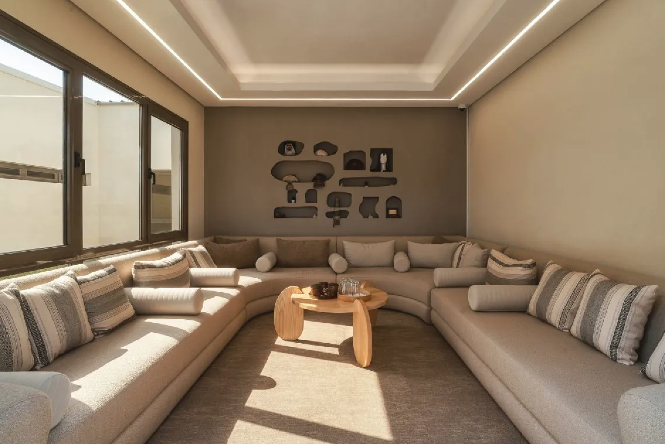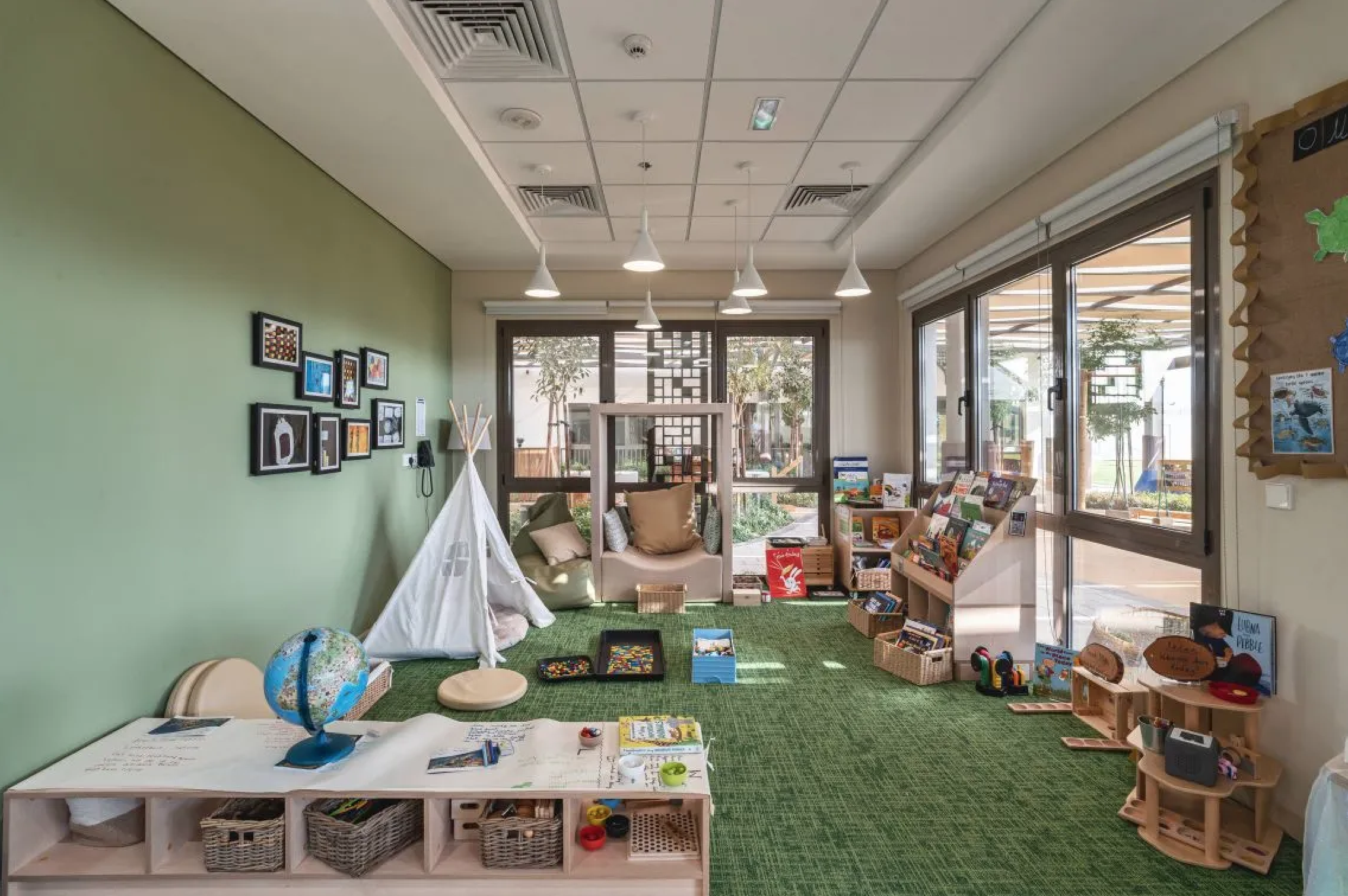 В интерьер деликатно введены этнические мотивы и орнаменты. Мягкие зеленые и серо-охристые цвета напоминают палитру пустыни, а мебель, соответствующая детским размерам, и тактильно продуманный выбор материалов снижают когнитивную перегрузку и способствуют сенсорной регуляции.
