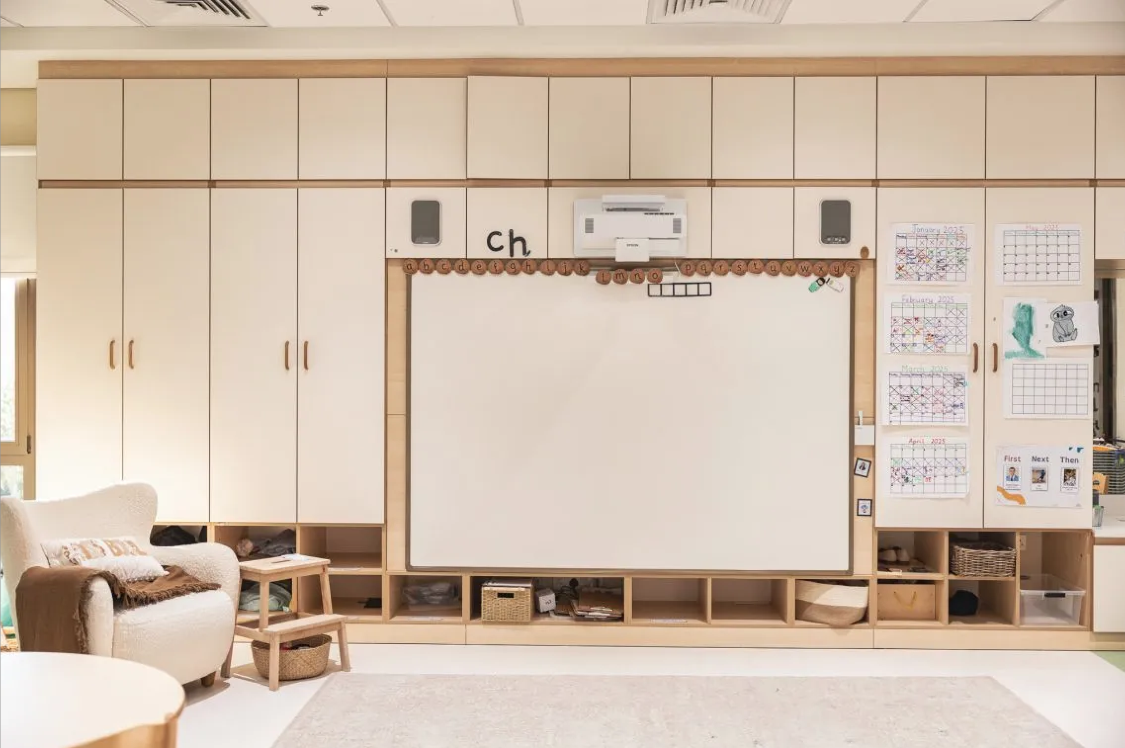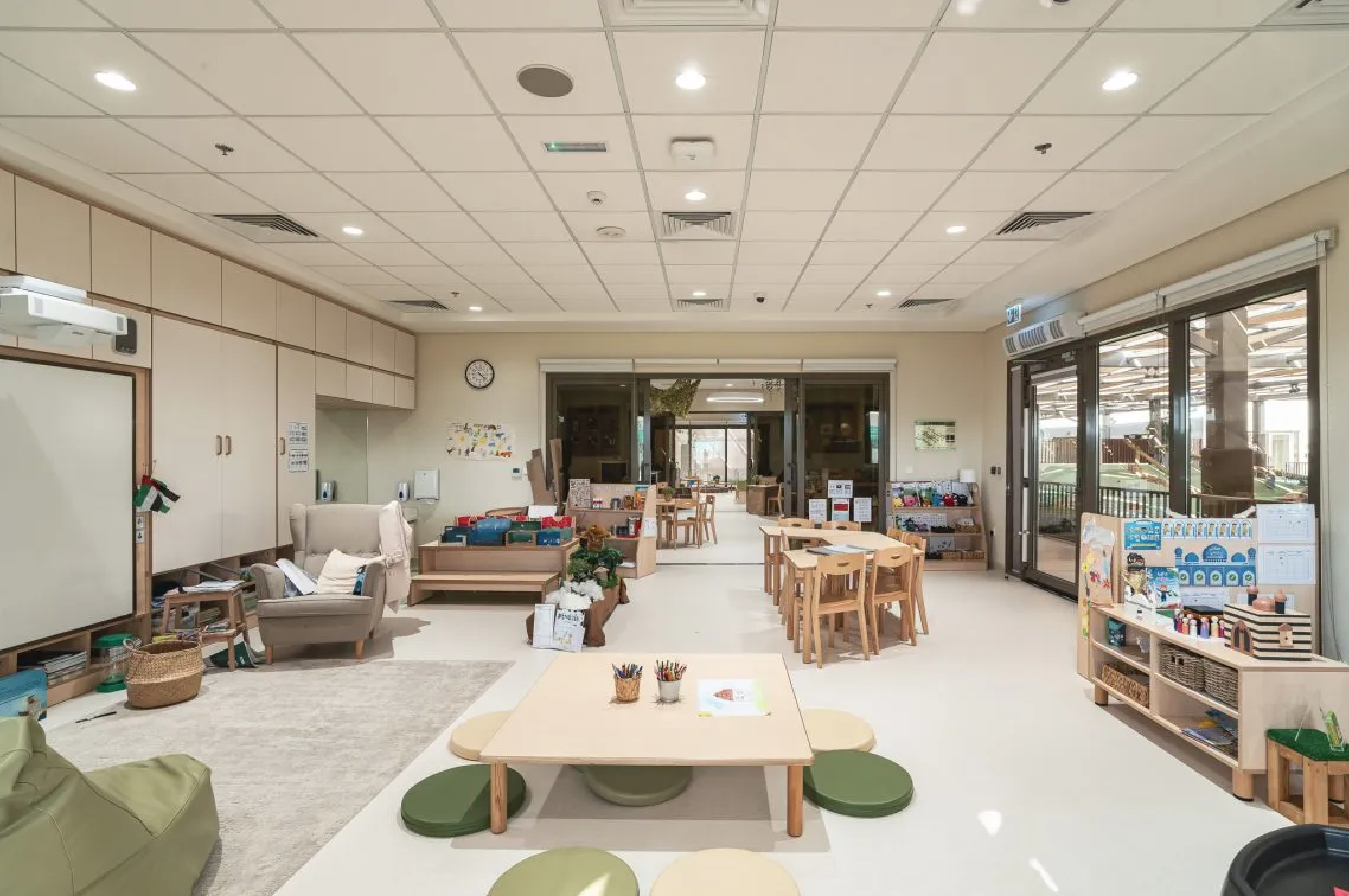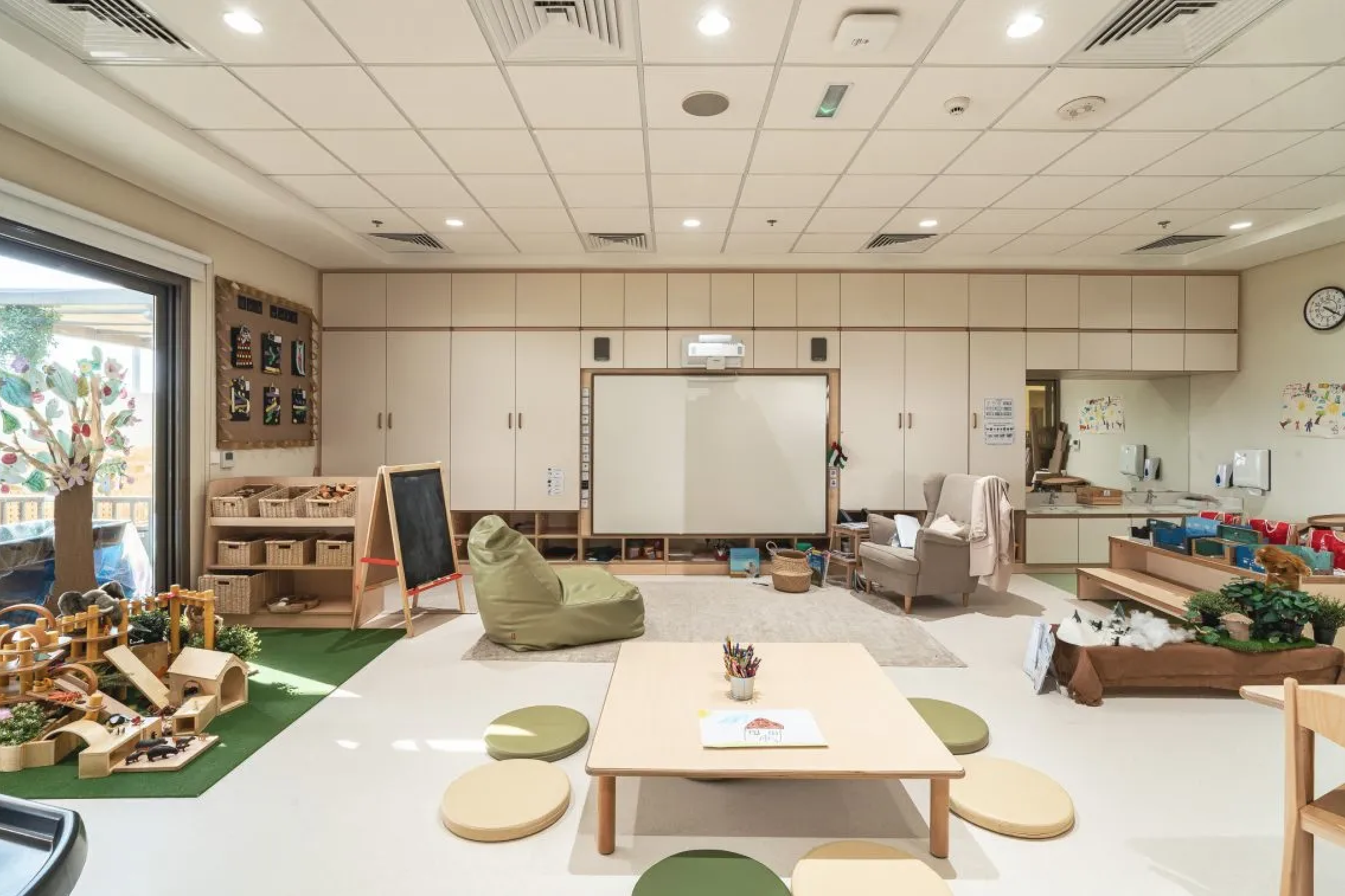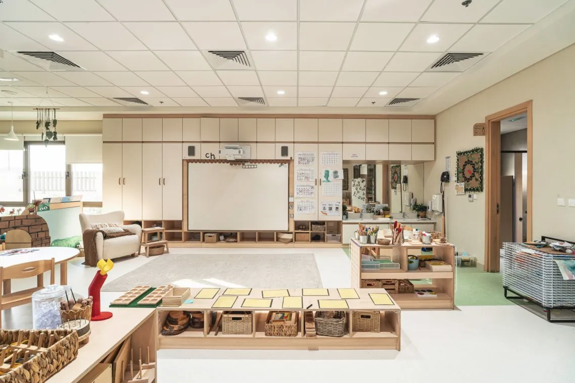Вместо скучных классов для занятий созданы пространства, сочетающие домашний уют и учебное оборудование. В каждом предусмотрены места для общих и индивидуальных занятий. Рядом с каждым классом есть внутренний дворик для отдыха и игр.