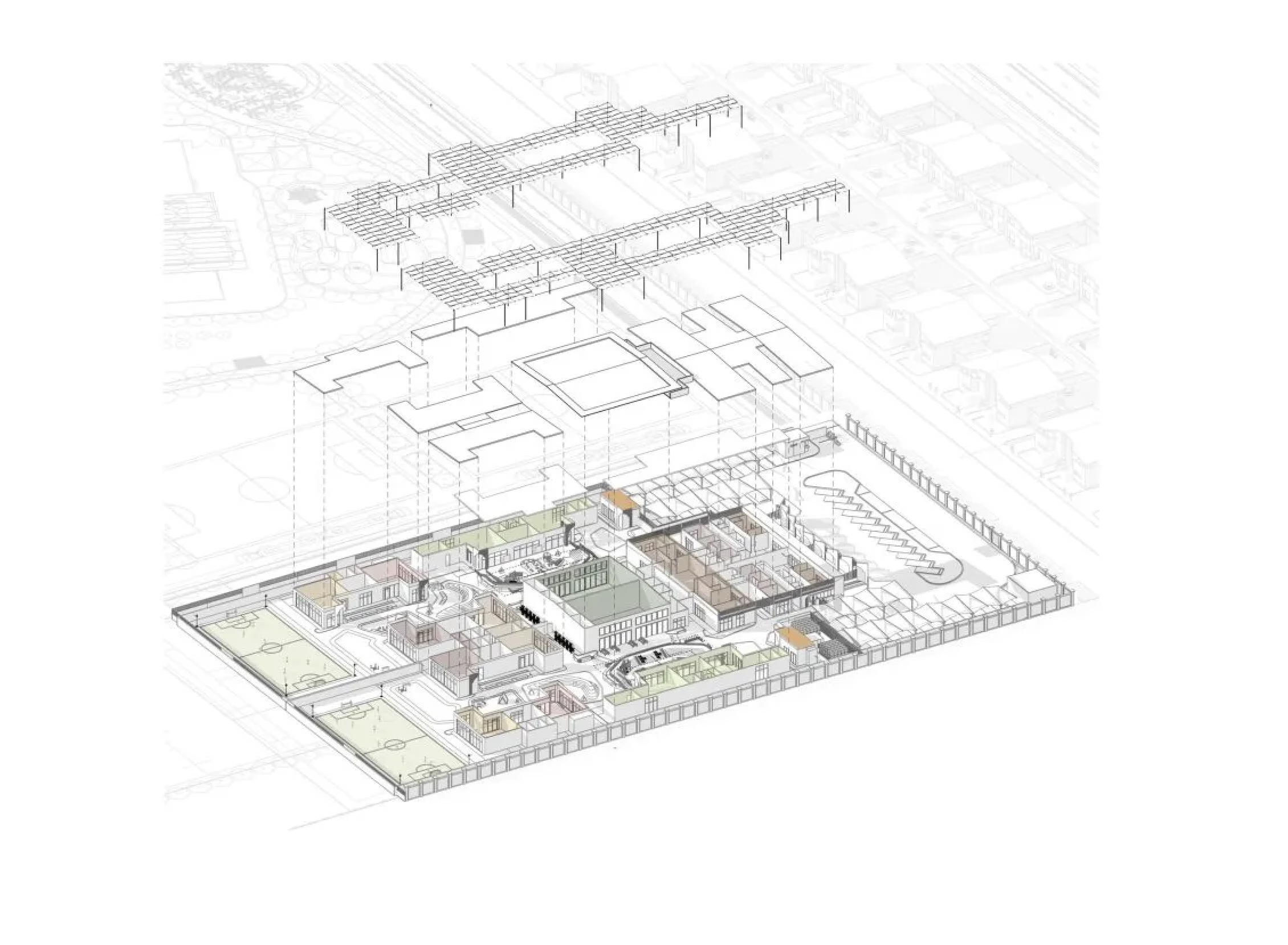 В школе два отделения – для девочек и для мальчиков, но оба решены на основе одинаковых подходов и планировочной структуры, что хорошо видно на плане кампуса. Прямоугольный участок разделен на три части: парковку, блок из нескольких учебных зданий и блок с двумя футбольными полями.