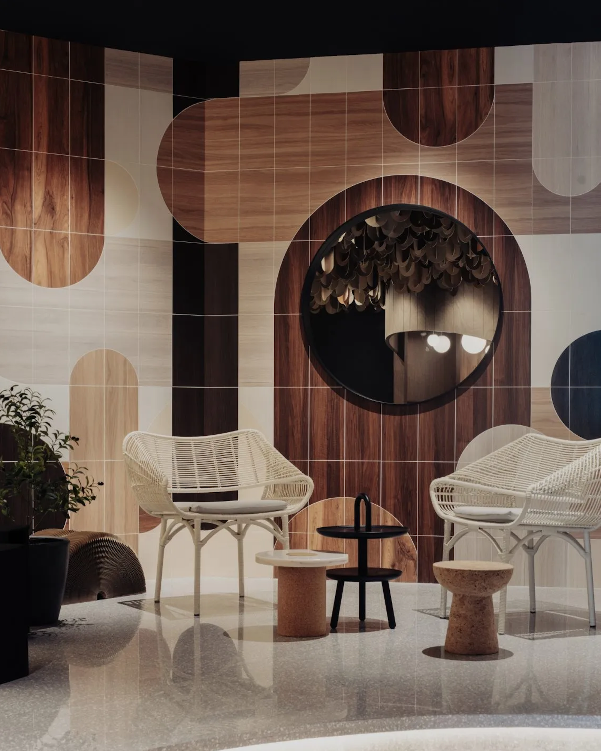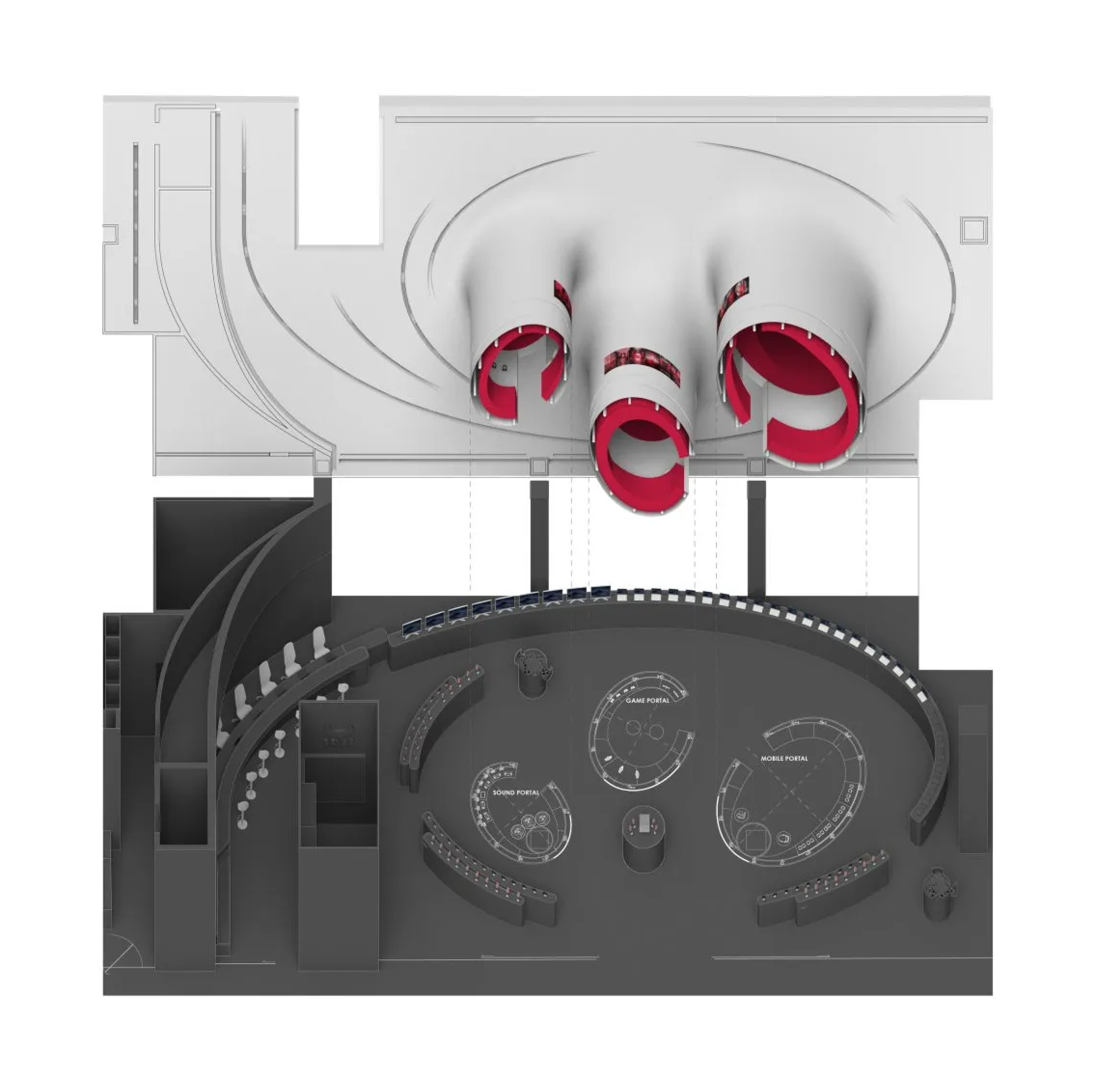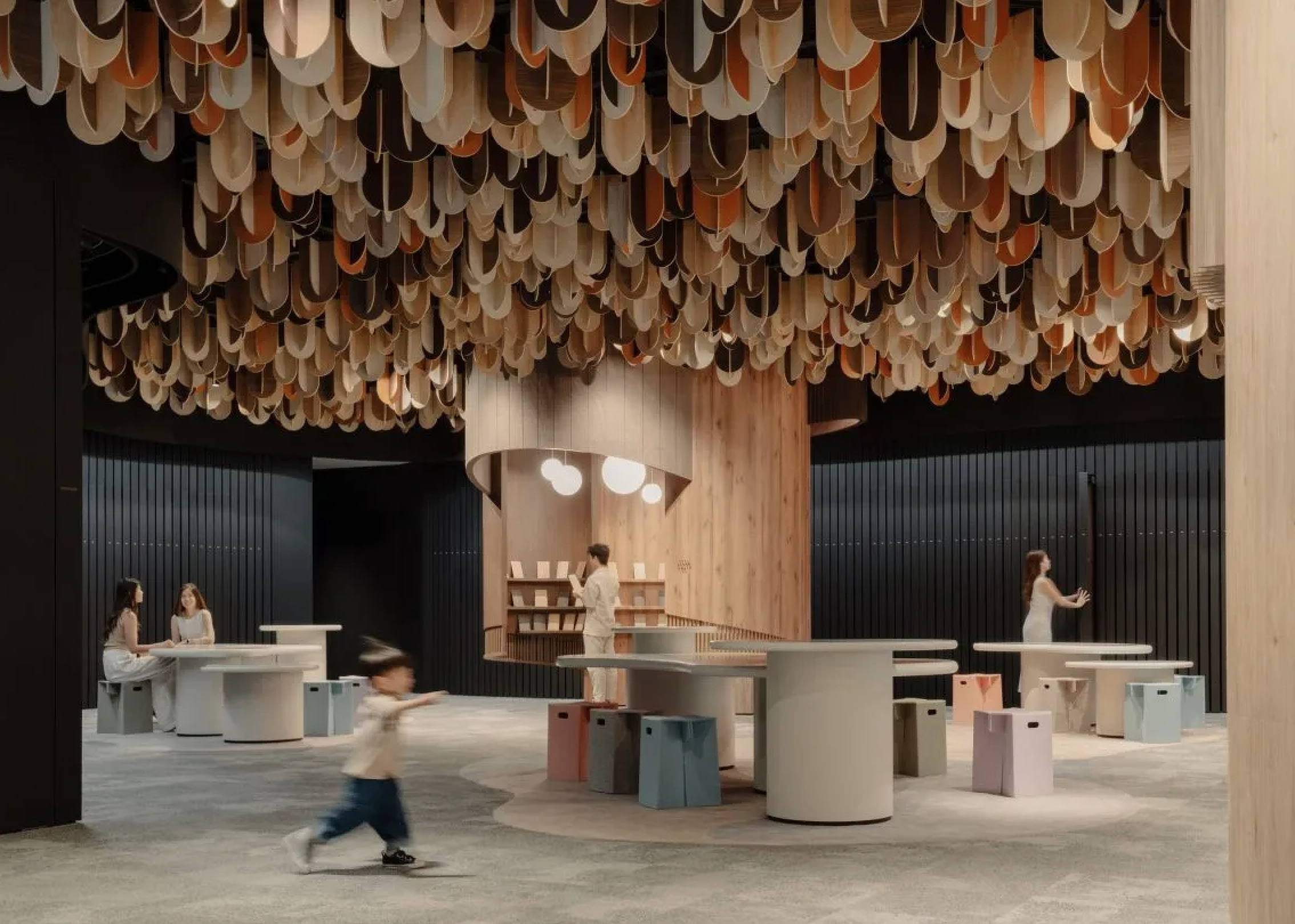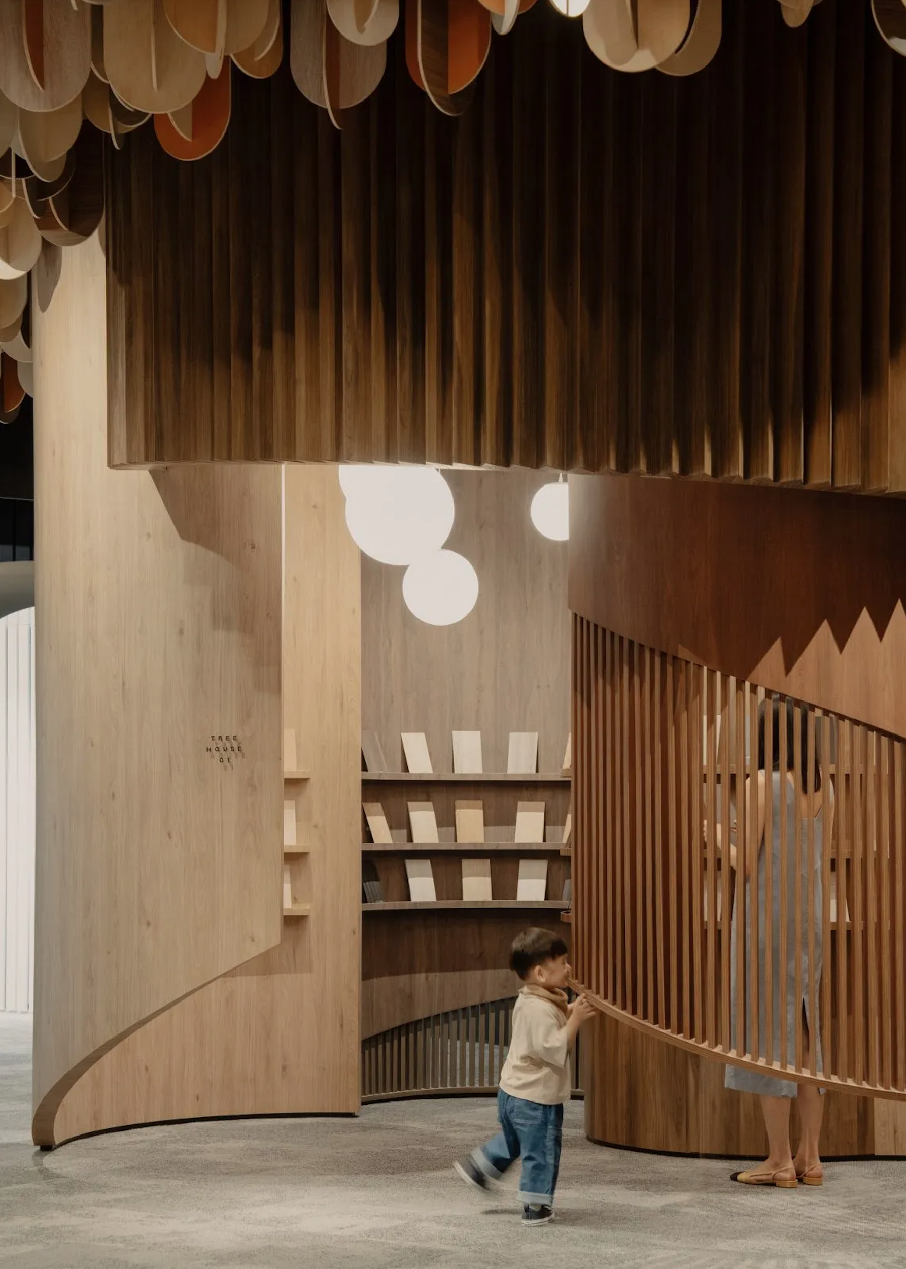 Часть интерьера напоминает сказочный сад со свисающими с потолка листьями – образцами продукции, и огромными цилиндрами-шкафами, похожими на стволы секвой. В столы и стены вмонтированы экраны, на которых показываются ролики о разных товарах и с помощью которых можно найти дополнительную информацию.