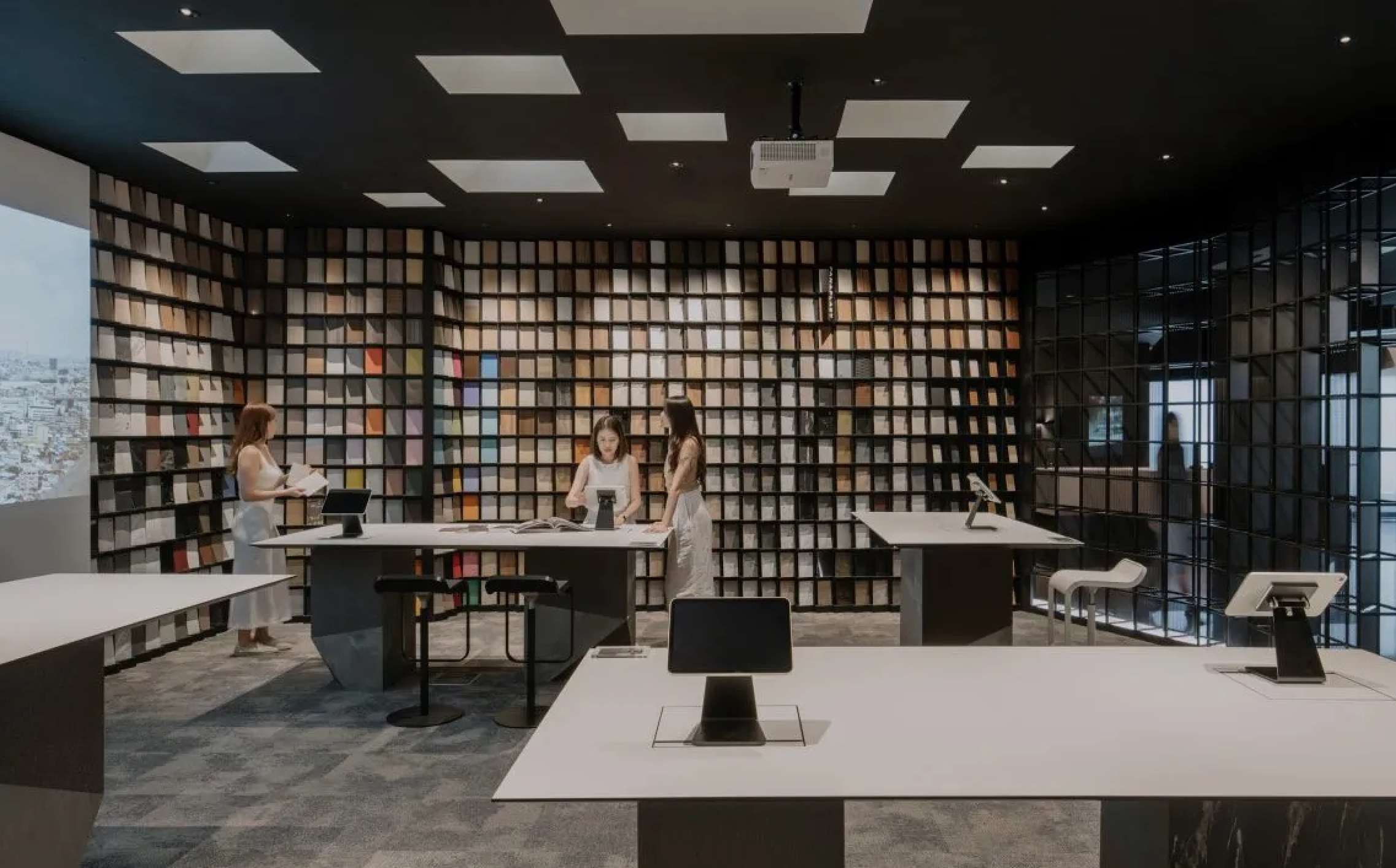 Вторая часть похожа на библиотеку – здесь можно сосредоточиться на выборе конкретных материалов для своего проекта. Мебель в «библиотеке» легко трансформируется, благодаря чему здесь можно проводить семинары и мастер-классы.