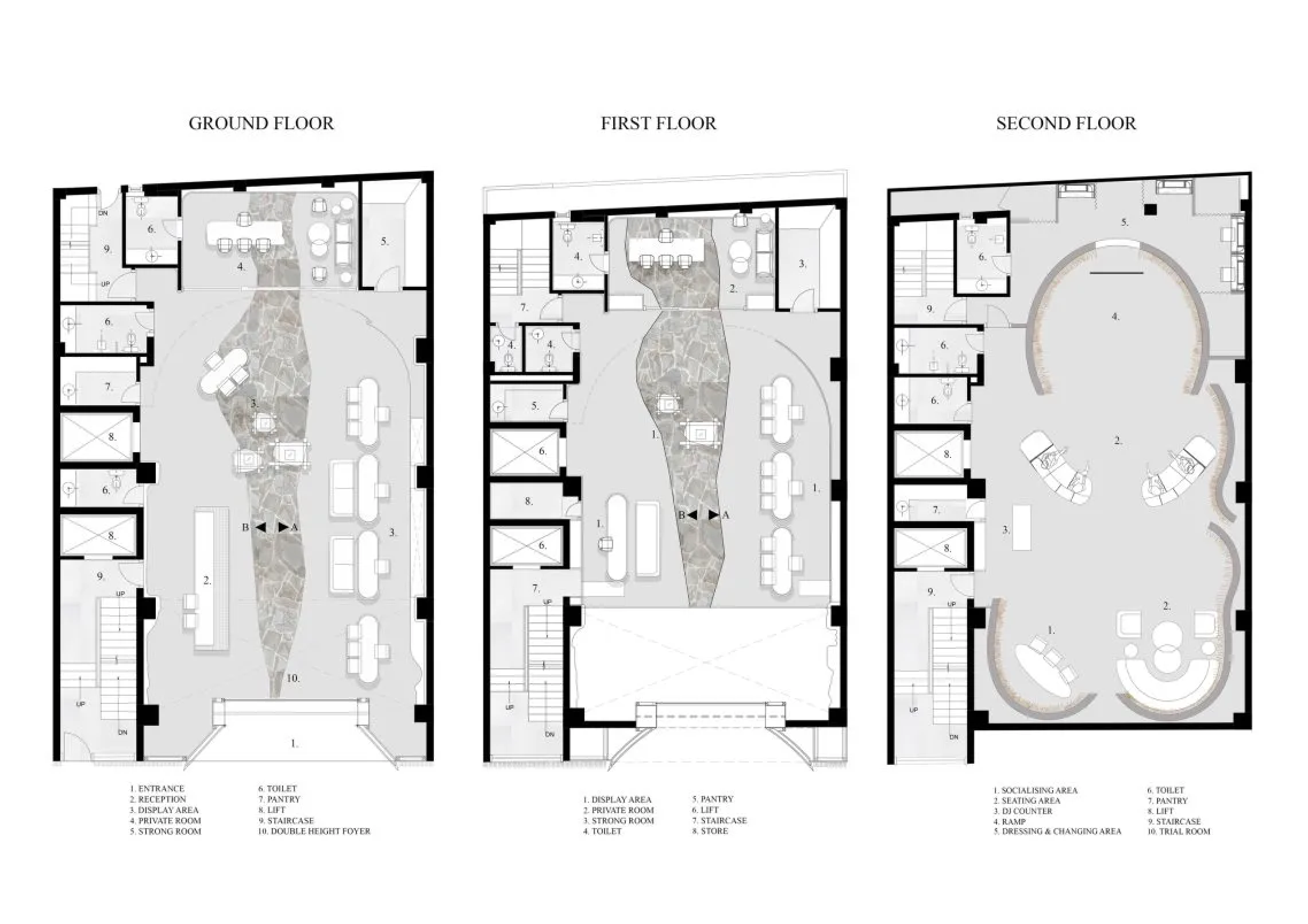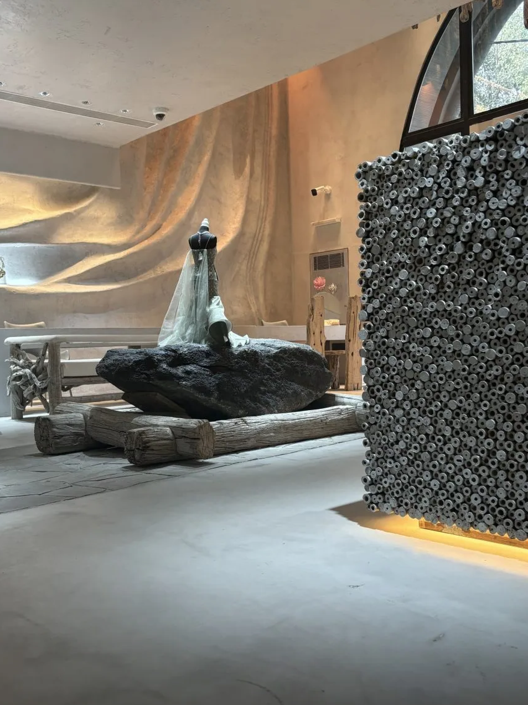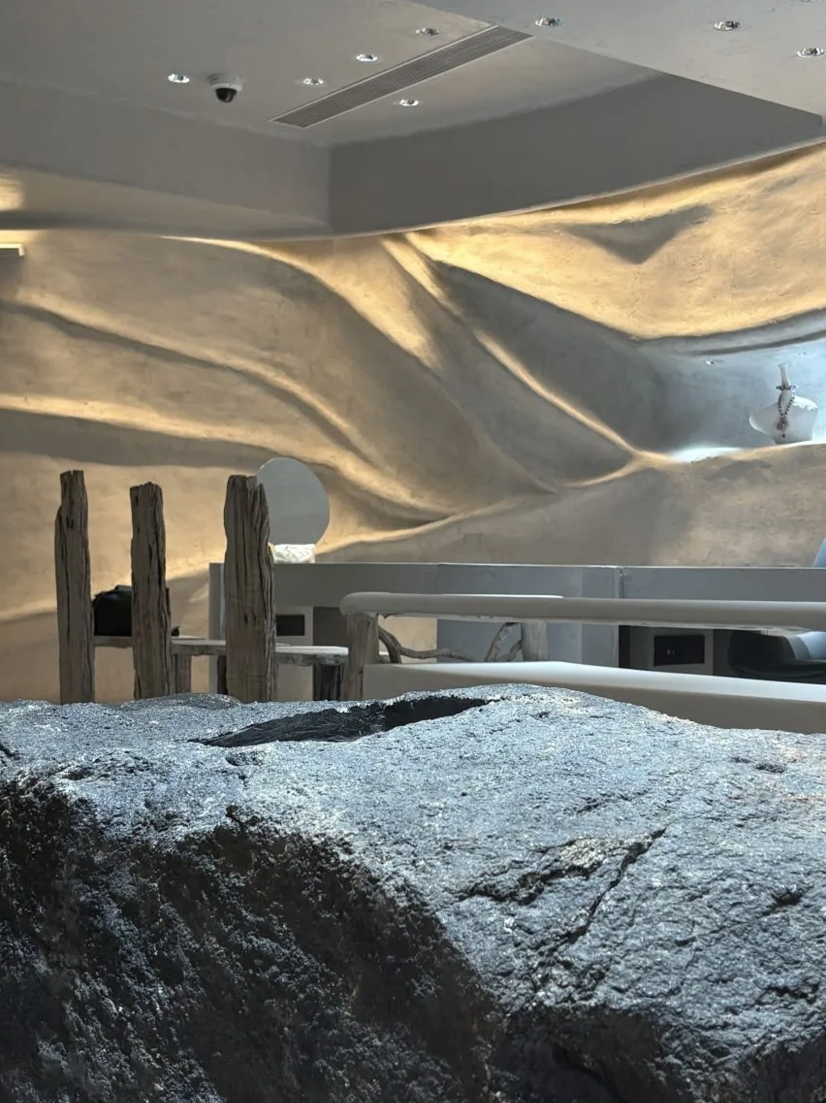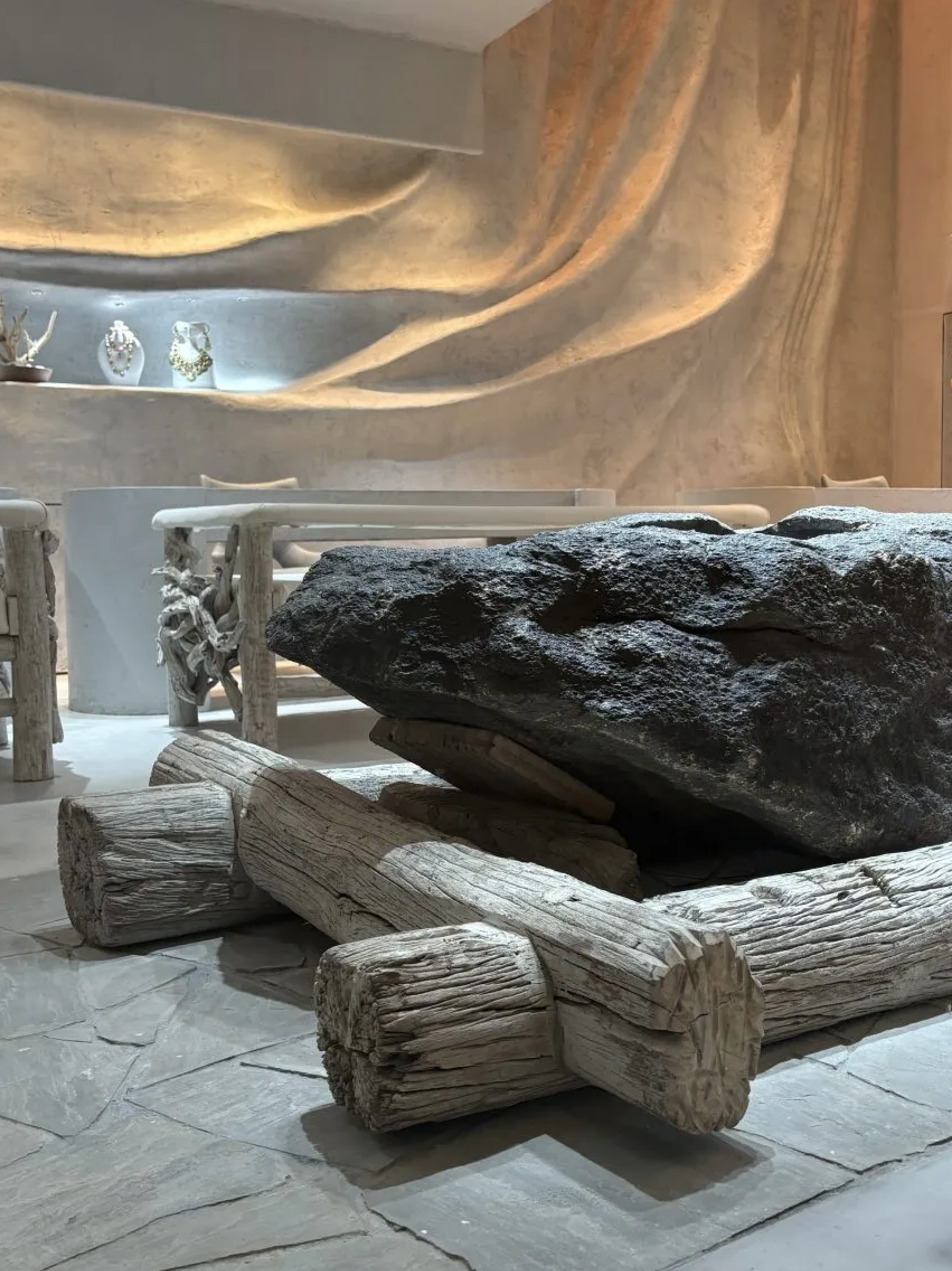 Естественные и подражающие естественным формы складываются в столы, шкафы и подиумы, предназначенные для хранения и выбора ювелирных изделий. За создание атмосферы роскоши среди этого бионически-экологического «царства» отвечают сложные многоуровневые люстры в стиле Мурано.