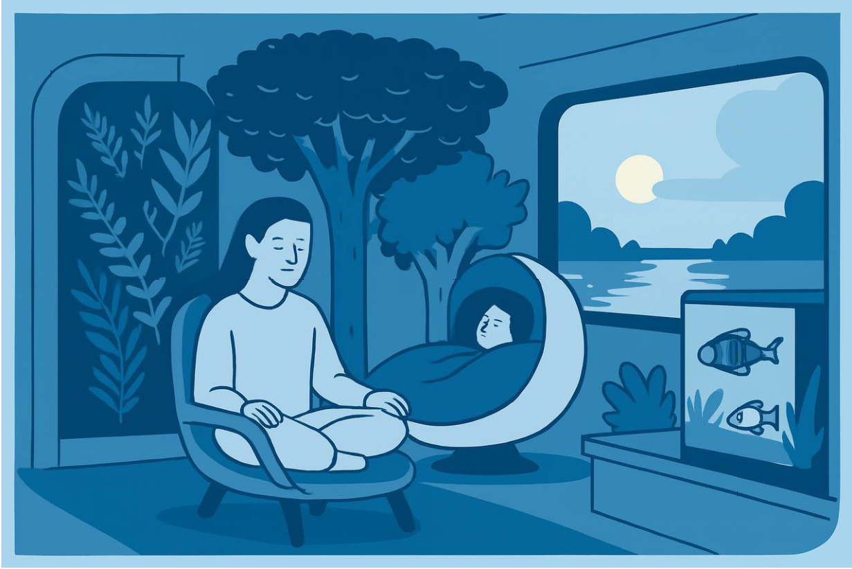 Как это выглядит: Вагоны с панорамными окнами, живыми растениями, «зелеными» стенами, аквариумами. Вместо громкого гудка – приглушенные звуки природы. Есть зоны для медитации с шумоподавлением, кресла-капсулы для короткого сна, массажные кресла, зоны с тренажерами для кистевого эспандера или легкой растяжки.