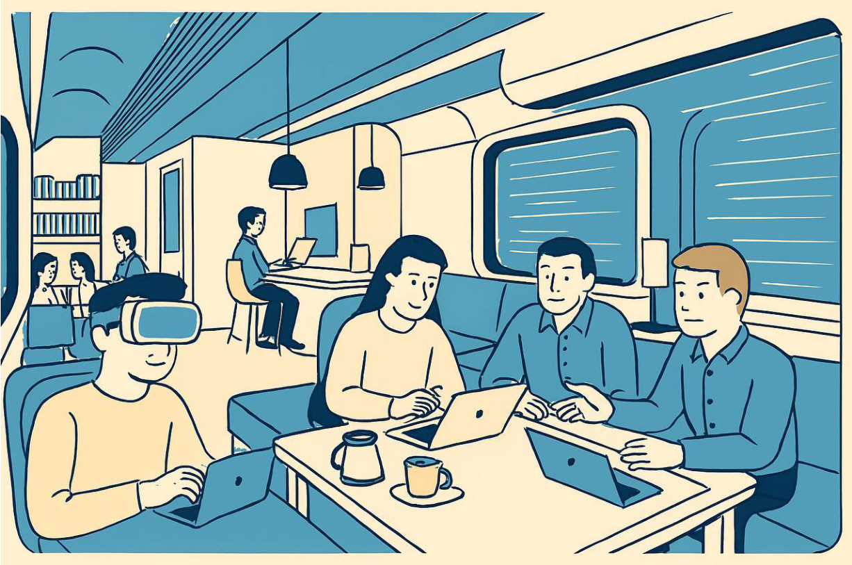 Как это выглядит: Вагоны, оборудованные интерактивными экранами, VR-шлемами, стендами для практических занятий. Маршруты или отдельные рейсы могут быть тематическими: «урок английского», «лекция по истории искусств», «мастер-класс по программированию».