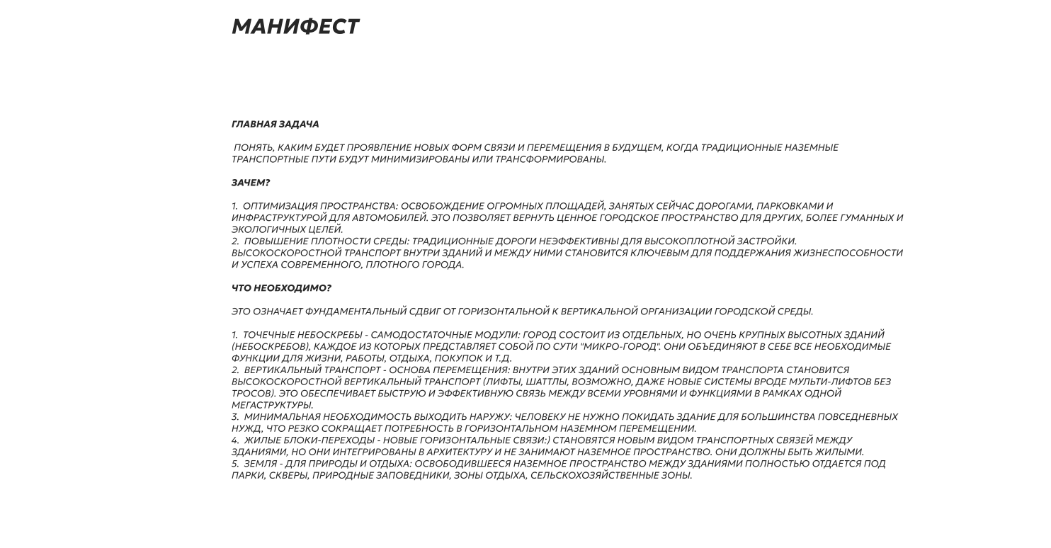Разработать комплекс идей – от прикладных до футуристических – способных изменить структуру городских транзитов. Исследовать возможности внедрения этих решений в разных временных горизонтах: сейчас, в ближайшем будущем, в долгосрочной перспективе.