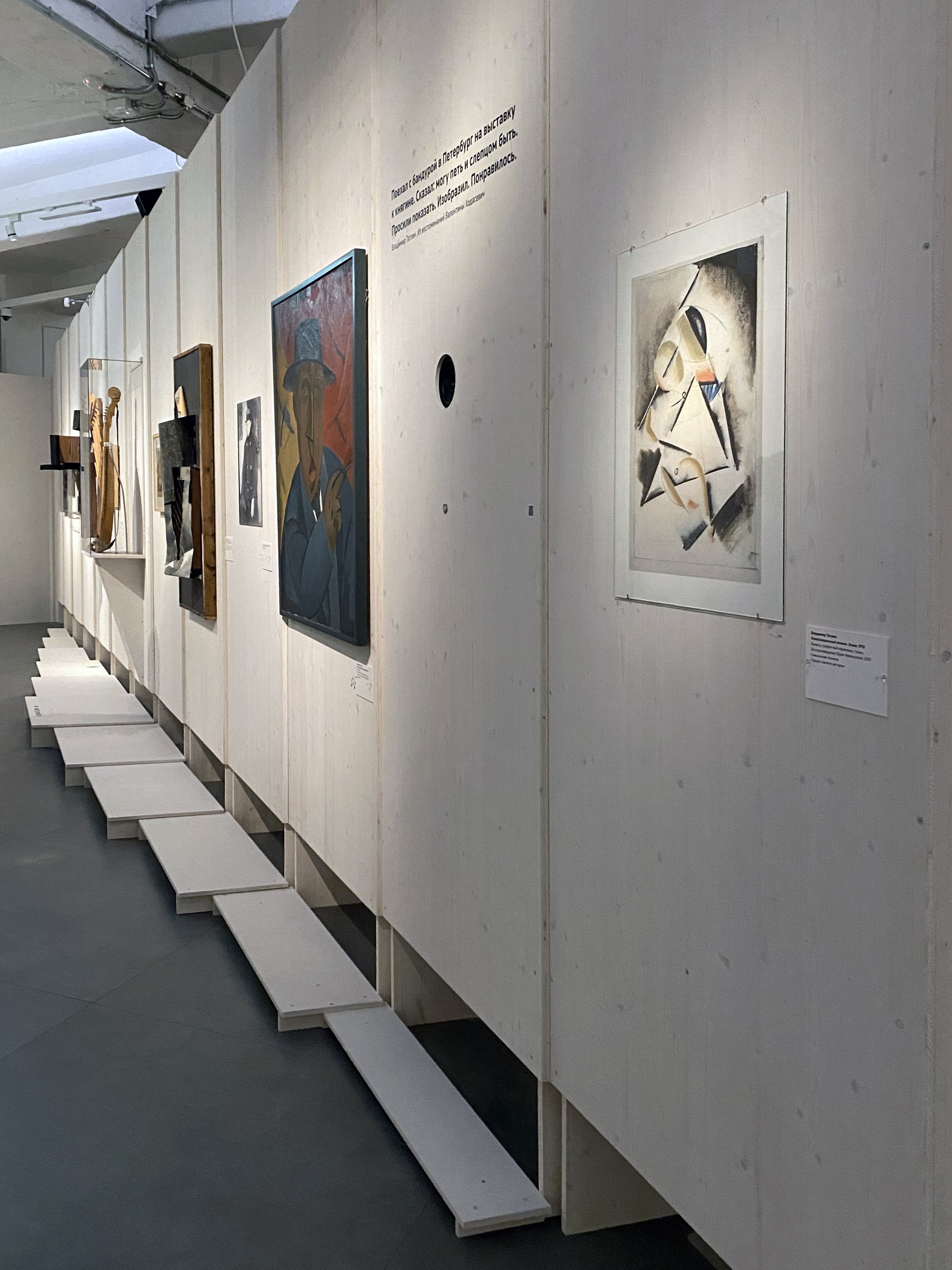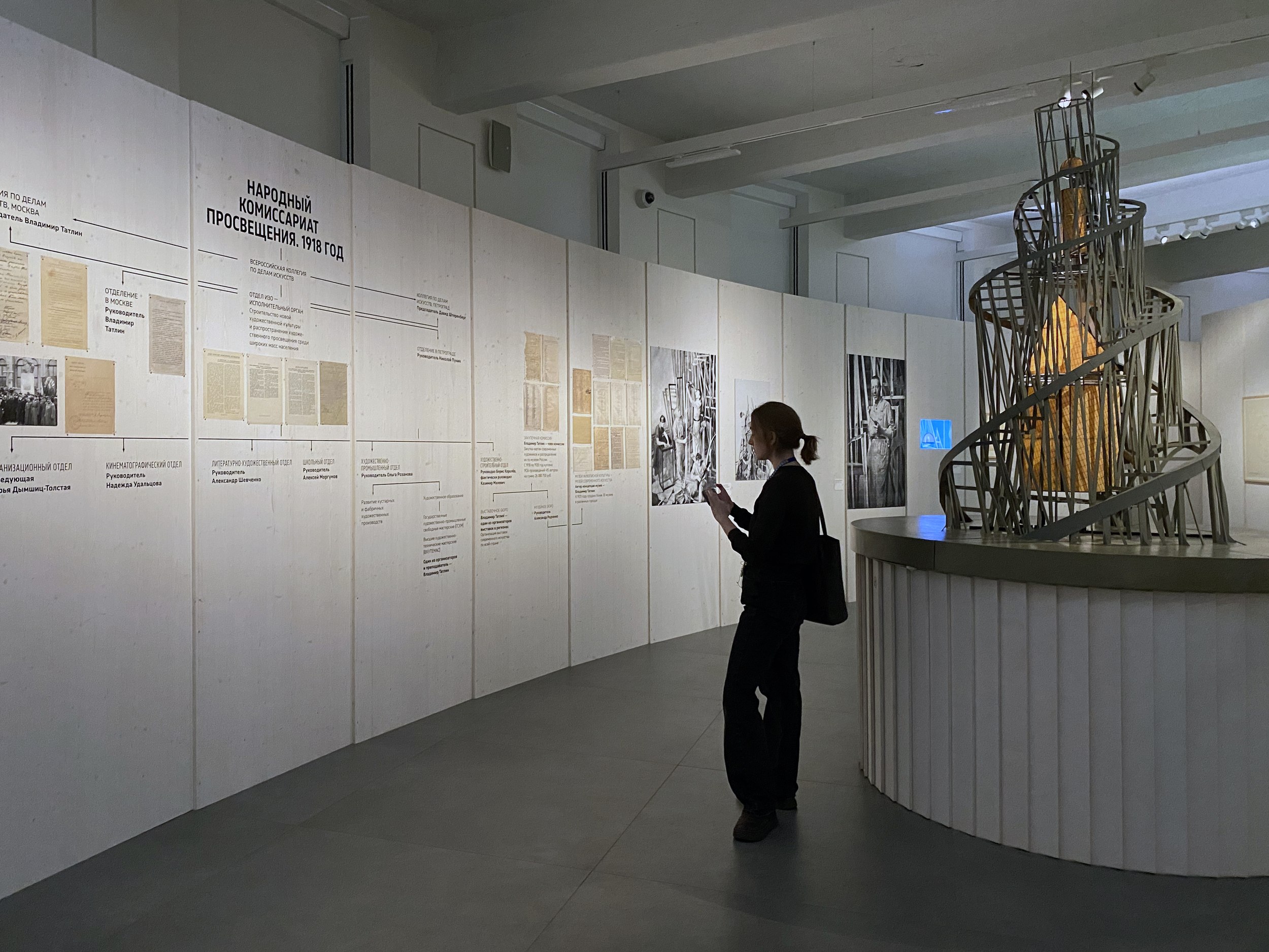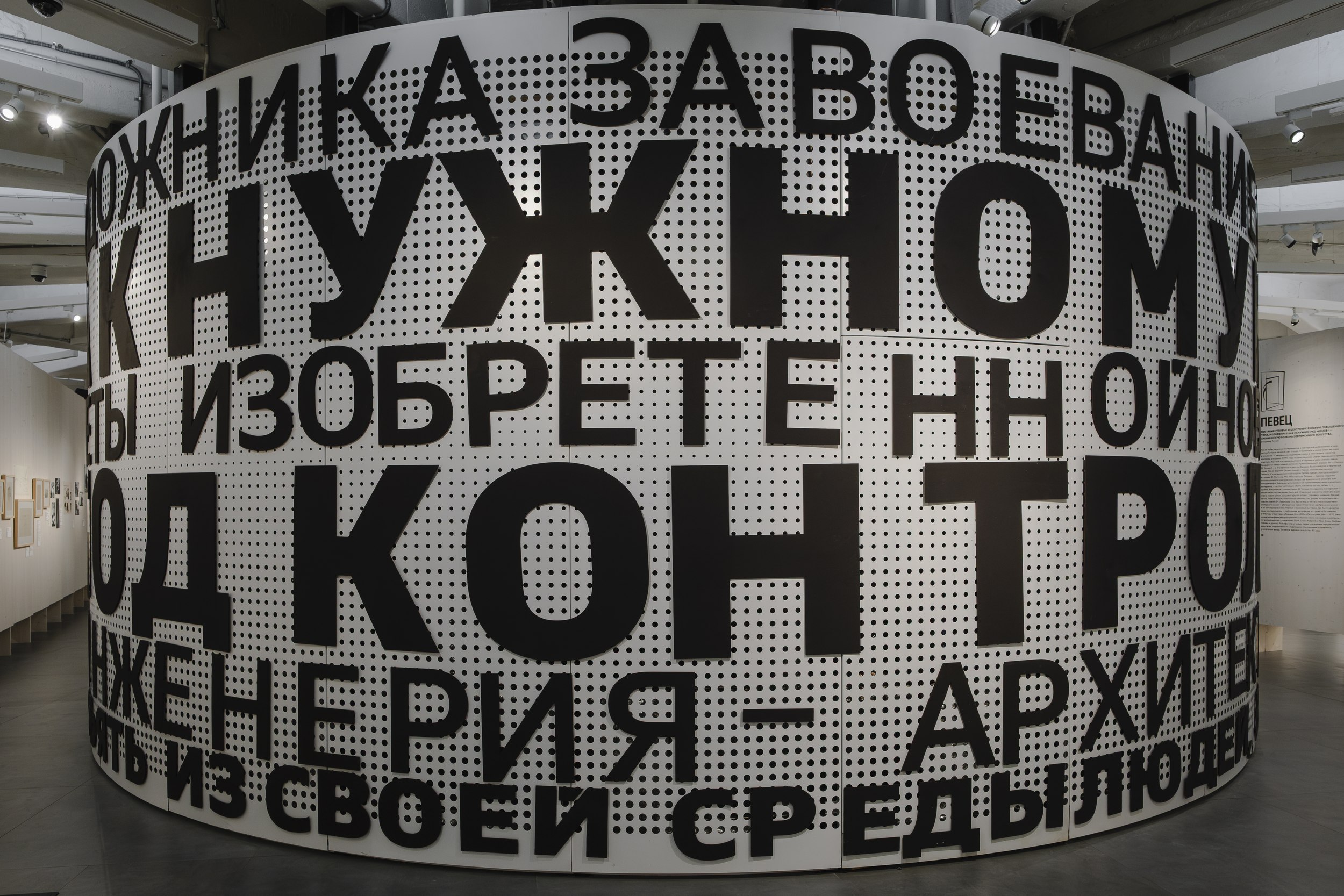 Интересно, что не только названия разделов помогают посетителям понять мир художника. Еще один текстовый элемент дизайна экспозиции неожиданно дает ключ к пониманию его роли в мировой культуре: расположенный в центре зала цилиндрический объем покрыт разноразмерными надписями – высказываниями и слоганами Владимира Евграфовича. Но планировка экспозиции и плотность застройки не позволяют практически ни из какой точки прочитать больше одного двух слов за раз. Таким образом, как бы ни стремился зритель познать идеи Татлина, они оказываются недоступны ему, выходя за границы его зрения, превосходя своим масштабом тот узкий ракурс восприятия, которым, к сожалению, обладали его современники и, видимо, обладаем мы сейчас, независимо от того, насколько мы информированы и открыты новациям.