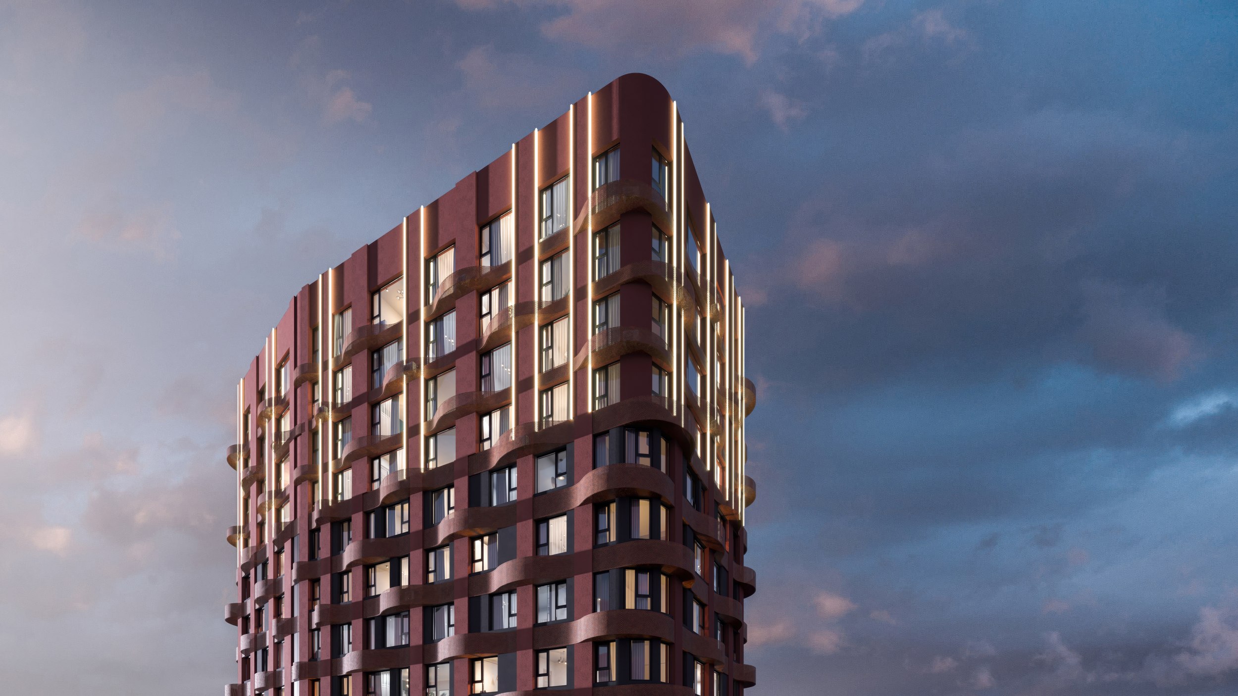 Башня на 29 этажей высотой около 100 метров – безусловная высотная доминанта, которая может претендовать и на статус акцентной. Для этого есть как минимум три предпосылки. Первая – упомянутый пластический прием на фасаде. Его усиливают ярусы: башня то сужается, то чуть раздувается, что заставляет объем слегка пульсировать, а ленты – колыхаться, словно от свежего ветра. Третье усложнение – легкий «излом» относительно центральной оси, который понадобился для улучшения инсоляции и видовых характеристик. Активную роль играет и архитектурная подсветка.