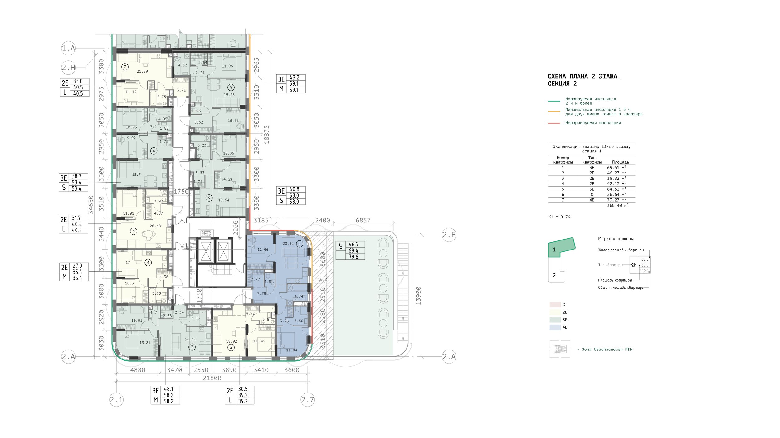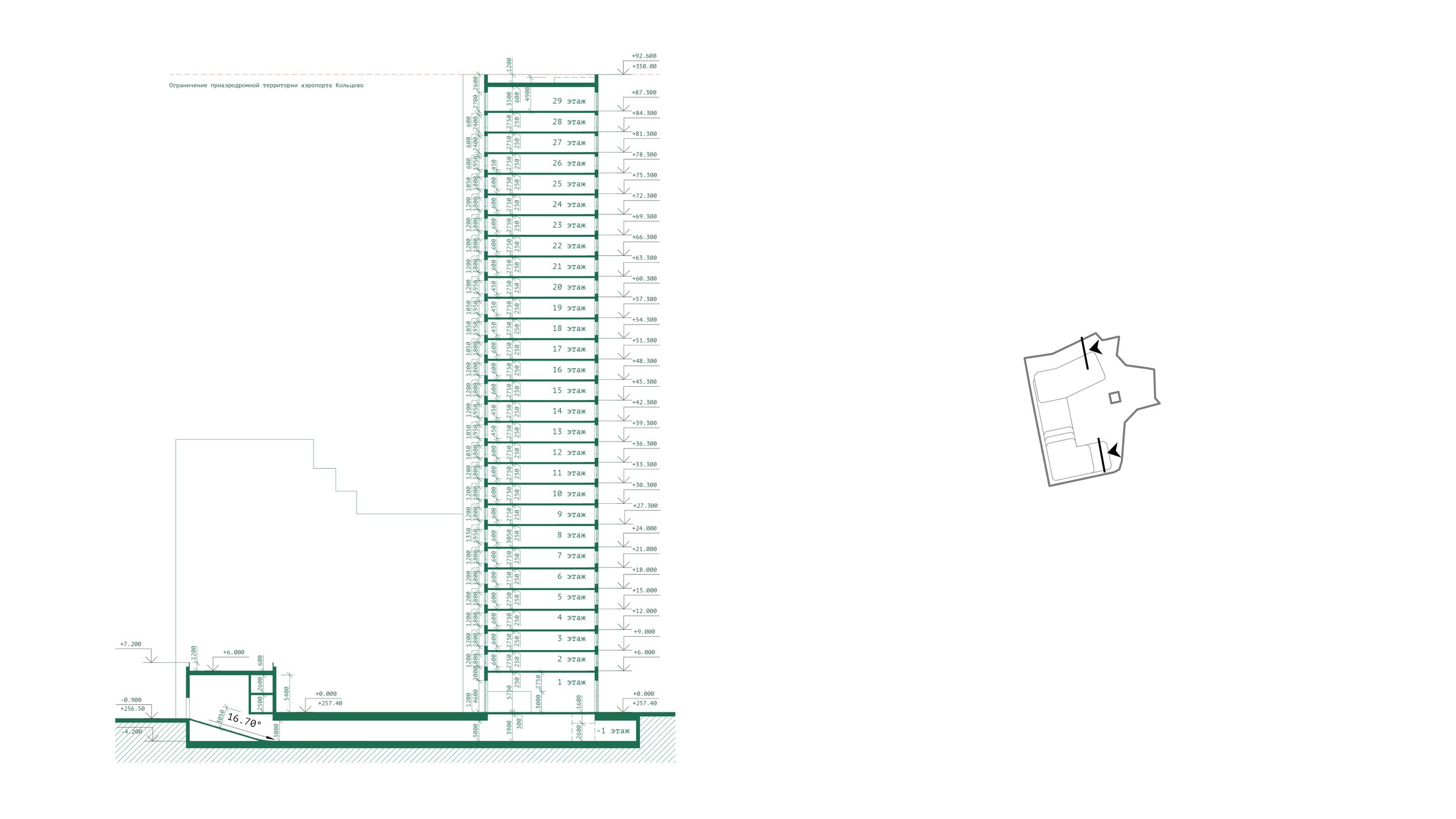 Такая посадка здания стала ответом на нормы инсоляции, а также желанием придать кварталу более четкие «городские» контуры. Террасированная секция фиксирует угол и поддерживает внутриквартальный проезд. Судя по рендерам застройщика, развитие участка не исключено, поэтому решение выглядит градостроительно оправданным. Отступ же от линии Восточной улицы снижает шумовое воздействие от автомобилей и позволяет не затеряться трехэтажному кирпичному зданию, которое было построено в 1927-1929 годах для рабочих ткацкой Ленинской фабрики.