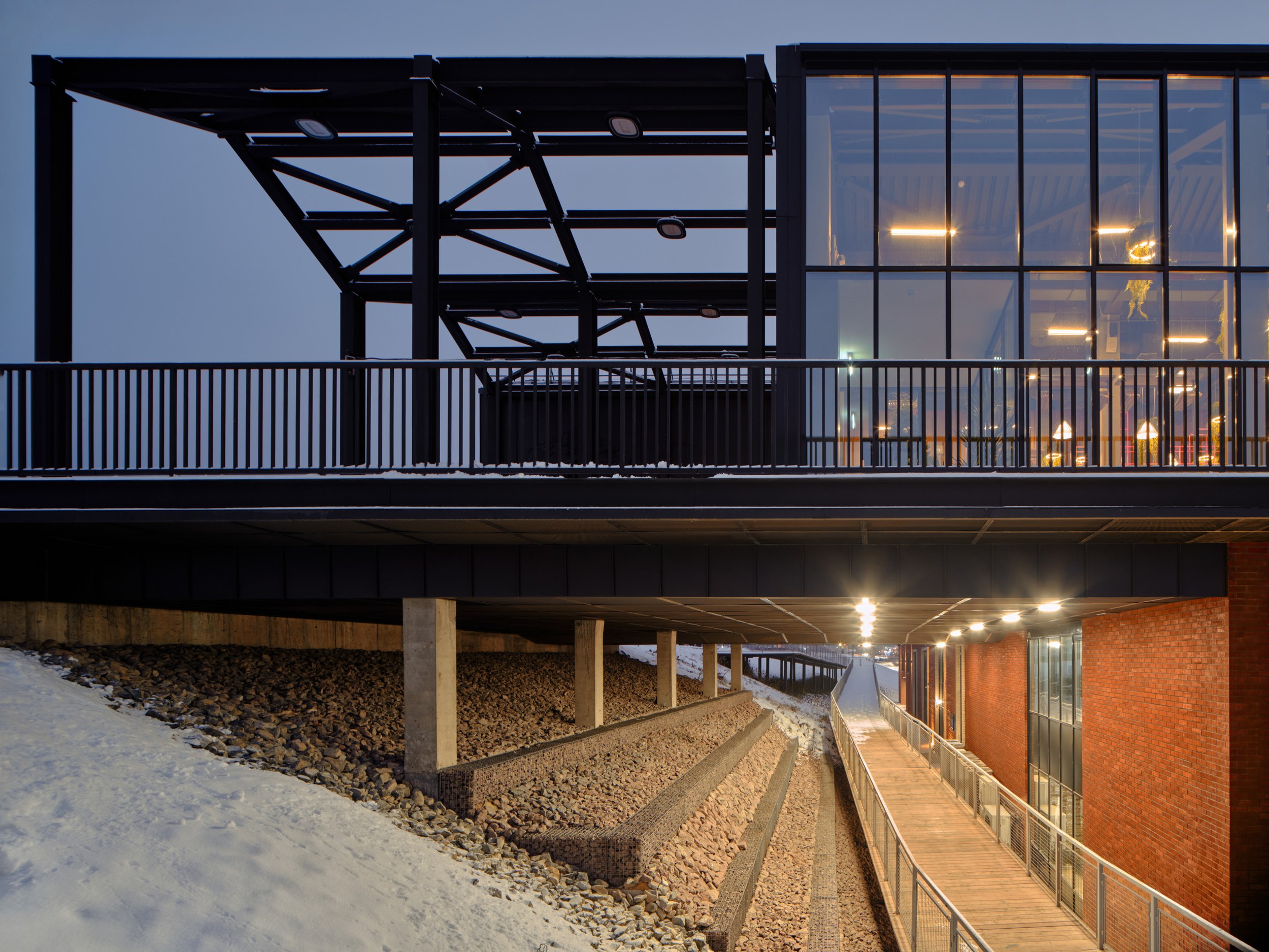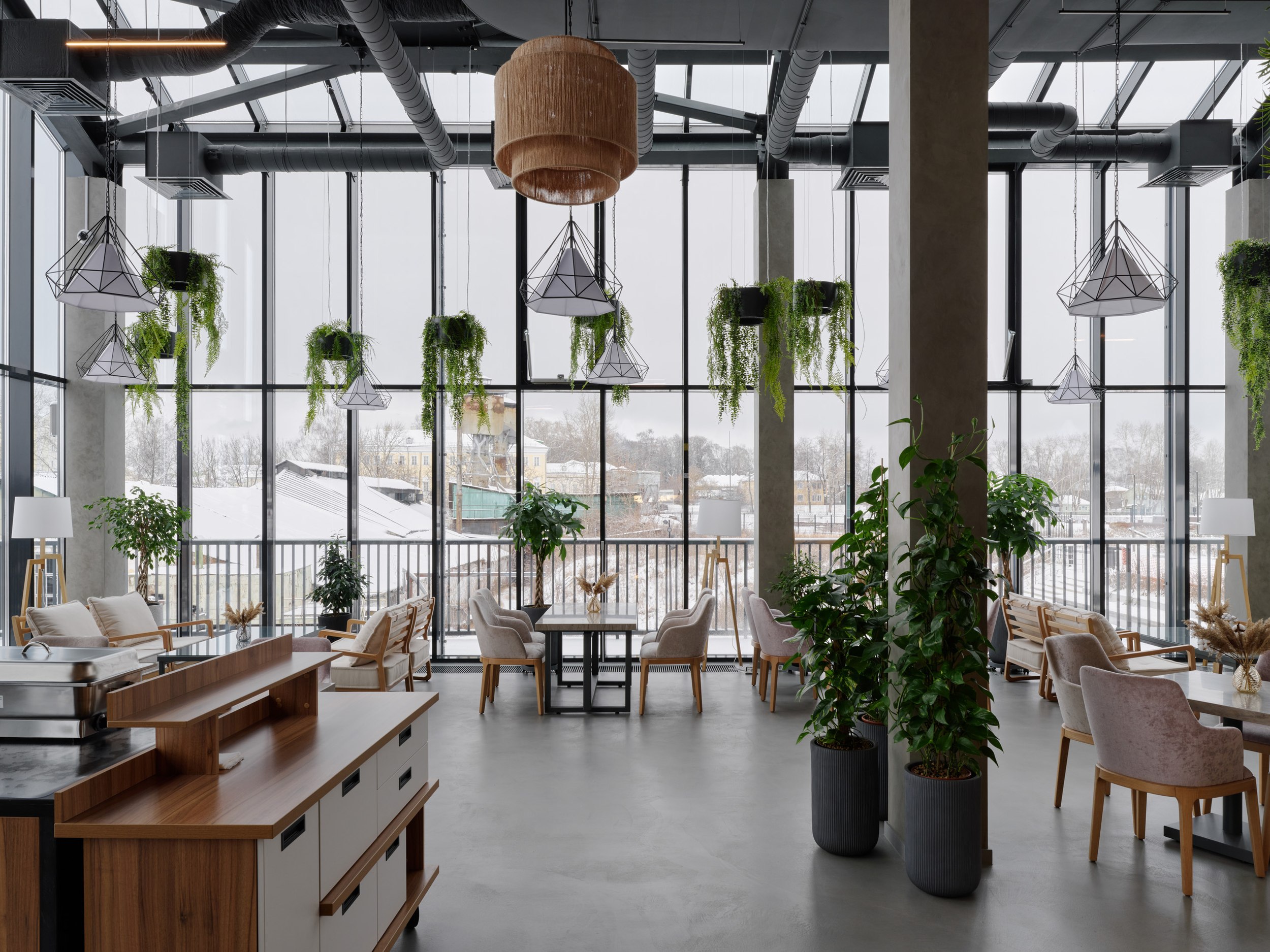 Ресторан работает и для гостей отеля, и для посетителей будущего парка. Панорамное остекление и перепад высот обеспечивают одни из лучших видов в Выксе: на пруд, набережную, Христо-Рождественскую церковь – с одной стороны, и на историческую заводскую территорию – с другой. Интерьер продолжает индустриальную тему: металл, бетон и стекло дополнены тёплым деревом и большим количеством зелени. Светильники опираются на тонкие металлические конструкции, барная стойка облицована металлом медного оттенка, над ней – выразительная алая металлоконструкция.