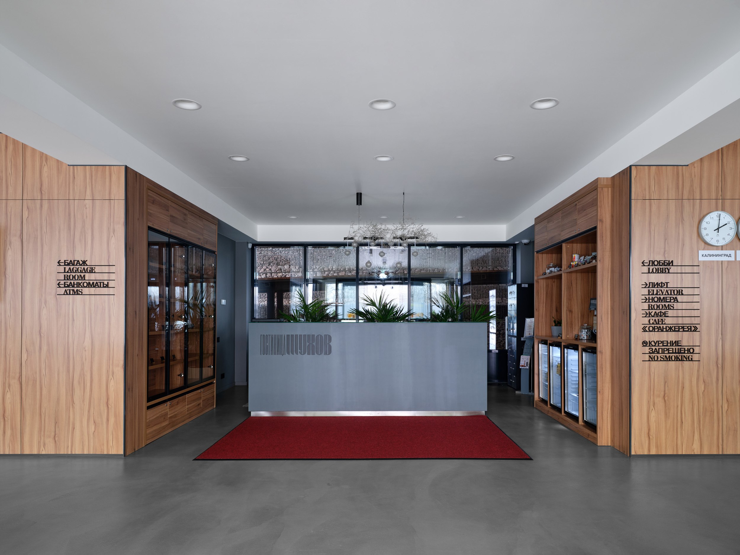 Лобби на первом этаже открытое и симметричное. В центре расположена бетонная стойка с надписью «Гостиница Шухов», за которой находится прозрачная перегородка, отделяющая рабочую зону отеля. По одну сторону размещена библиотека, по другую – подвесной биокамин. Отсюда лестница и лифт ведут на уровень ресторана.