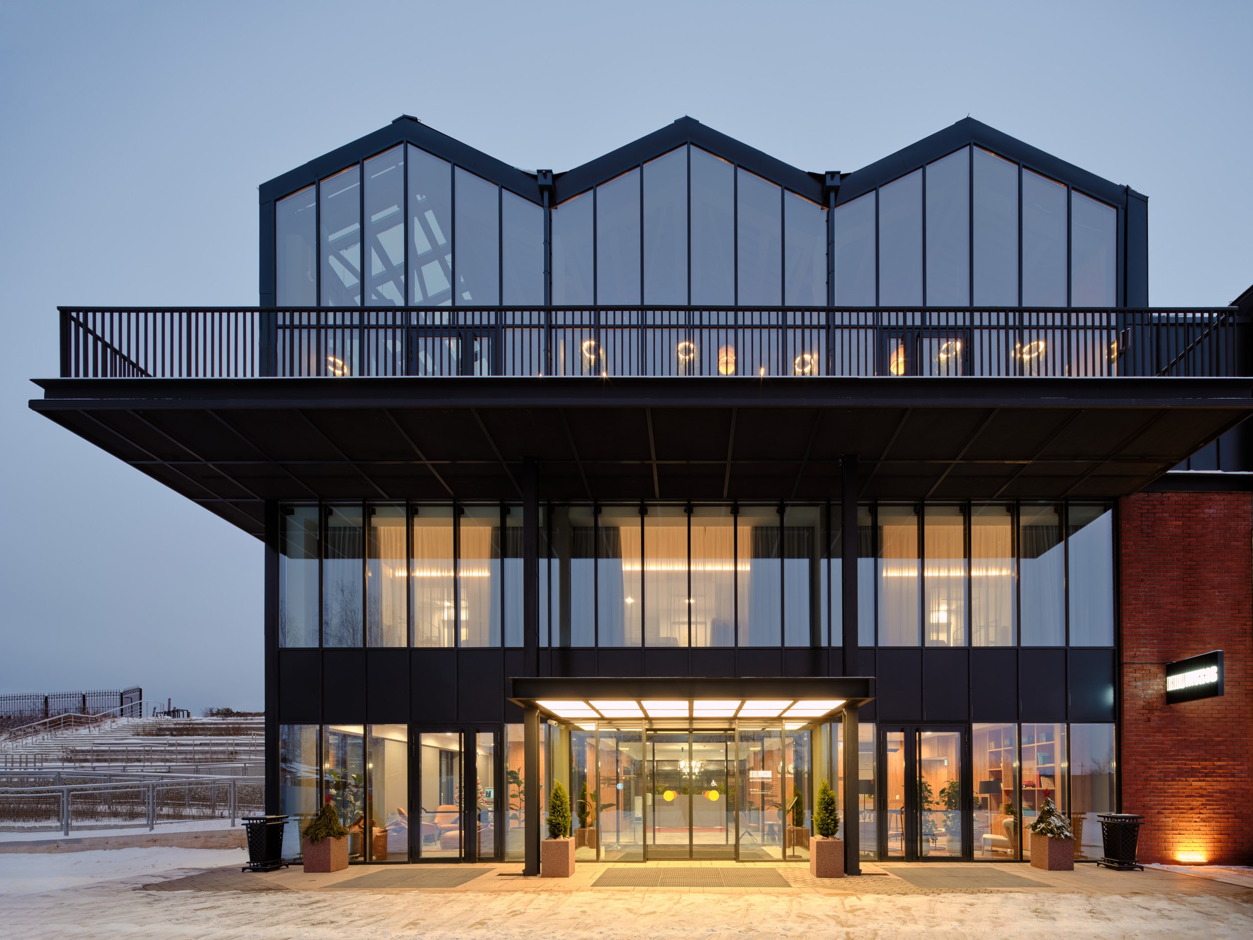 Отель состоит из двух соединенных объёмов: протяжённого кирпичного блока с 48 номерами и стеклянно-металлического блока с общественными пространствами. На первом уровне последнего расположены ресепшн и лобби, на третьем – большое кафе, которое благодаря перепаду высот выходит прямо на уровень набережной. Со стороны променада кафе выглядит как лёгкая стеклянная оранжерея. Архитекторы подчеркнули эстетику металлических конструкций, создав перед входом ажурный навес. Образ оранжереи неслучаен: кафе носит одноимённое название и отсылает к знаменитым выксунским теплицам XIX века. Вечером стеклянный объём светится, становясь архитектурным маяком на набережной и в парке.