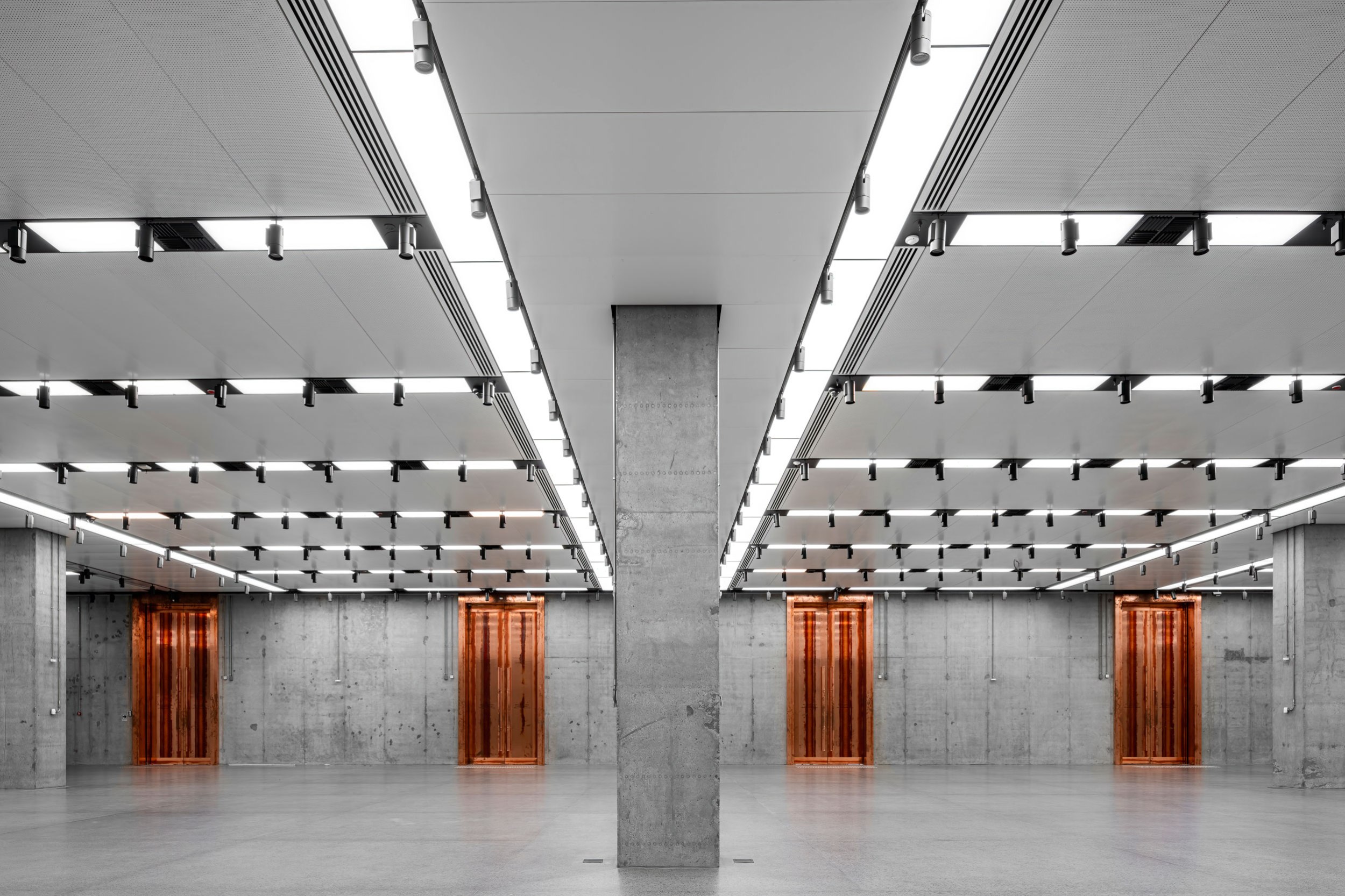 Еще одна особенность – достаточно редкие и не обремененные избыточной толщиной, благо здание не очень высокое, всего 37 метров – опоры. Хоть и квадратные, что объясняется подчеркнуто черновой сутью пространства, но не большие.