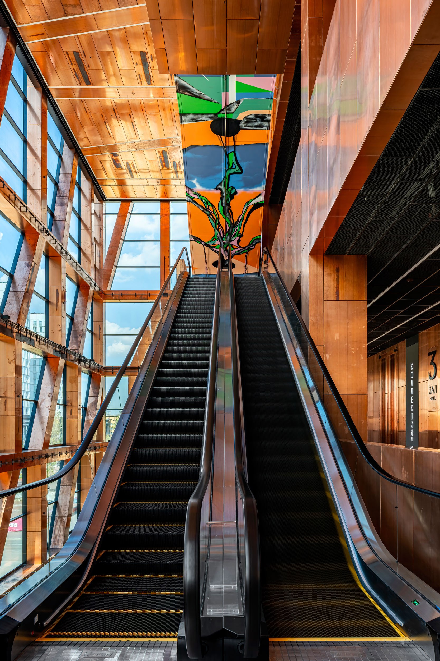 Зато когда мы попадаем внутрь – все радикально меняется. Становится ясно, что ленты не плоские, а очень даже объемные, квадратные в сечении; что сетка – реальная, конструктивная, «держит» весь атриум 35-метровой высоты. Когда сидишь внутри, к примеру на презентации, хочется ее сравнить с клеткой Фарадея, потому что медная.