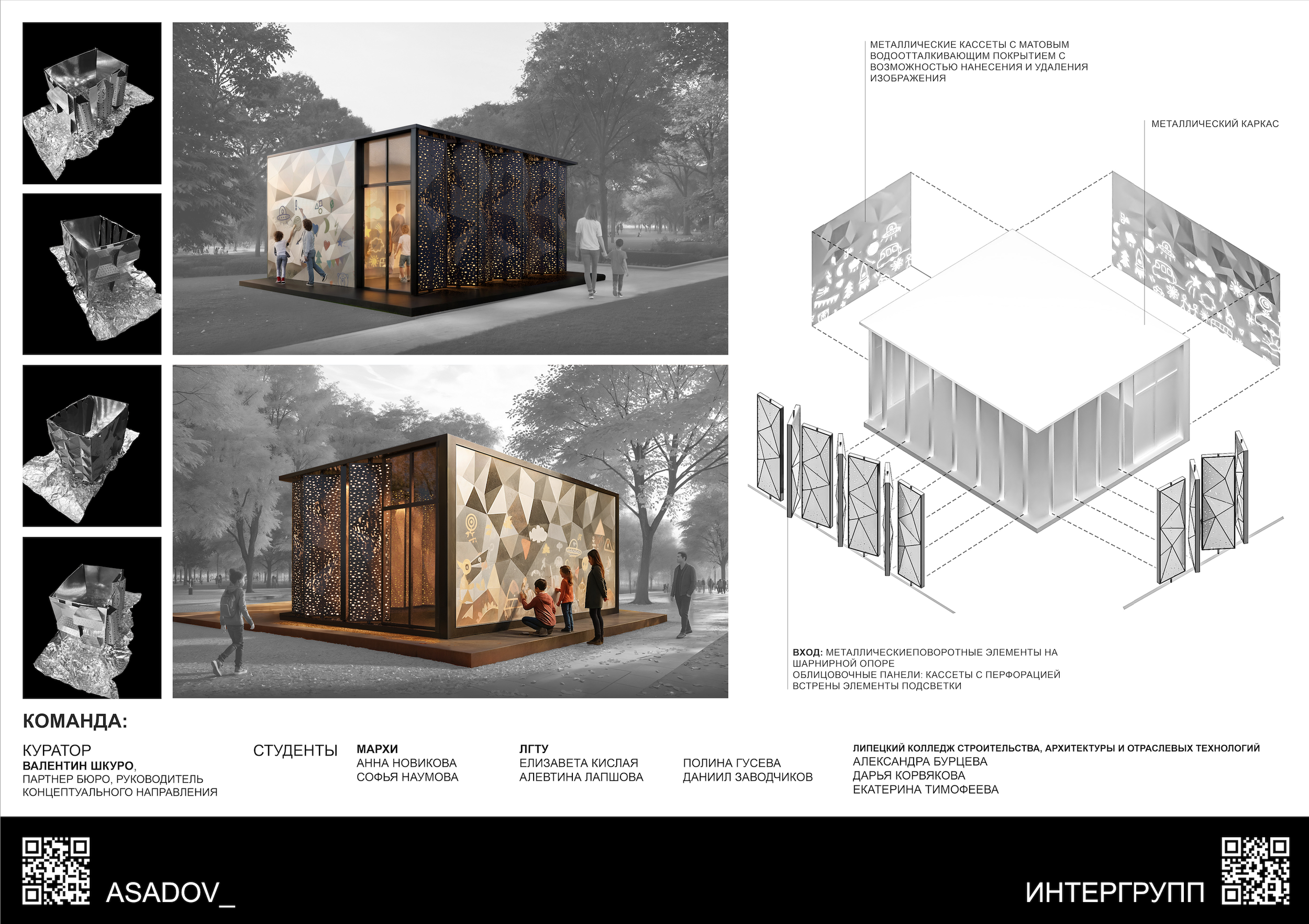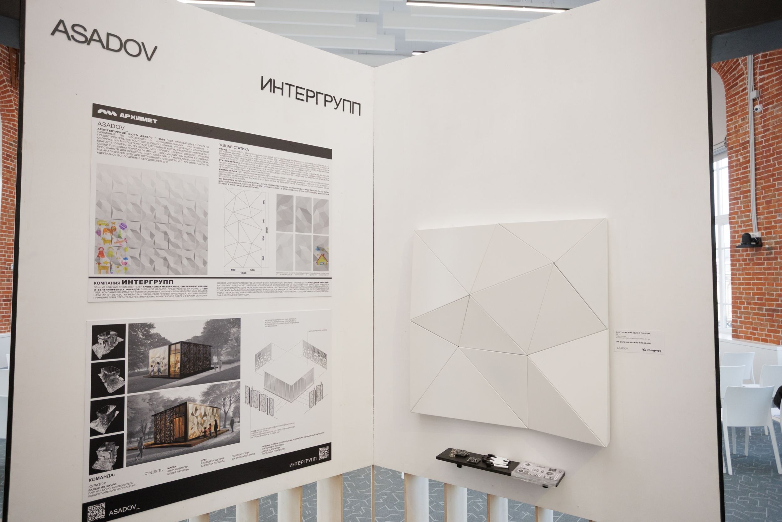 ASADOV + «Интергрупп»Взяв за основу принцип «дети должны иметь возможность самовыражаться», команда бюро ASADOV, а также студенты Московского архитектурного института и Липецкого государственного технического университета разработали трехмерные гнутые панели со специальным финишным покрытием с возможностью нанесения и быстрого удаления изображений. Такие панели могут использоваться как в детских образовательных учреждениях, так и в парковой архитектуре, где важен антивандальный компонент.