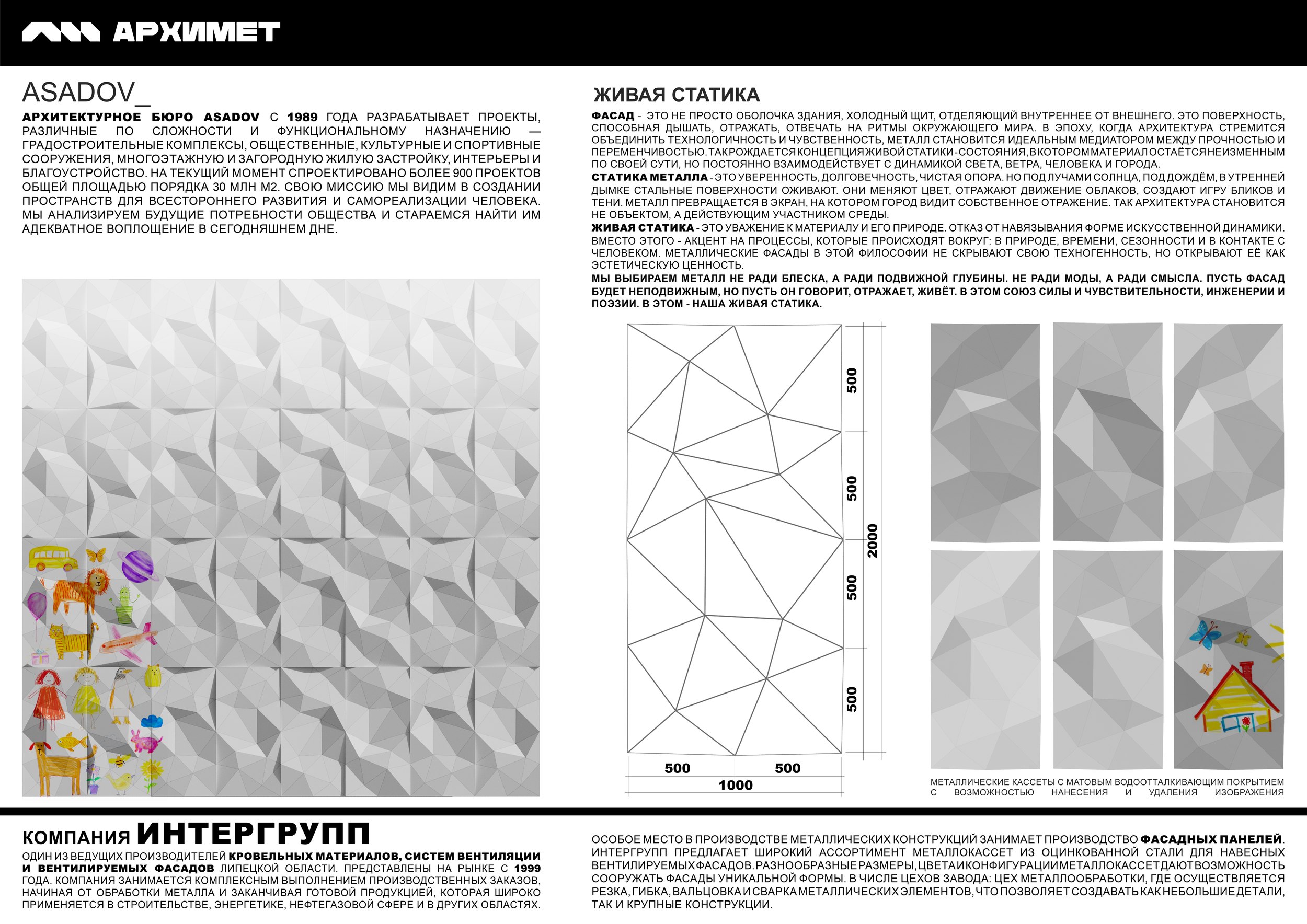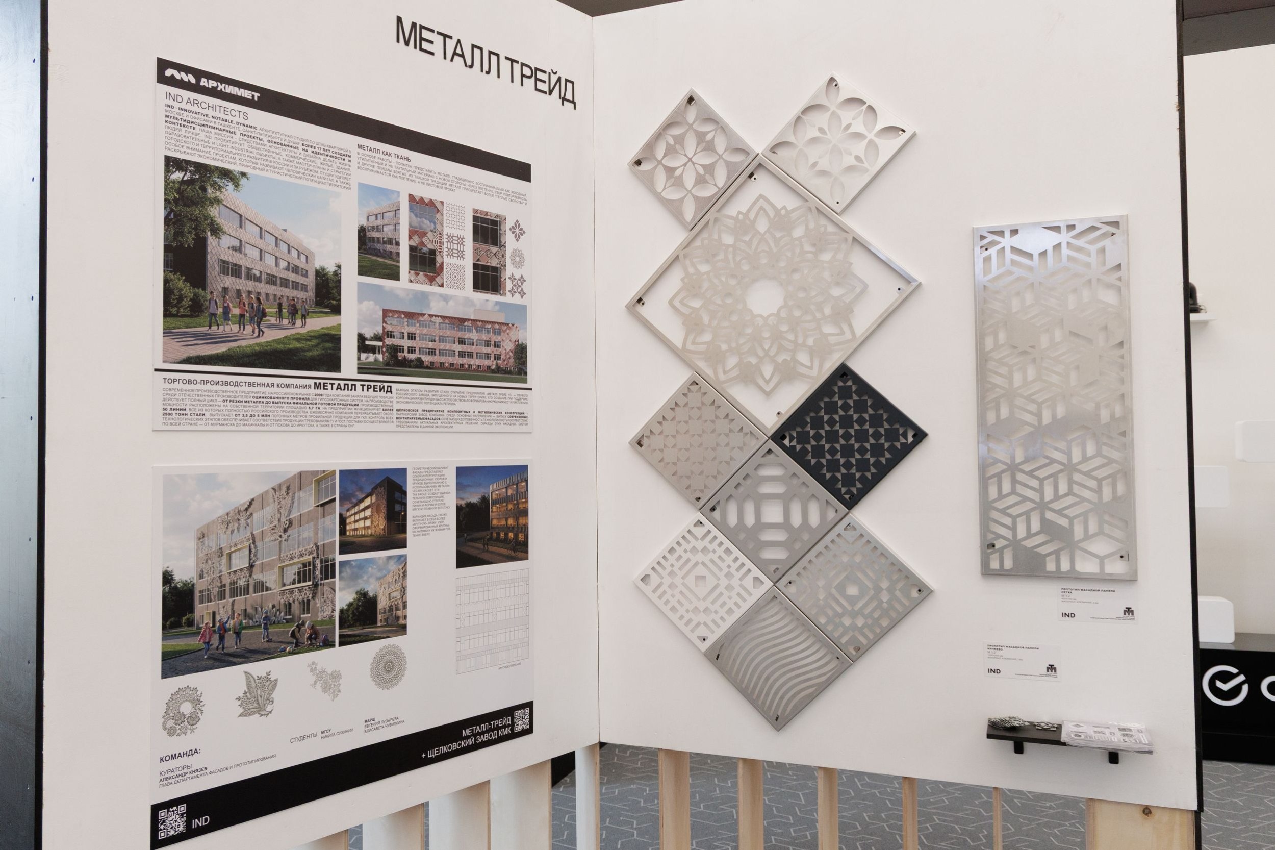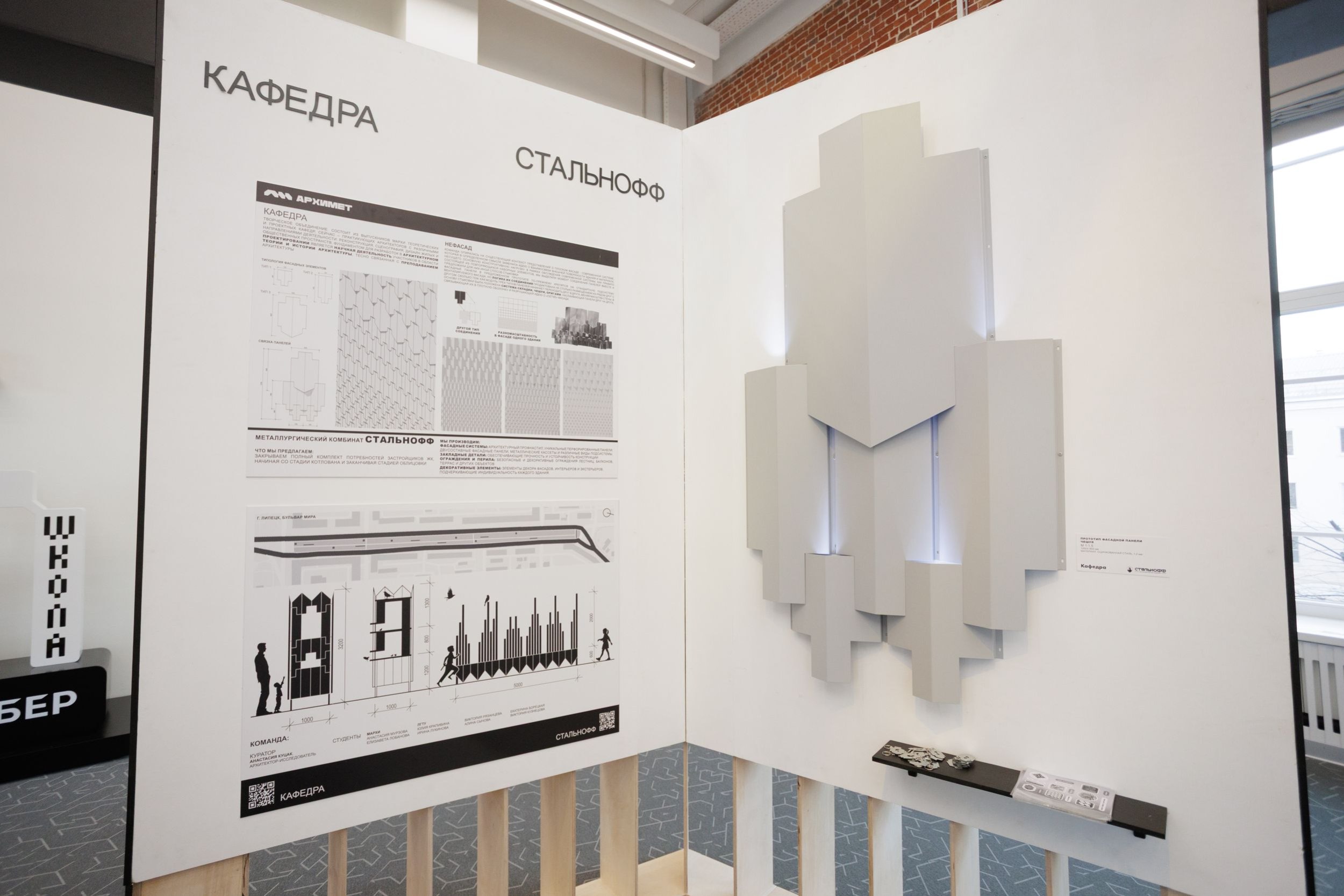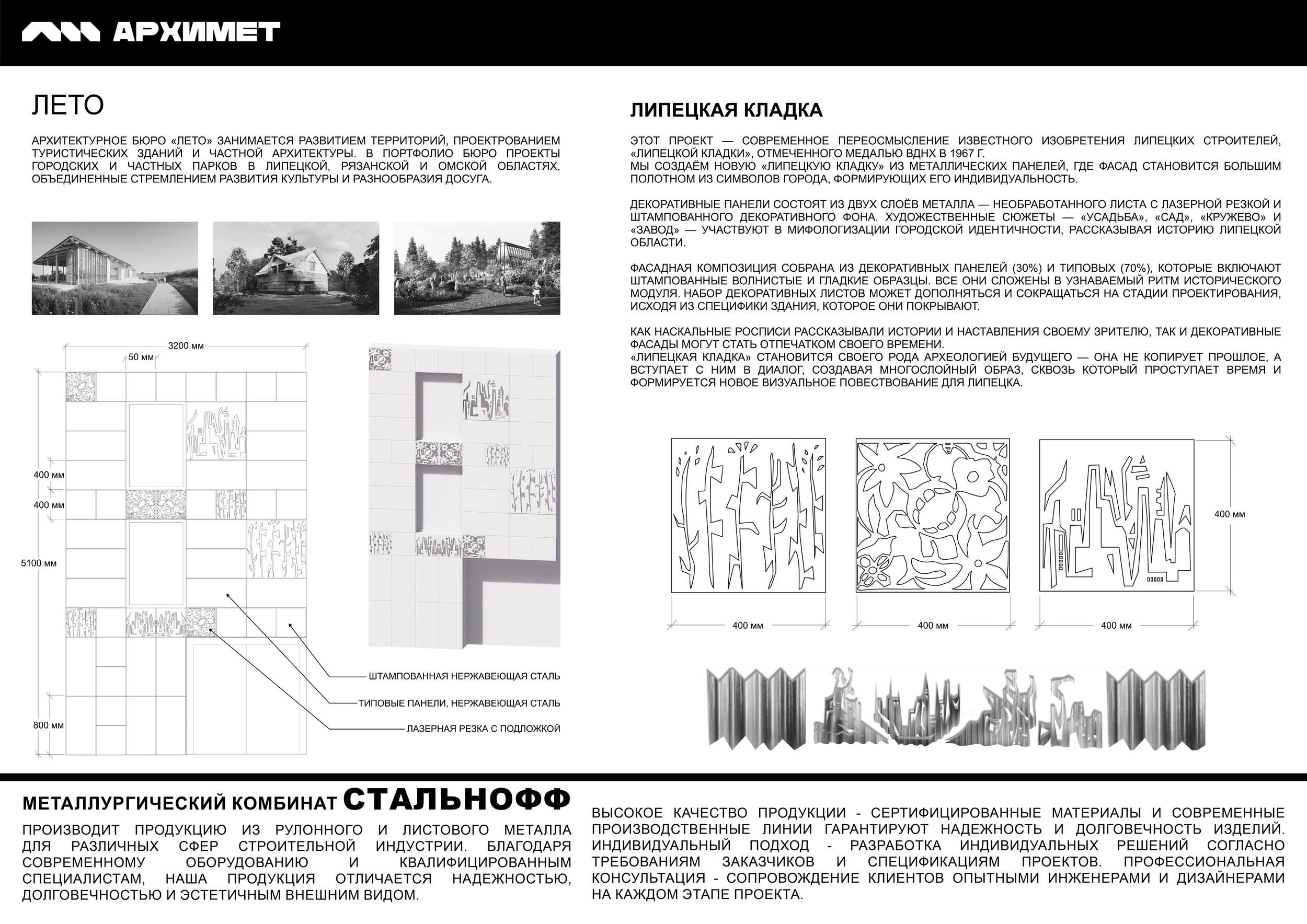 Осенью 2025 года в Липецке, в пространстве галереи «Буксир», прошла креативная лаборатория «АРХИМЕТ», в которой, кроме основных архитектурных бюро, подключилась команда студентов архитектурных факультетов, в том числе Московского архитектурного института, и школьники из Городской архитектурной мастерской Липецка. Вместе с представителями предприятий участники экспериментировали с различными вариациями фасадных панелей и одновременно разрабатывали способы их инсталляции в системы навесных фасадов и, в качестве дополнительной опции, применения панелей для возведения небольших парковых павильонов и малых архитектурных форм.