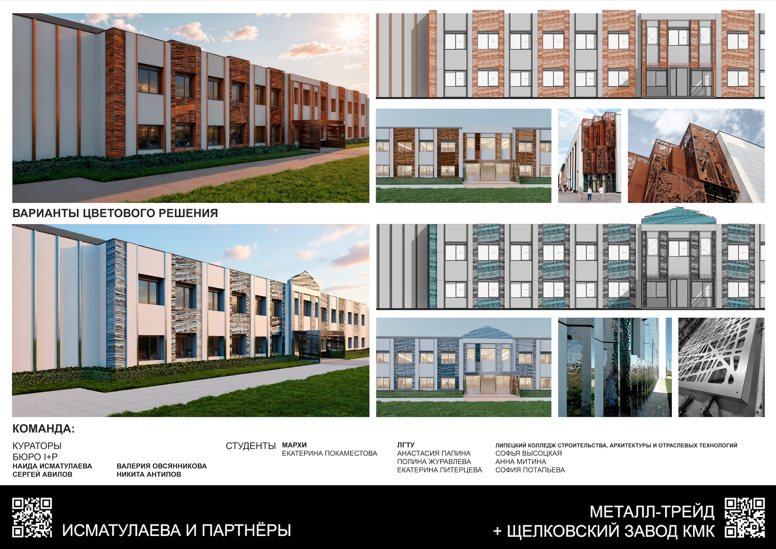 «Исматулаева и партнеры» + «Металл Трейд»Бюро Наиды Исматулаевой вместе со студентами Московского архитектурного института, Липецкого государственного технического университета и Липецкого колледжа строительства, архитектуры и отраслевых технологий сфокусировалось на способах сохранения характера изначального здания и предложило использовать прорезанные лазером панели, которые оставляют возможность видеть старый фасад. При этом авторы предложили разные комбинации из типовых и декоративных панелей.