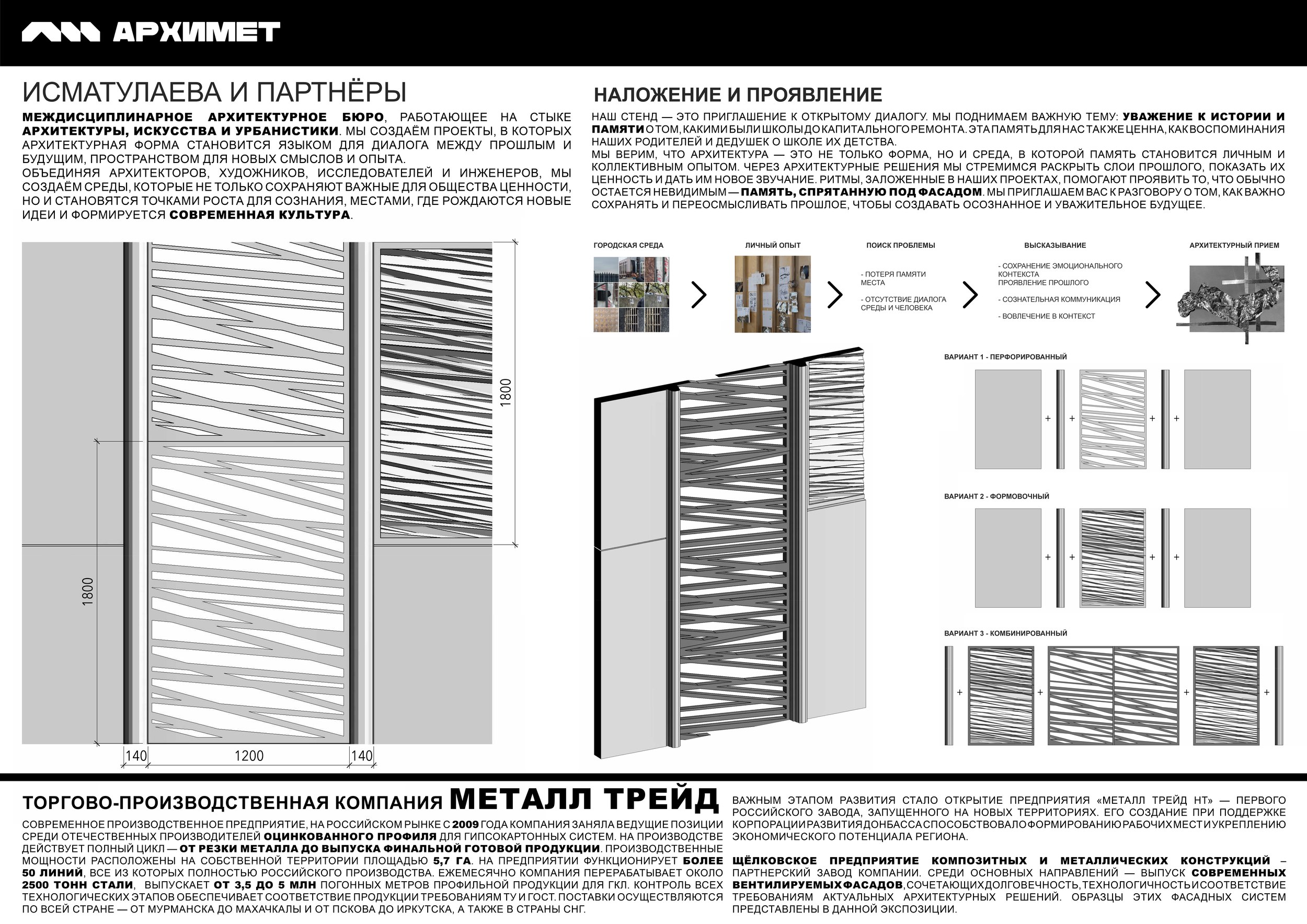«Нам необходимо было выстроить систему сотрудничества с анализом материала и возможностью для архитектора передавать заводу свои пожелания и задачи. «АРХИМЕТ» стал бесценным опытом коммуникации архитектурных бюро с липецкими производителями. Представители металлургии услышали пожелания креативных специалистов и поняли, каким образом выстраивать диалог с московскими бюро. Важно, чтобы изобретенное архитектурное изделие не отправилось «на полку», а появилось в реальной городской среде и при этом позитивно повлияло на место. Производители со своей стороны надеялись заполучить идею, которая перерастет в коммерчески выгодный продукт. Запросы были на изделие, которое было бы простым в изготовлении, но при этом современным и красивым. При этом за счет дизайна такие панели выделяются из продукции других заводов, их готовы выбирать заказчики, они подходят для реализации как коммерческих, так и государственных проектов за счет себестоимости».