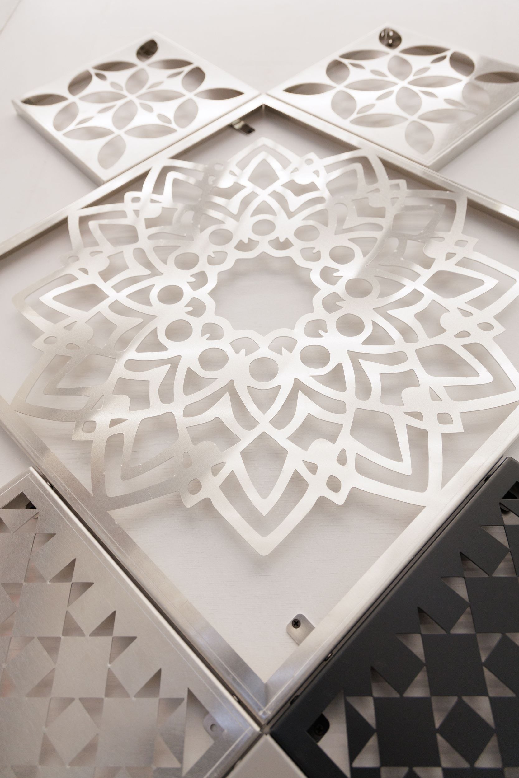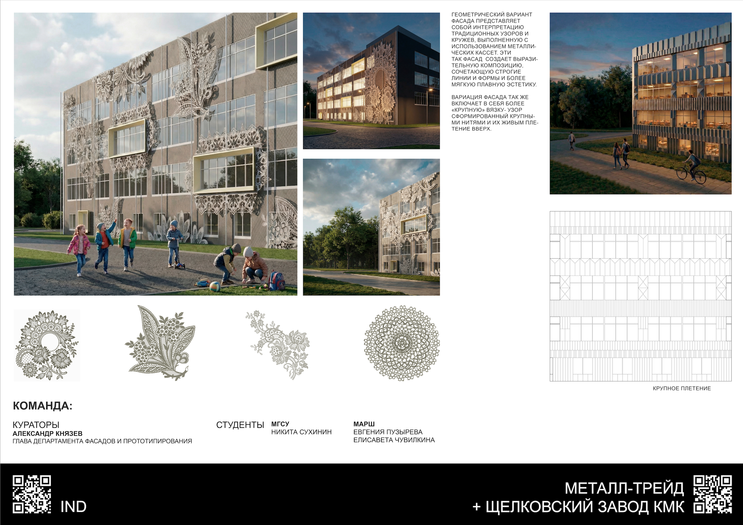 IND Architects + «Металл Трейд»В основу идеи положены мотивы традиционного для Липецкой области вида декоративно-прикладного искусства – кружева, известного в Ельце с конца XVIII века. Для изготовления панелей используется лазерная резка, при помощи которой в металле прорезаются различные орнаменты и паттерны. Команда из куратора Александра Князева, главы департамента фасадов и прототипирования IND Architects, студентов Национального исследовательского Московского государственного строительного университета и архитектурной школы МАРШ предложила использовать орнаментальные панели для обрамления оконных проемов и для декоративных вставок в навесные фасады.