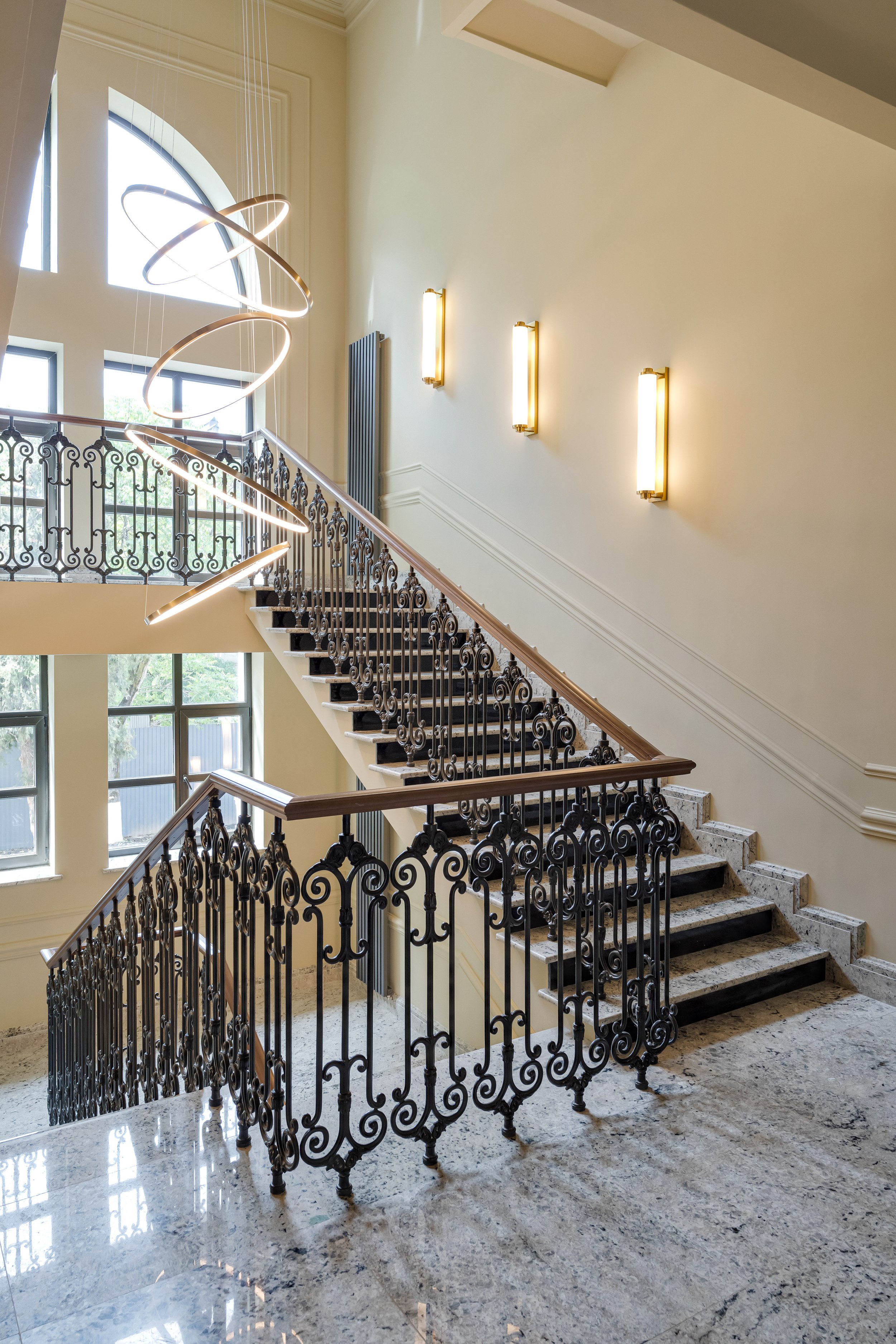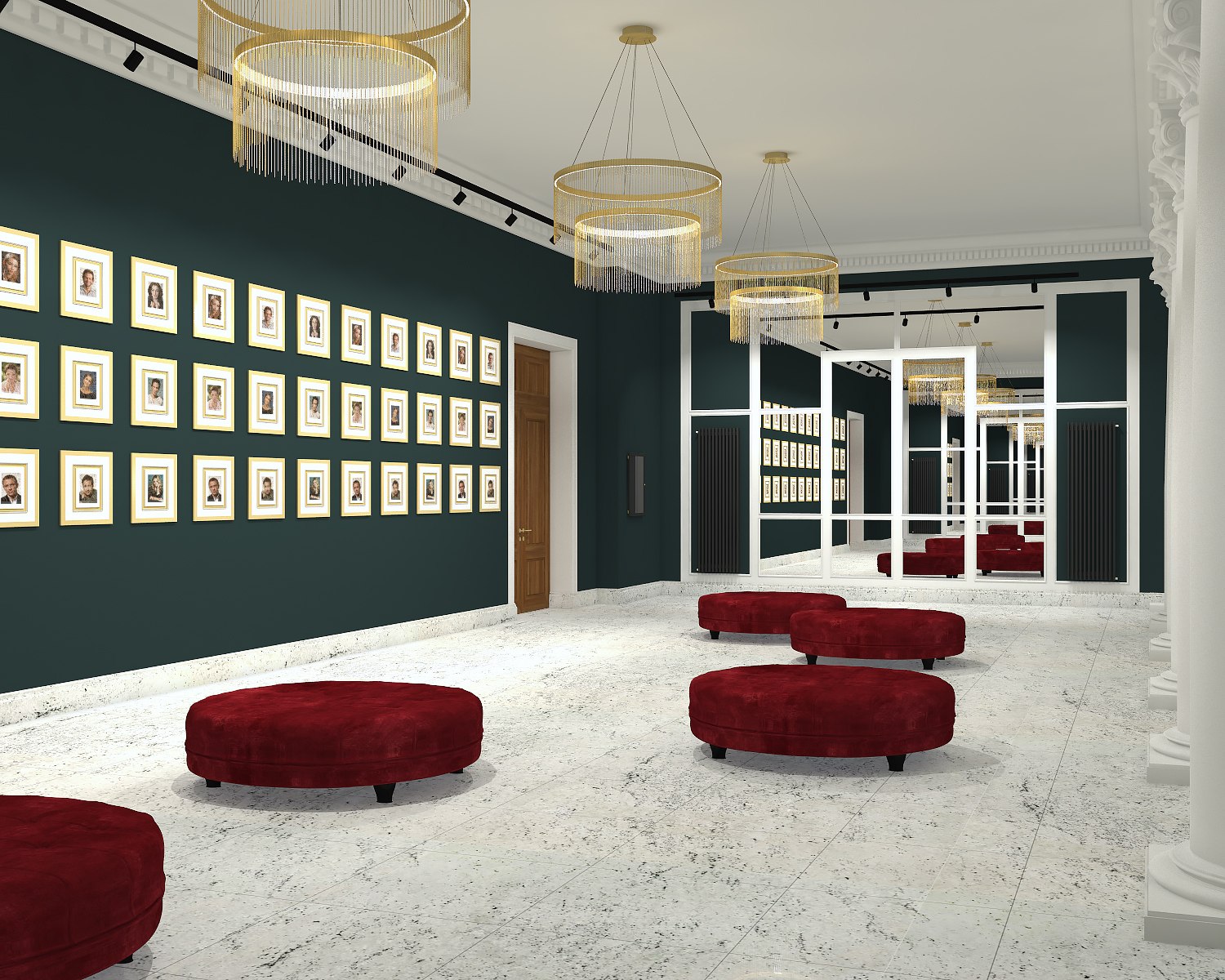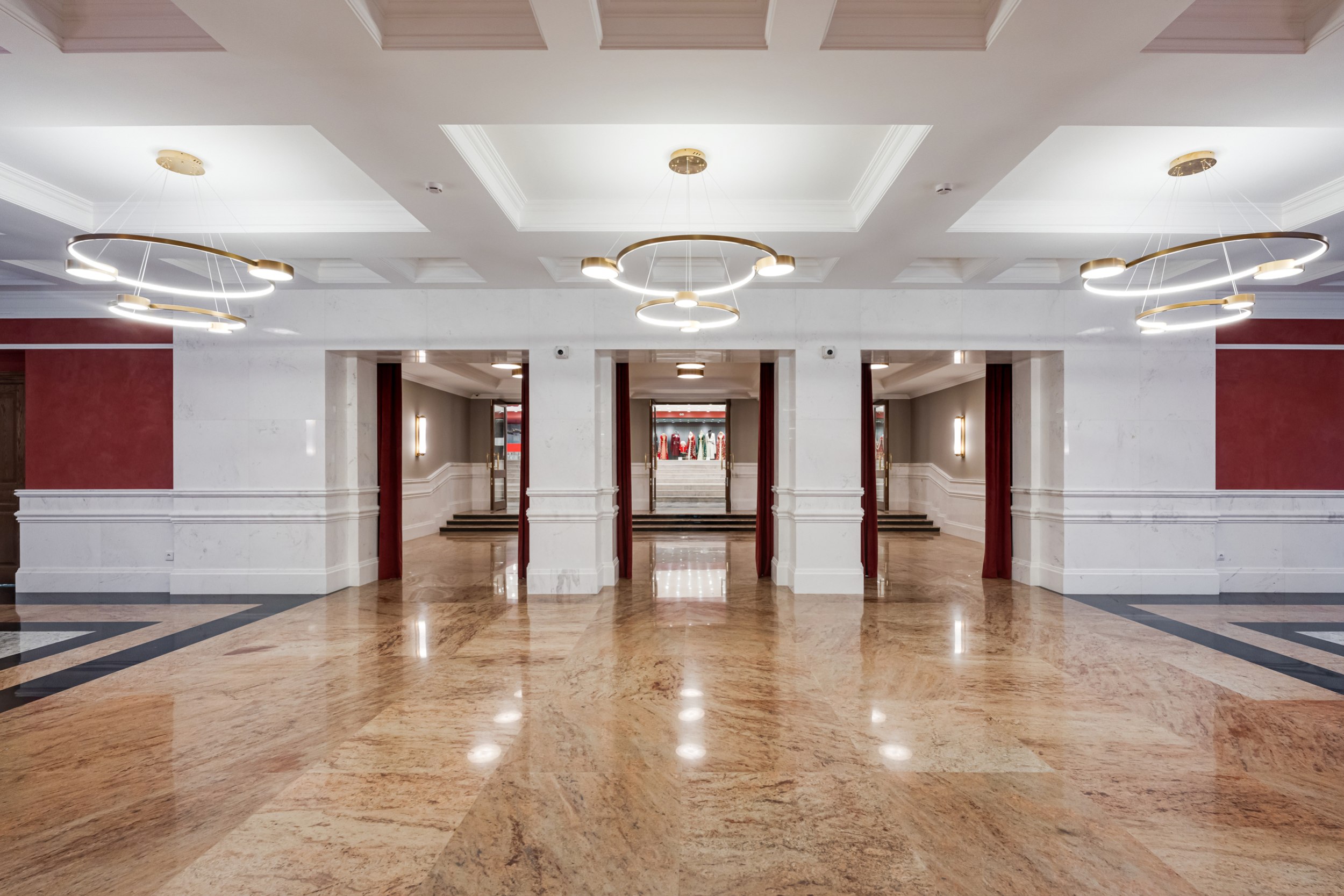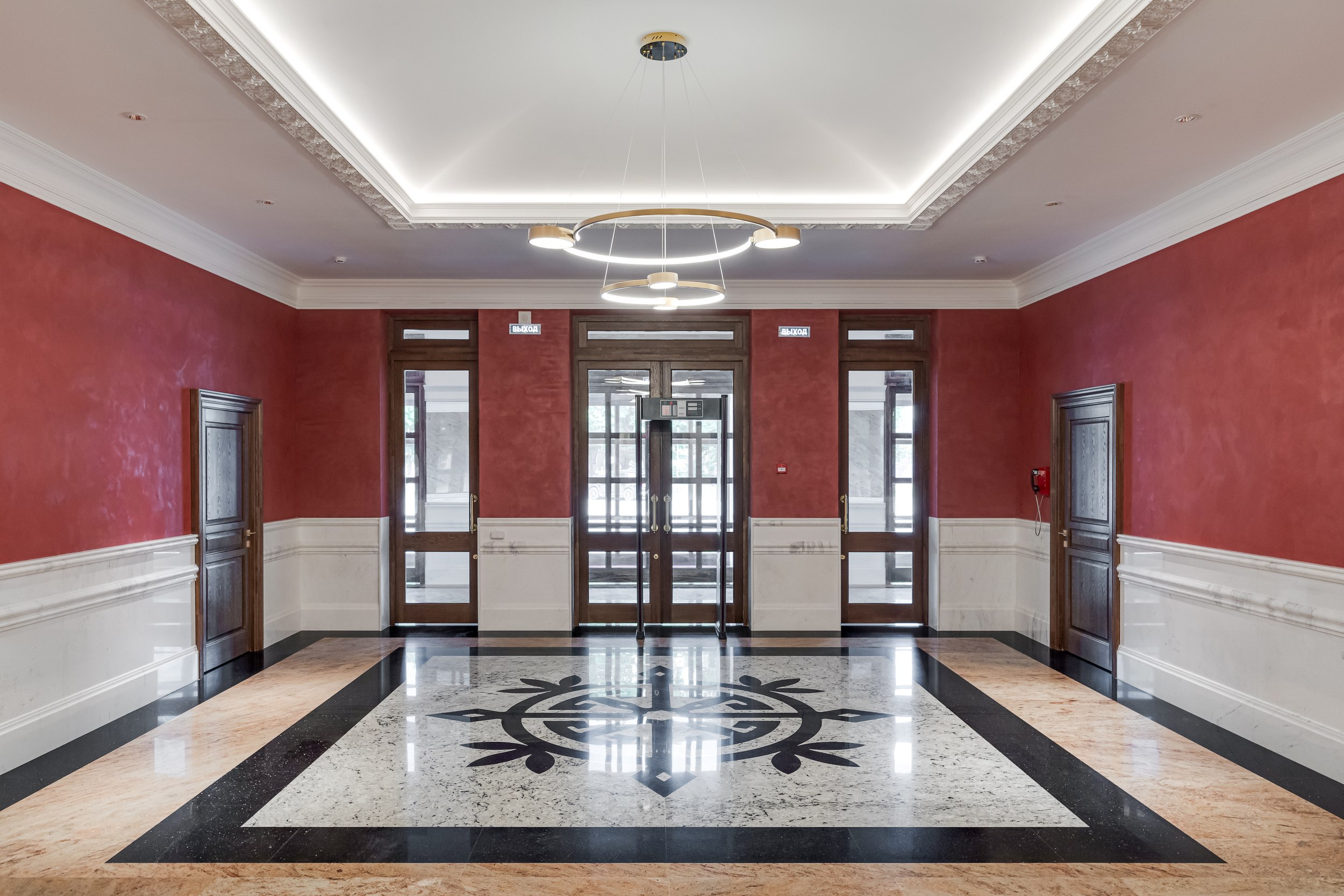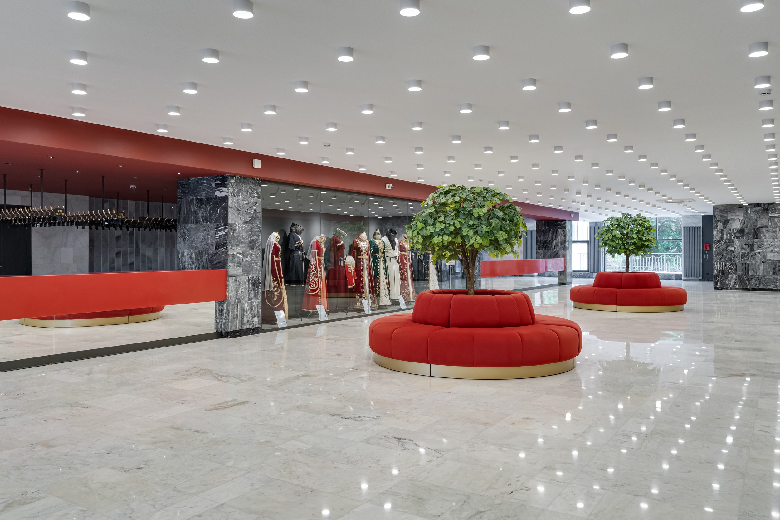 В интерьерах приоритетом было бережное сохранение и реставрация исторических деталей. Новые акценты вводились деликатно – через национальные мотивы и единый визуальный код, объединяющий два разновременных и разностилистических блока. Связующим элементом стал фирменный цвет ансамбля «Нальмэс» – красно-алый.