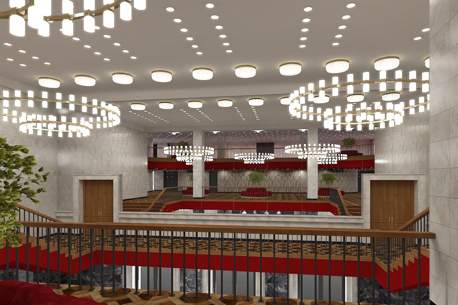 Реконструкция здания ГБУК РА ГААНТА Нальмэс. Вид со 2 этажа в сторону двусветного холла и выходов из театра