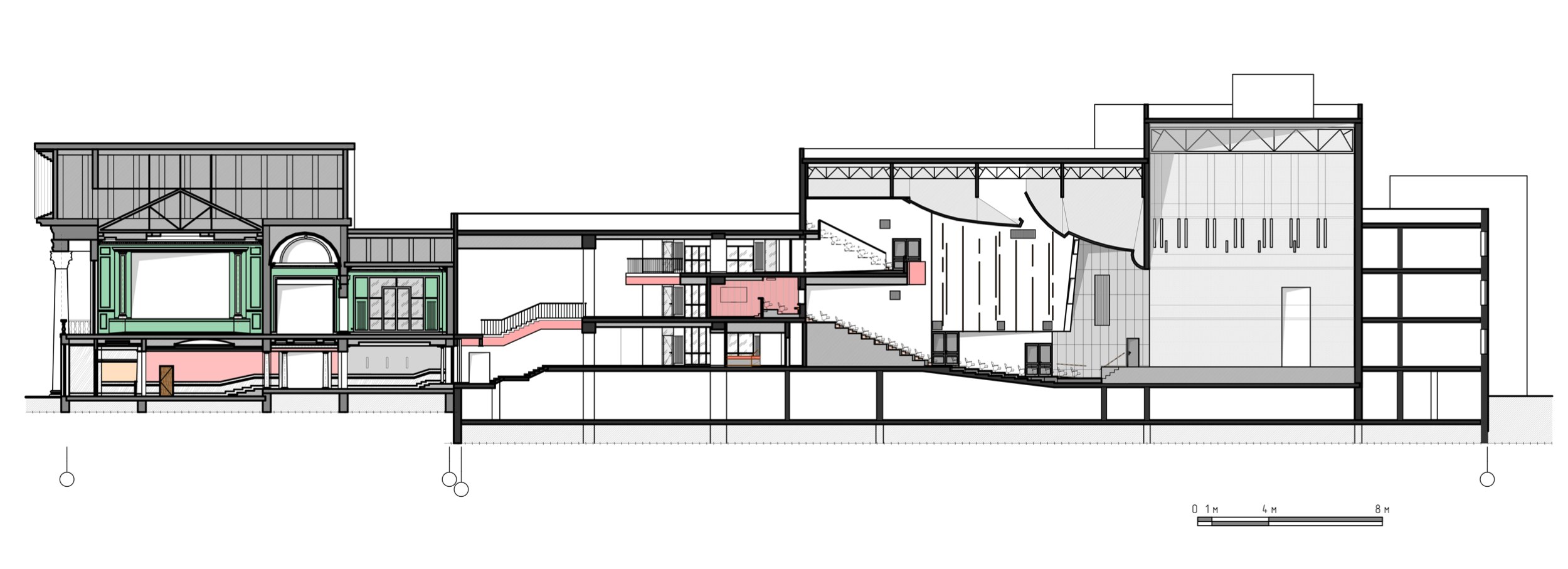 Реконструкция здания ГБУК РА ГААНТА Нальмэс. Разрез. Совмещенный разрез 2 частей