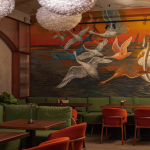 Интерьер ресторана «Гусь в яблоках» от Pergaev Bureau – это синтез исторических сюжетов и метафор, проявленный нижегородским художником-граффитистом Дмитрием Дрениным, ведь неофициально Нижний Новгород признан столицей российского стрит-арта. Пейзаж «Над Волгой» авторства известного художника Константина Федоровича Юона, написанный в 1900–1910 годах, лег в основу изображений на стенах и потолке – Дмитрий Дренин с помощью искусственного интеллекта дополнил его летящими по небу сказочными гусями.