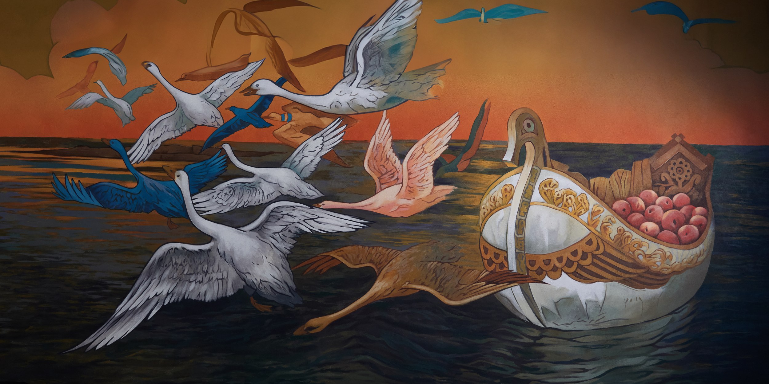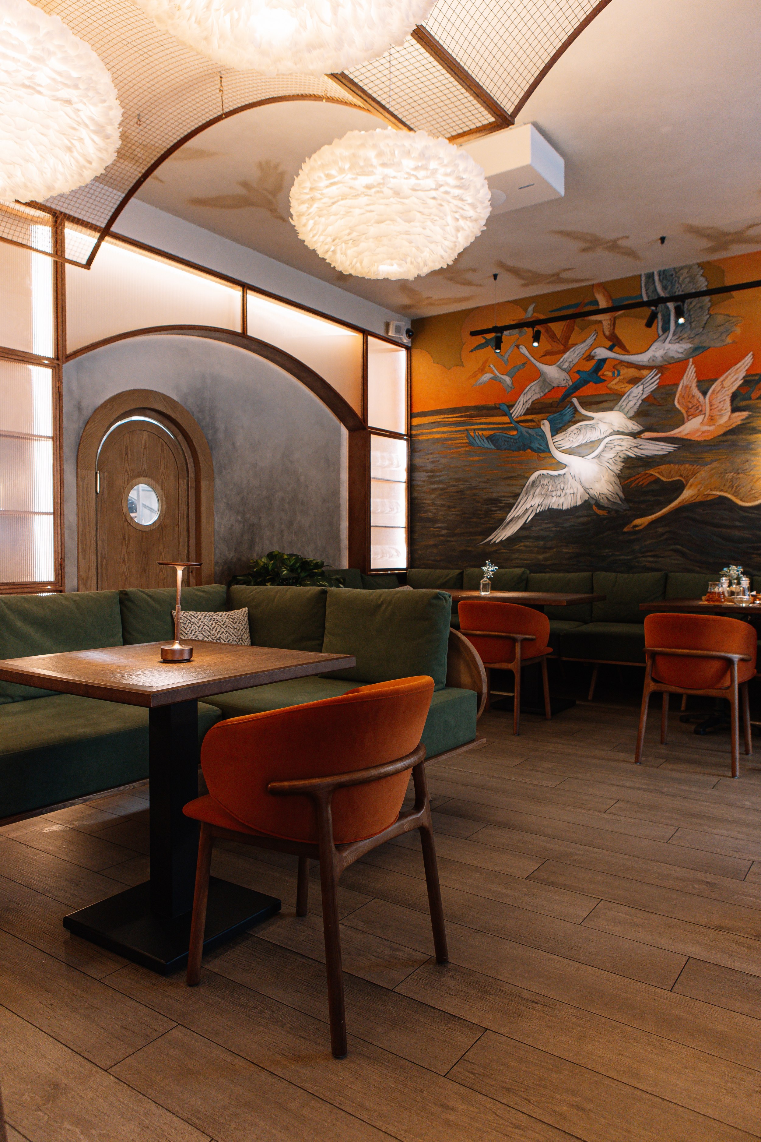 Интерьер ресторана «Гусь в яблоках» от Pergaev bureau – это синтез исторических сюжетов и метафор, проявленный нижегородским художником-граффитистом Дмитрием Дрениным, ведь неофициально Нижний Новгород признан столицей российского стрит-арта. Пейзаж «Над Волгой» авторства известного художника Константина Федоровича Юона, написанный в 1900–1910 годах, лег в основу изображений на стенах и потолке – Дмитрий Дренин с помощью искусственного интеллекта дополнил его летящими по небу сказочными гусями.