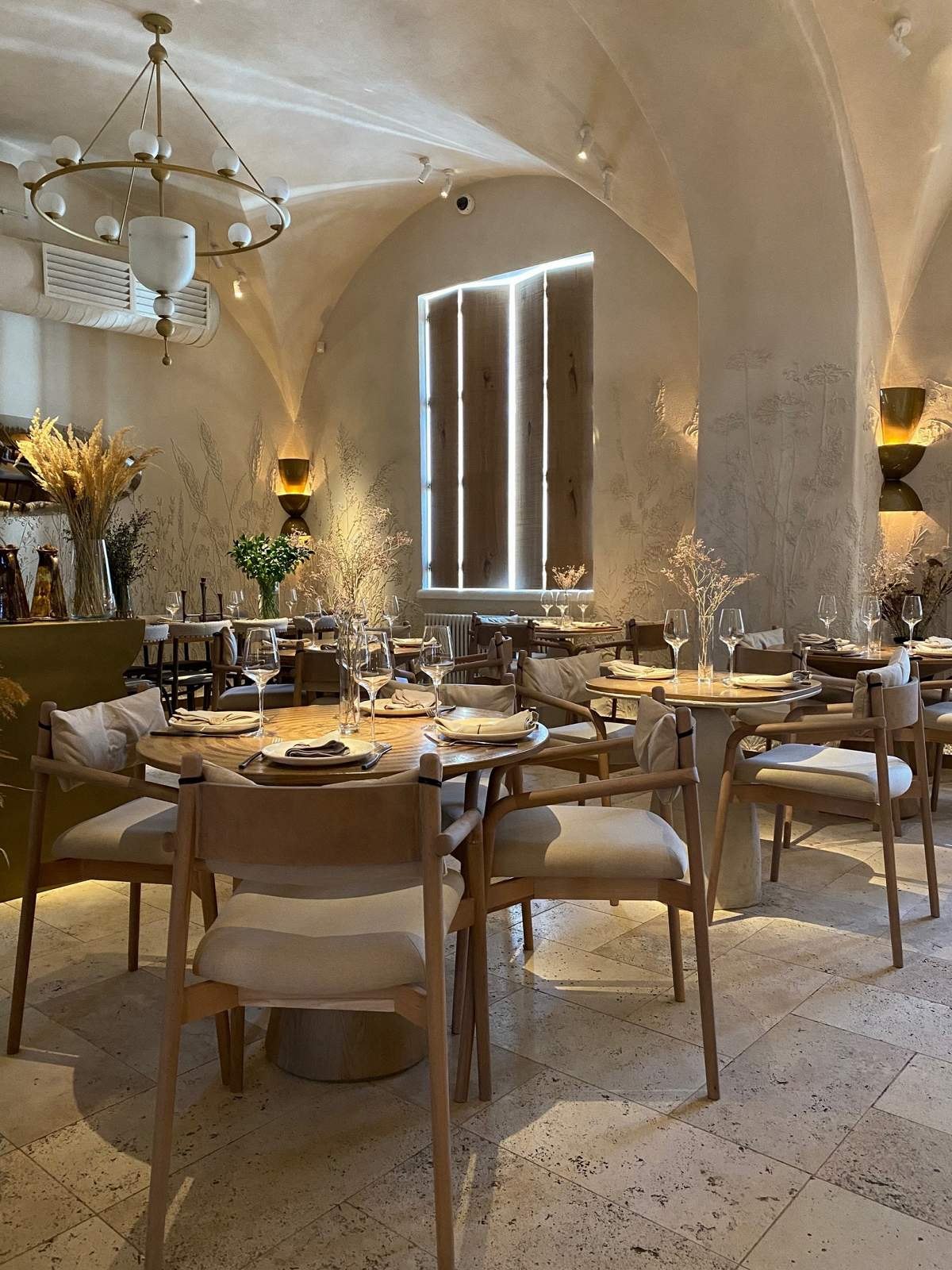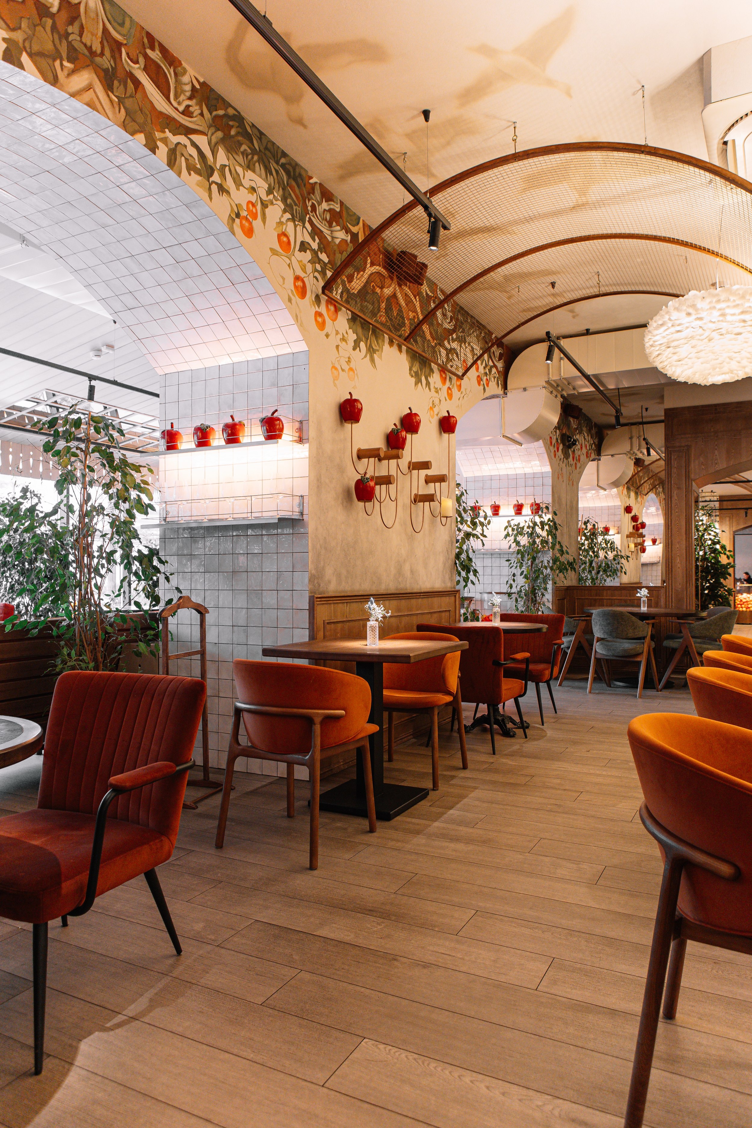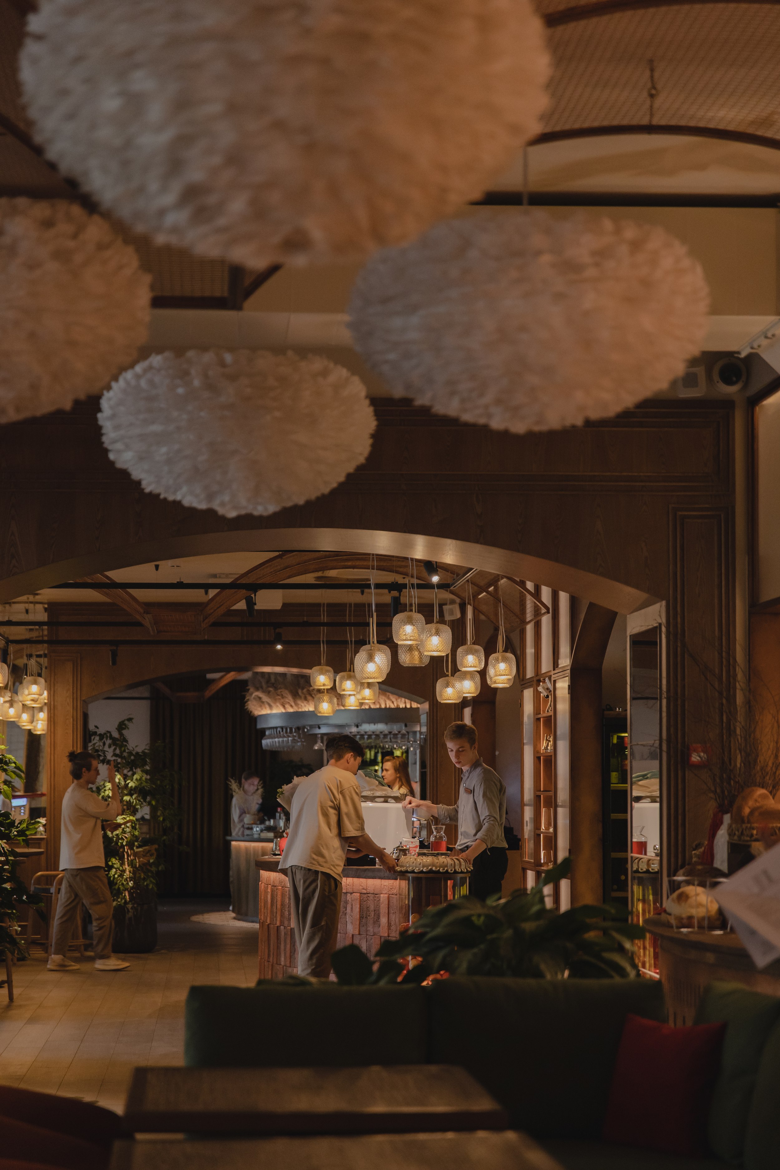 Alexander Volkov Architects сделали ставку в оформлении ресторана на натуральные материалы и природные мотивы: мягкие природные оттенки, натуральное дерево и белые оштукатуренные поверхности перекликаются с архитектурой Казанского Кремля и его историческим окружением.