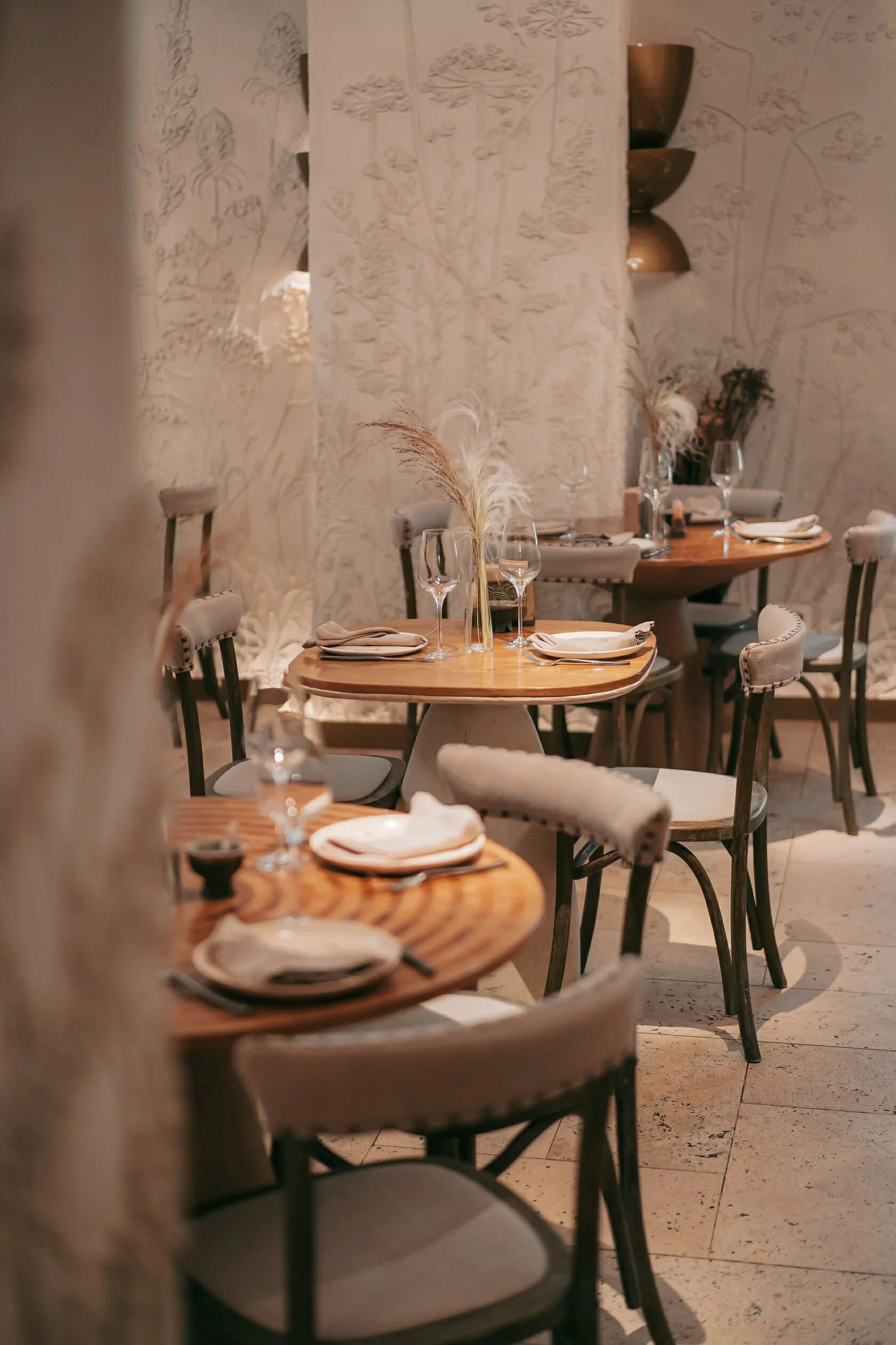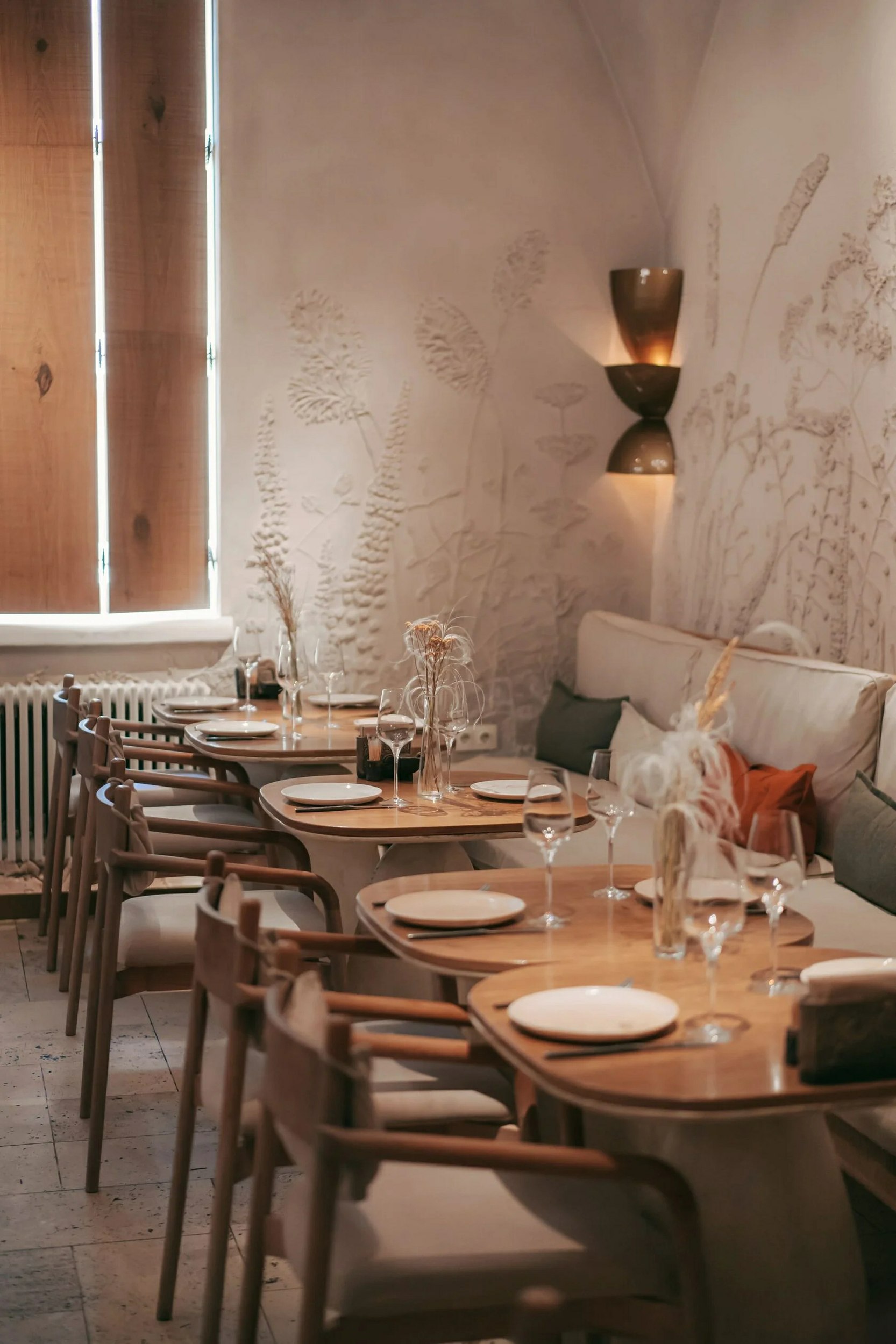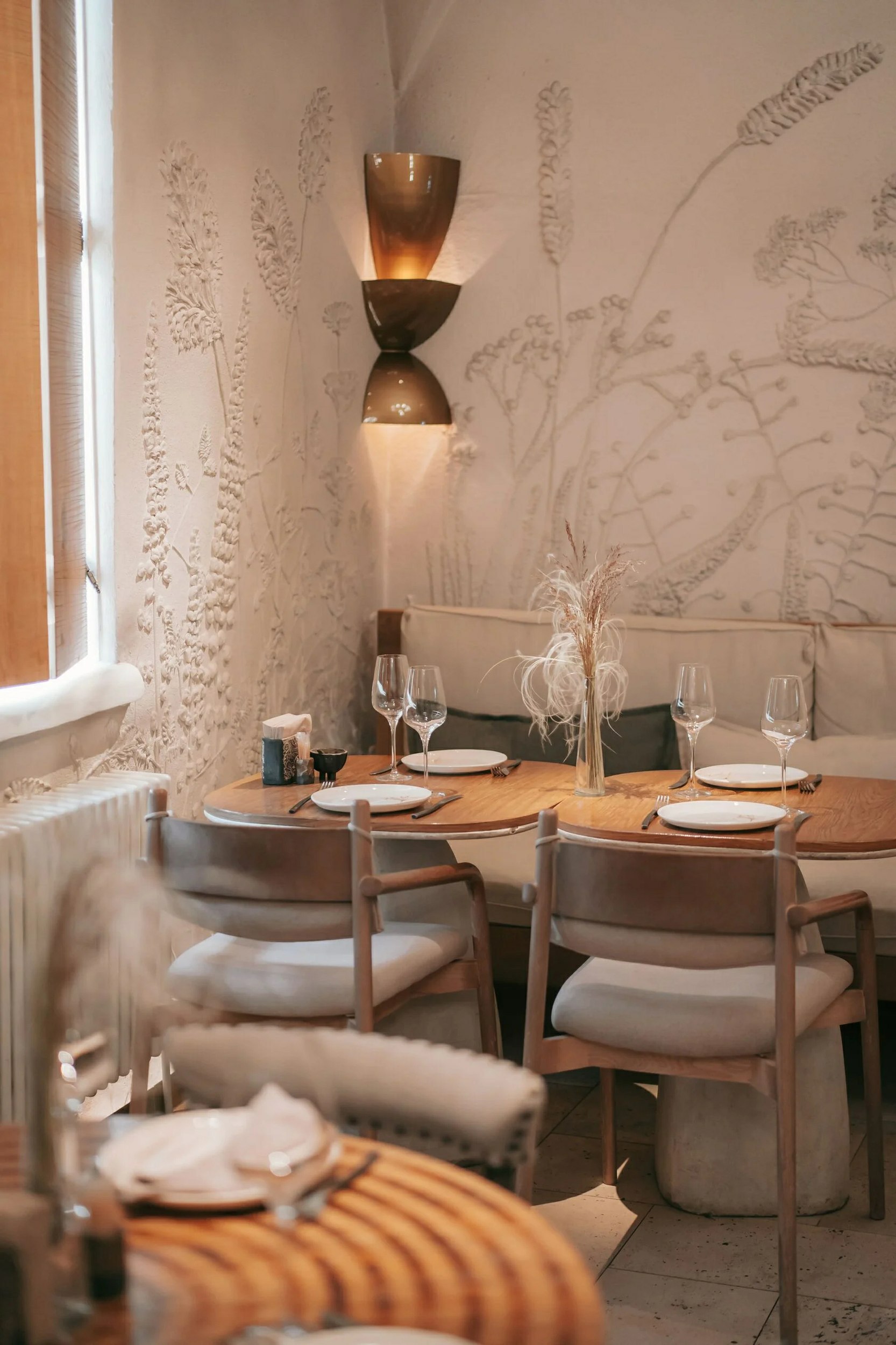 Alexander Volkov Architects сделали ставку в оформлении ресторана на натуральные материалы и природные мотивы: мягкие природные оттенки, натуральное дерево и белые оштукатуренные поверхности перекликаются с архитектурой Казанского Кремля и его историческим окружением.