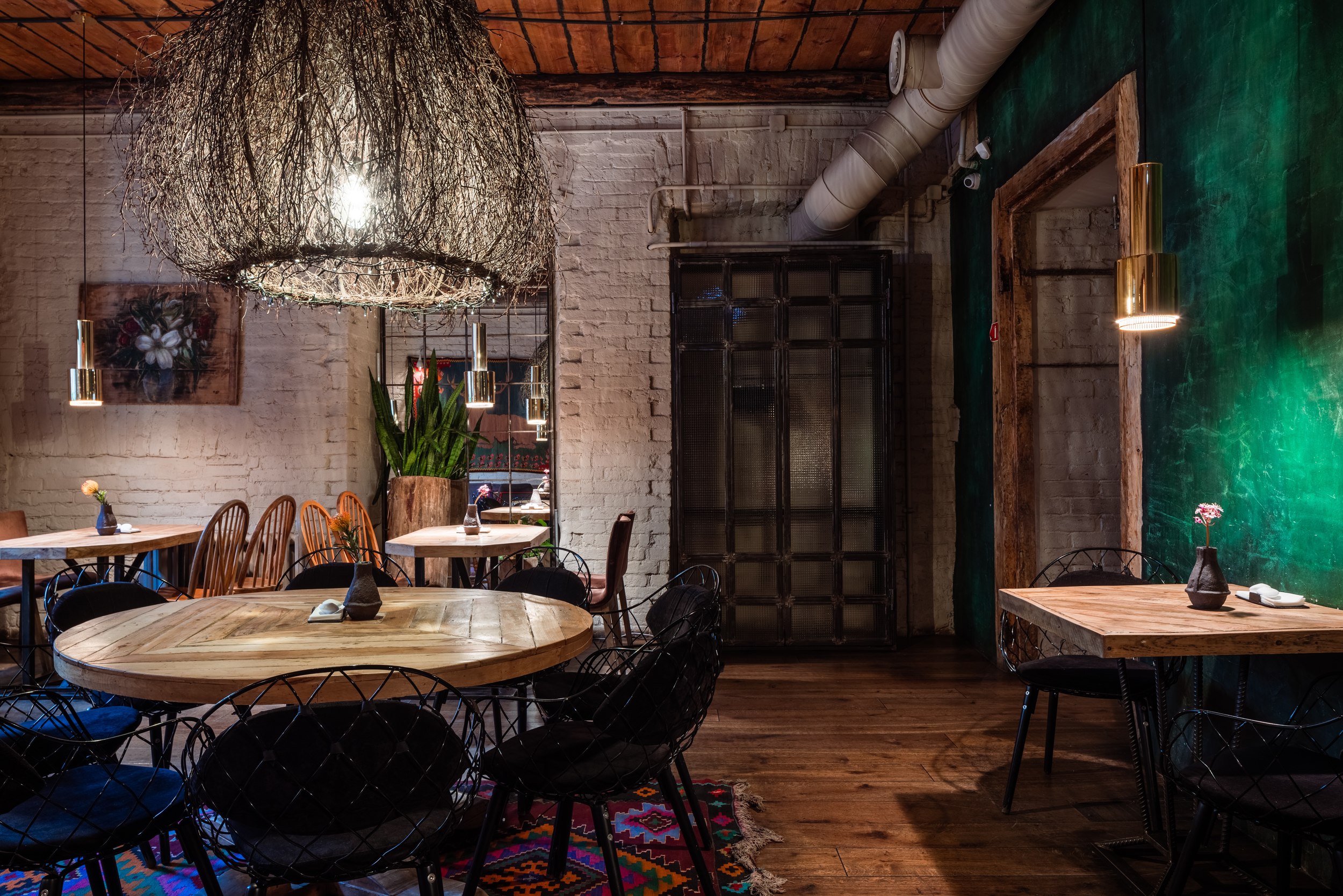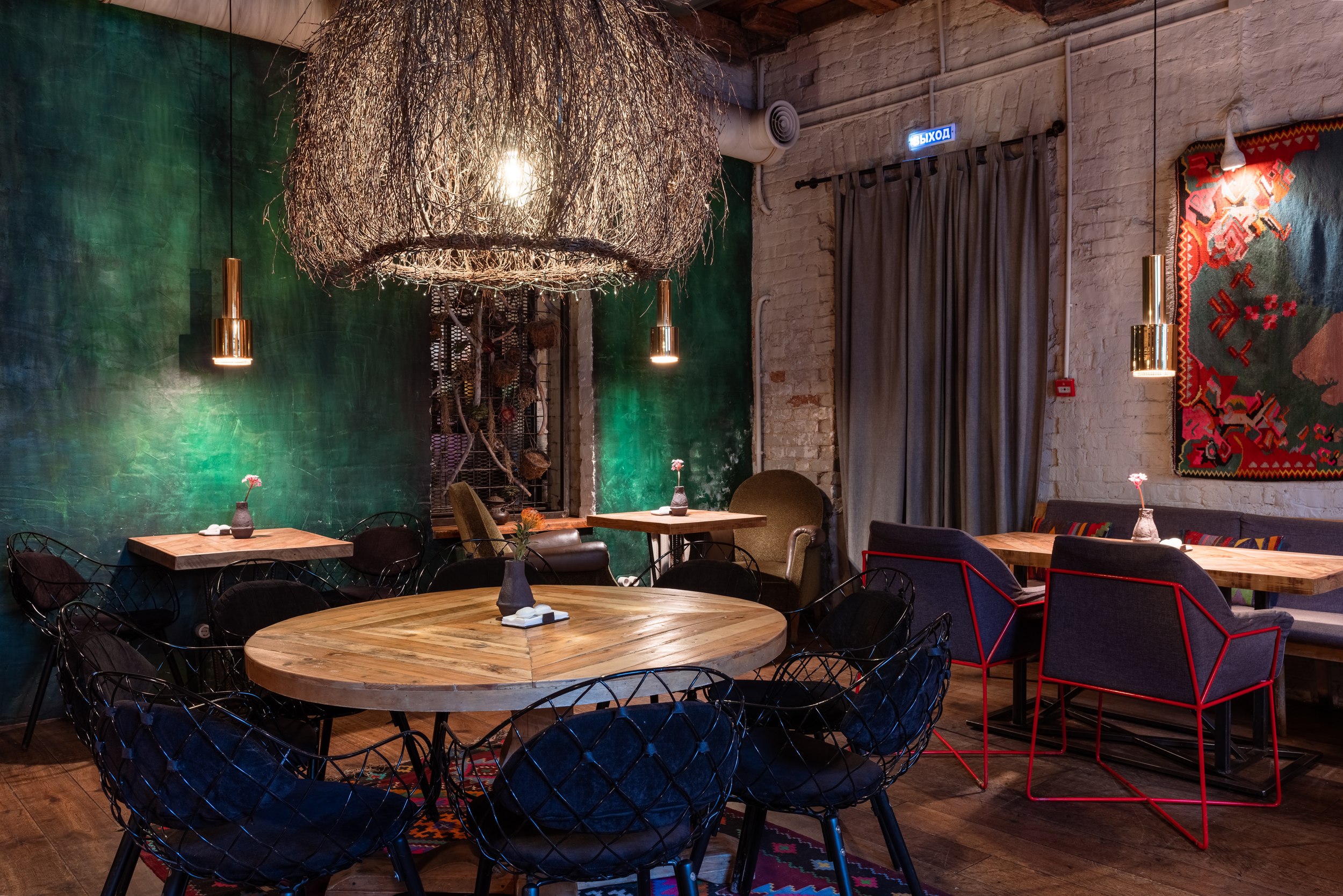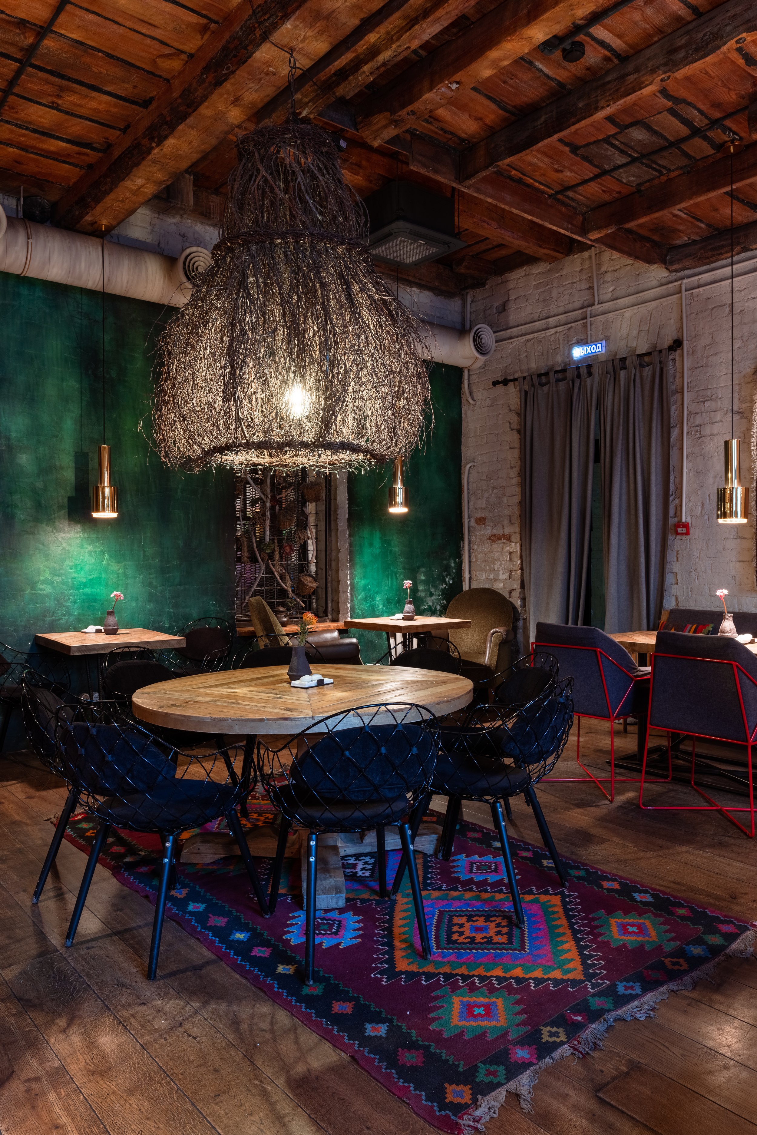 Название ресторана «Чирэм» с татарского переводится как «молодая зеленая трава». Этот образ, символизирующий весну, возрождение, свежесть, природу и обращение к корням, стал ключевым для концепции всего интерьера.