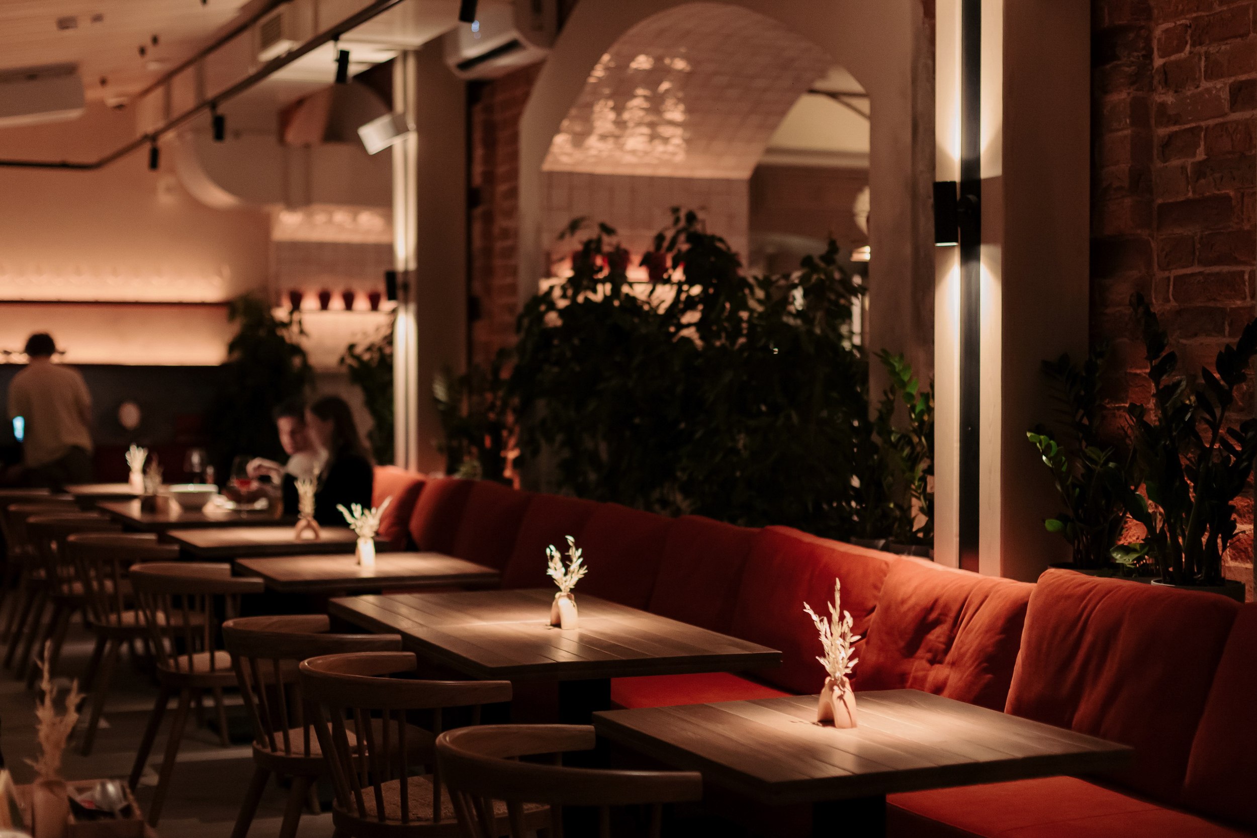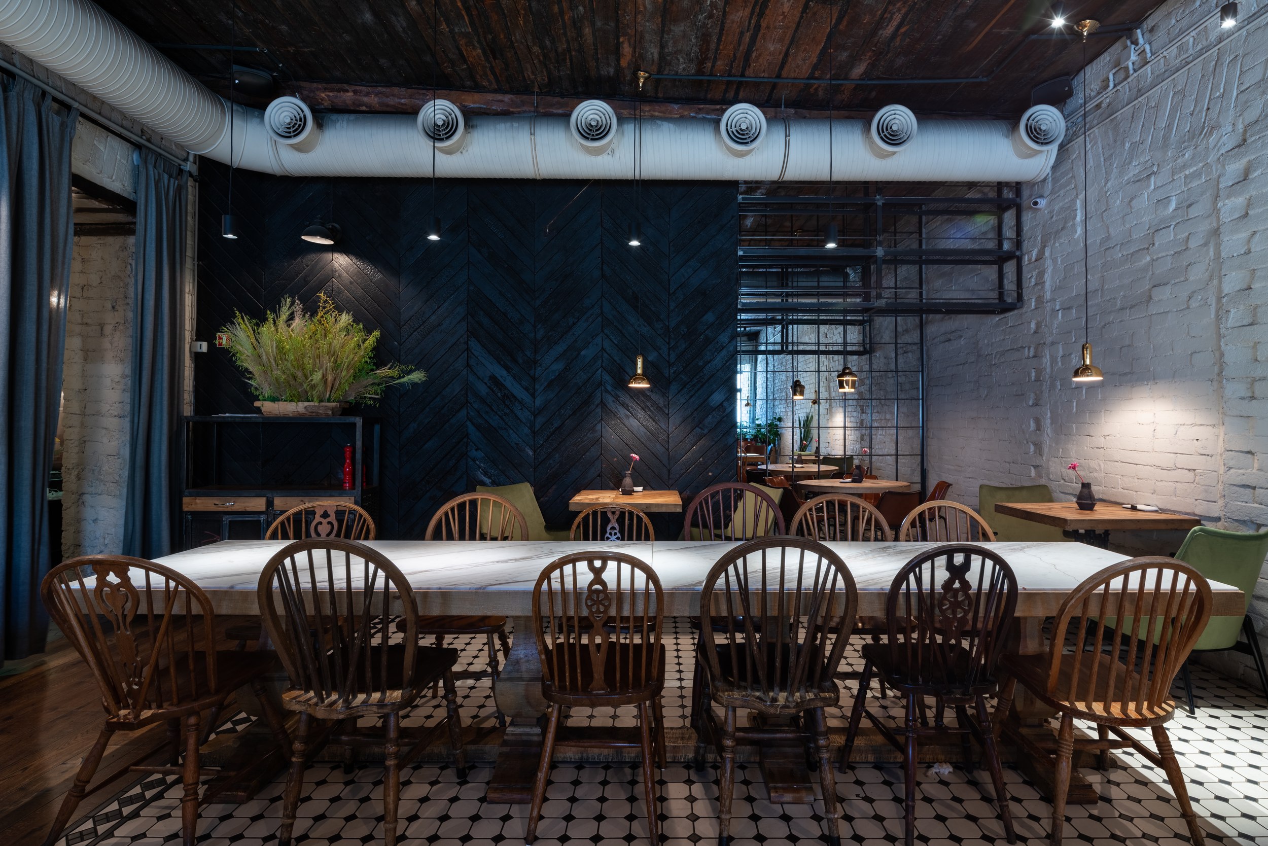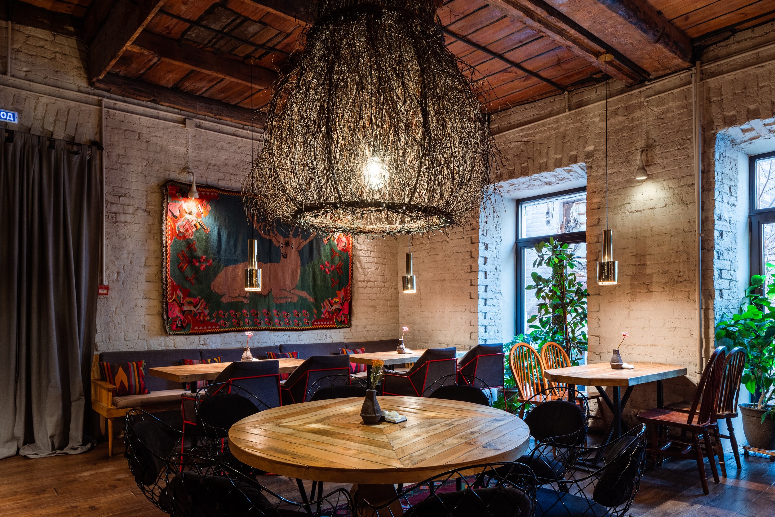 Название ресторана «Чирэм» с татарского переводится как «молодая зеленая трава». Этот образ, символизирующий весну, возрождение, свежесть, природу и обращение к корням, стал ключевым для концепции всего интерьера.