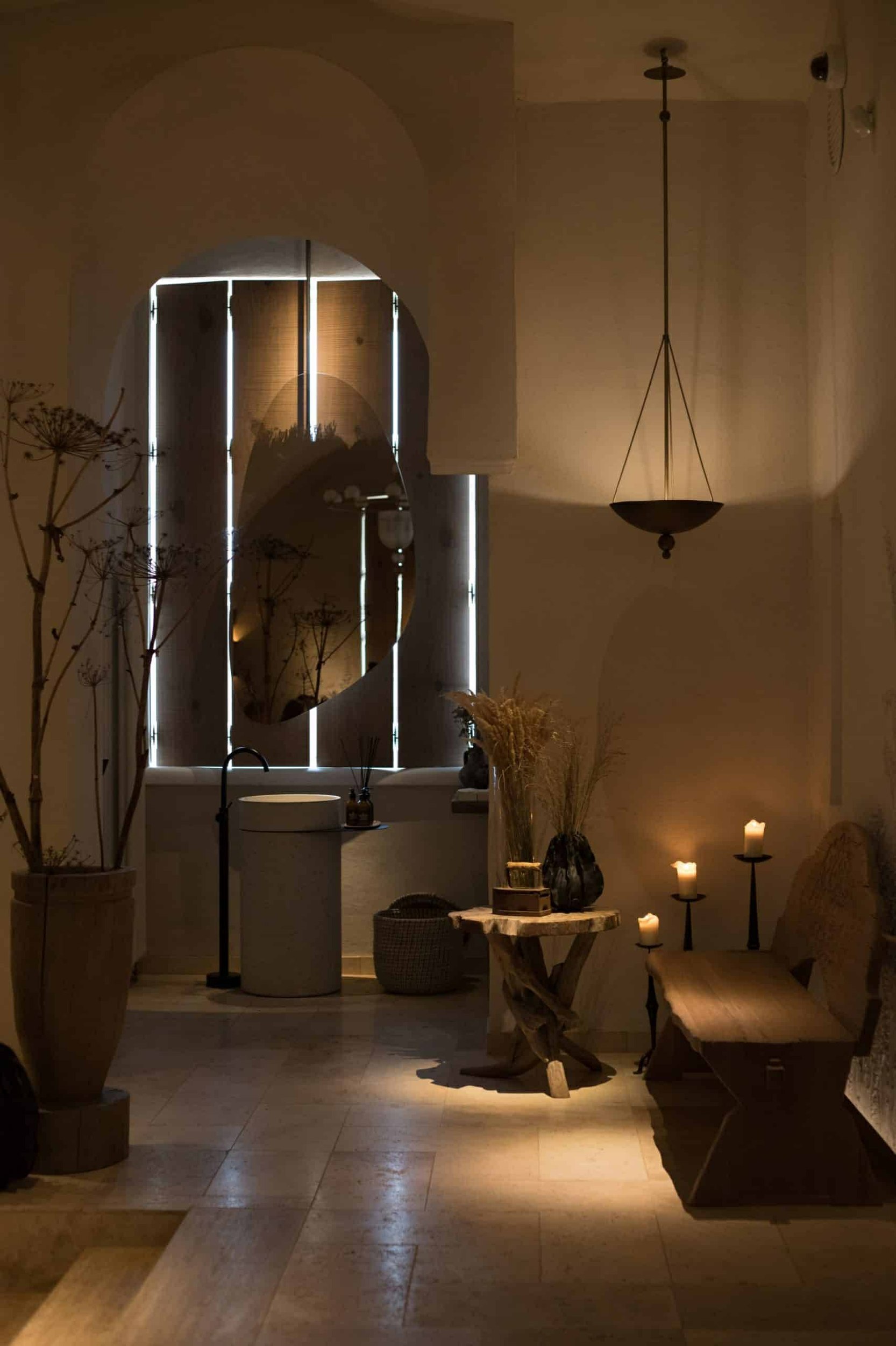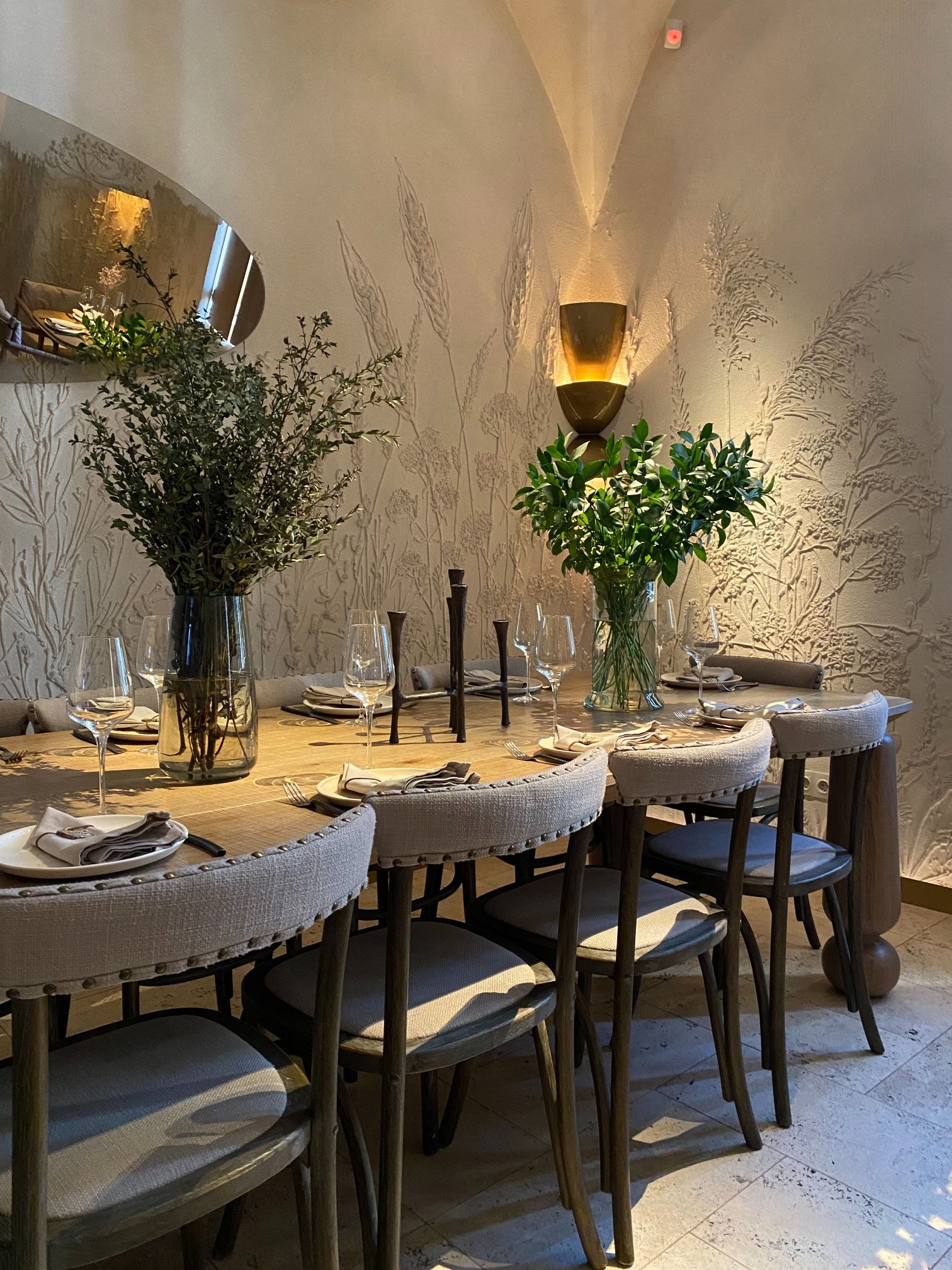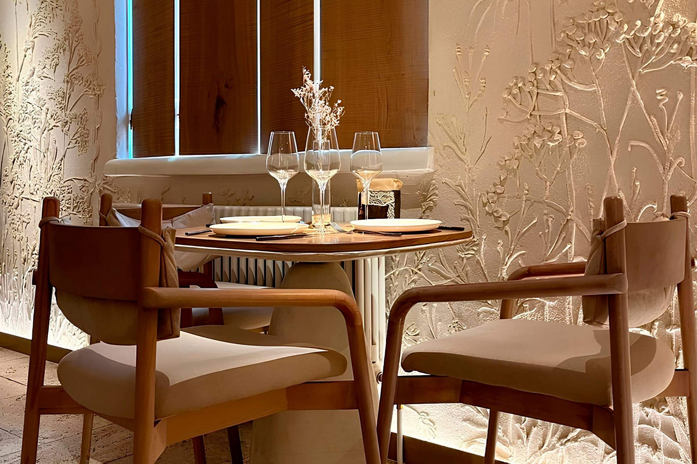 Изображения трав и цветов – душицы, ромашки, медуницы, одуванчика и тысячелистника, – характерных для татарских лугов, присутствуют в декоре, на чашках и тарелках. В отделке применен натуральный травертин, который органично дополняют деревянные ставни на окнах, а текстиль в травянисто-зеленых оттенках создает ощущение тепла и уюта внутри старинных стен.