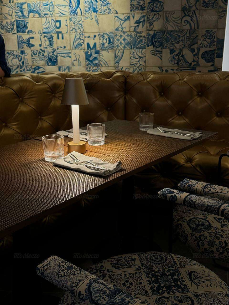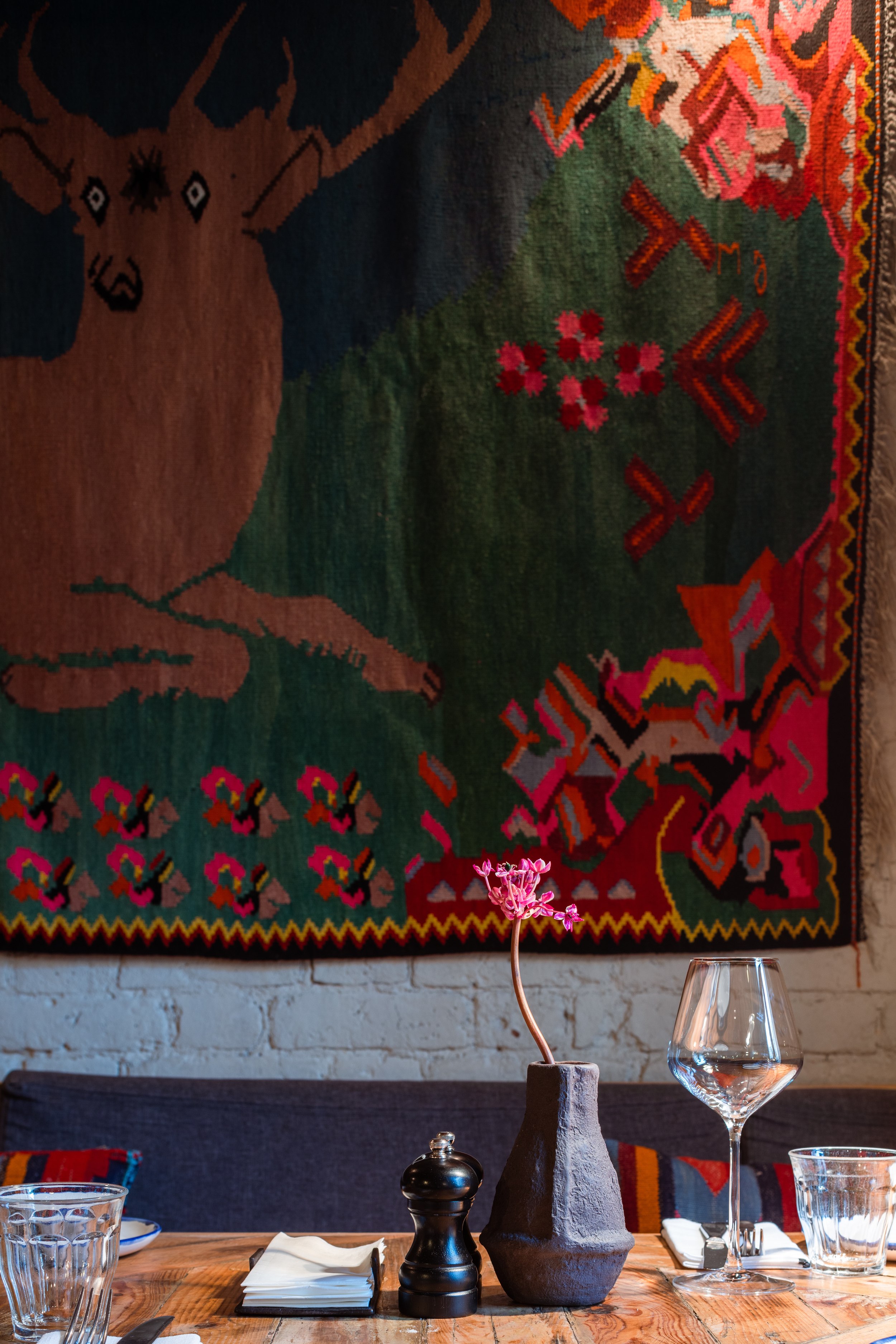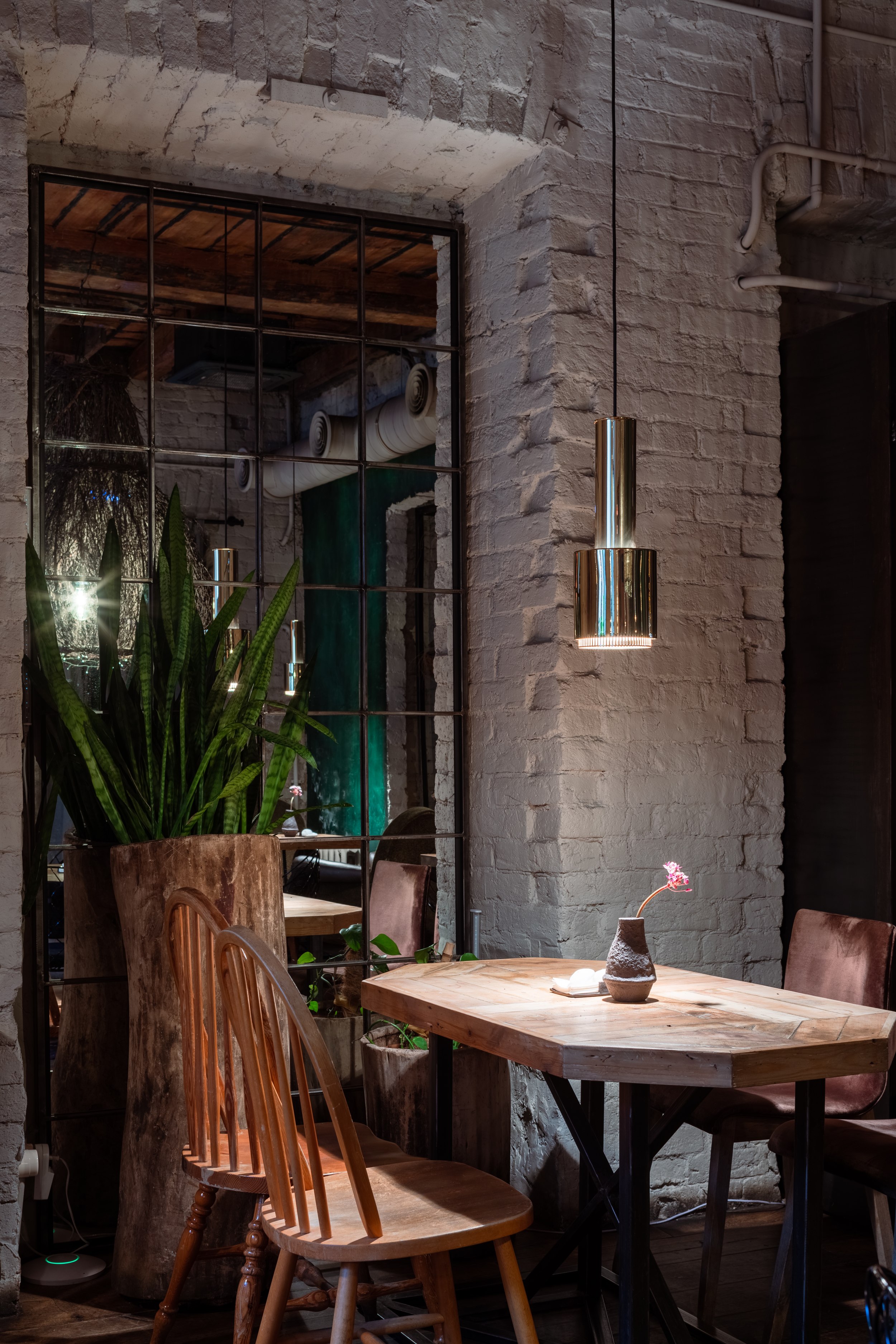 Дизайнерские светильники и посуда ручной работы усиливают ощущение ремесленной, аутентичной эстетики: каждое блюдо подается в уникальной керамической посуде. Например, стейк из конской вырезки с копченым виноградом и соусом из кваса или торт «Татарстан» по рецепту бабушки Веры.
