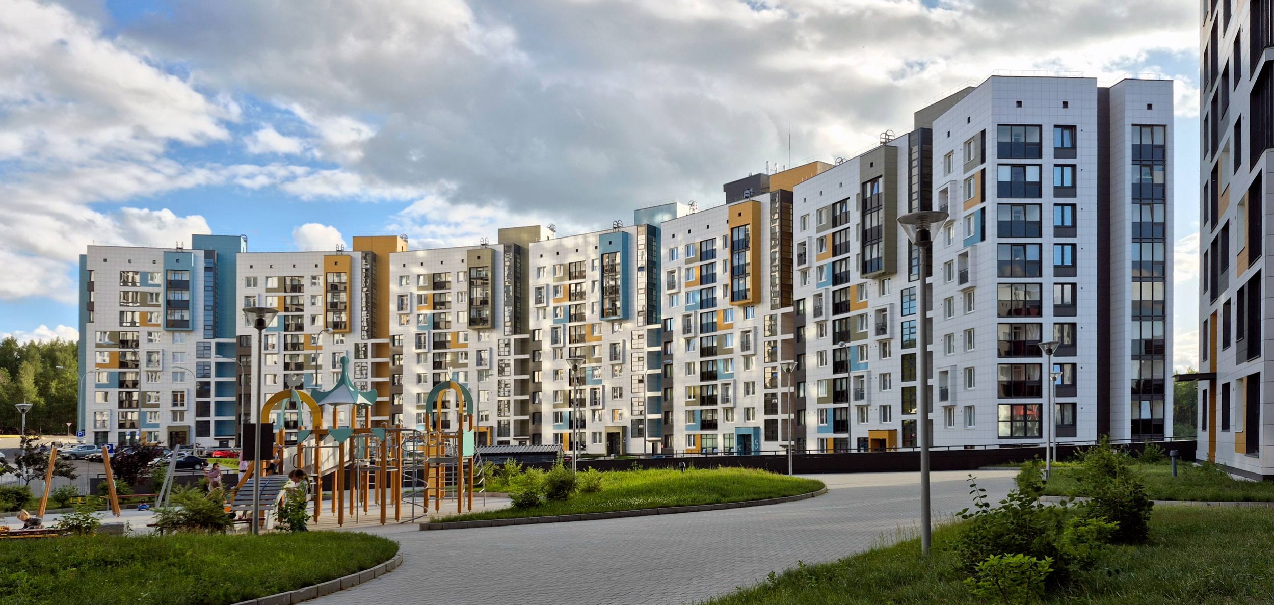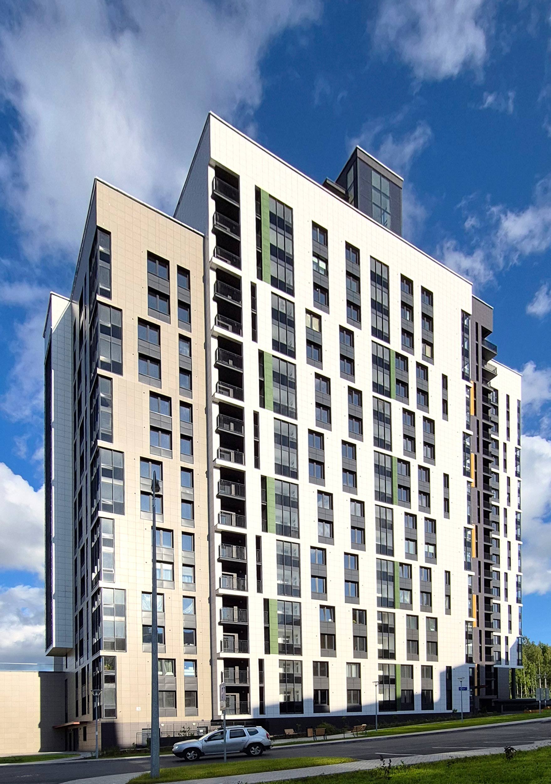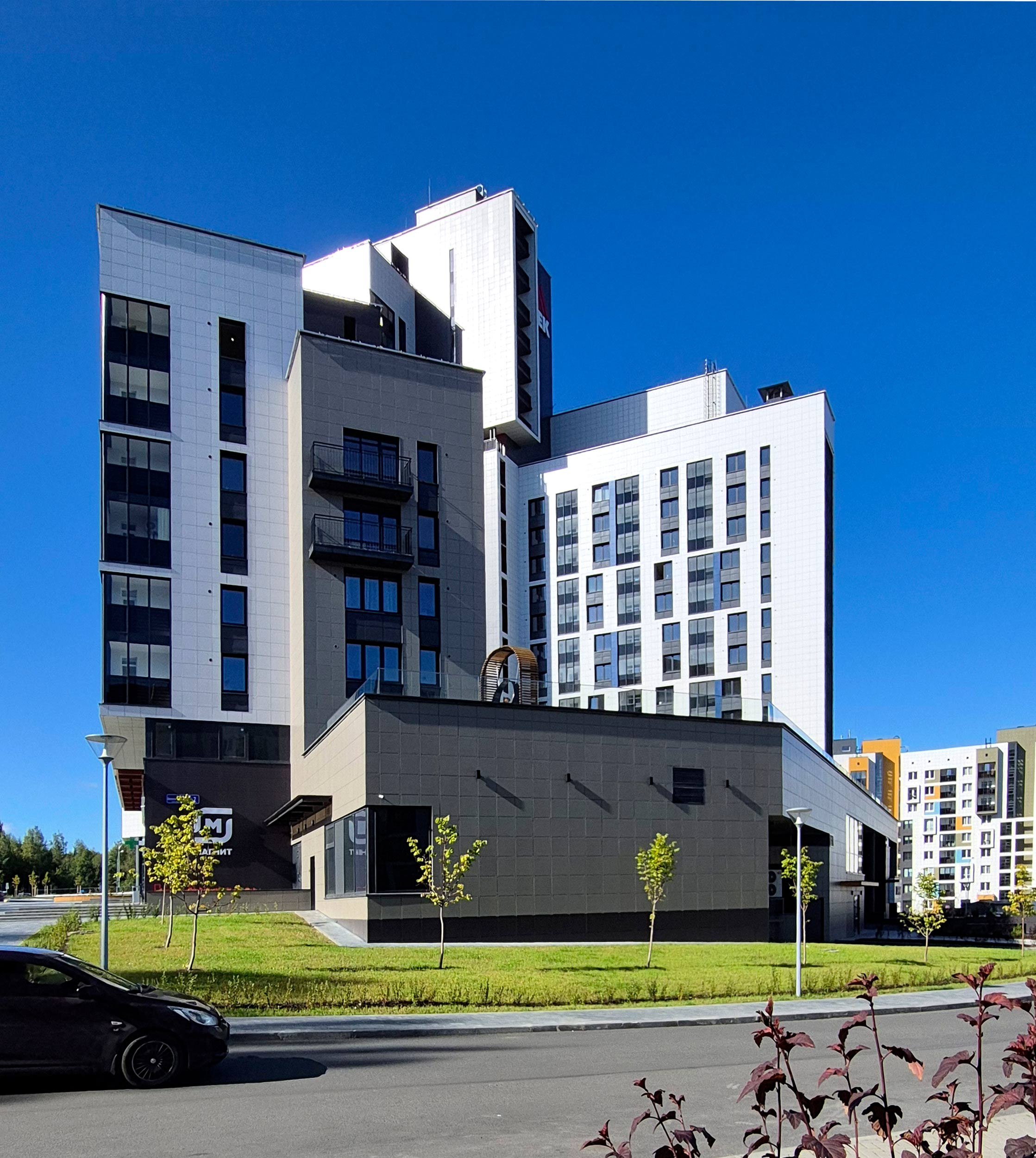 Этот активный язык усиливается решением фасадов: оно также индивидуально в разных корпусах и в разных секциях одного дома. Используются широкий набор приемов – от акцентирования лестничных клеток и выноса балконов, до подрезки первых этажей с выносом на опоры, углового остекления и сбивки оконного ритма. Плюс активная работа с цветом – палитра очень разнообразна. При все том в проекте не возникает визуального хаоса и даже появляется ощущение родства с жилой архитектурой северных стран, которая, как известно, тяготеет к минимализму. Возможно, тому способствует разнообразная этажность и невысокая плотность, большие дворы и обилие зеленых благоустроенных зон.