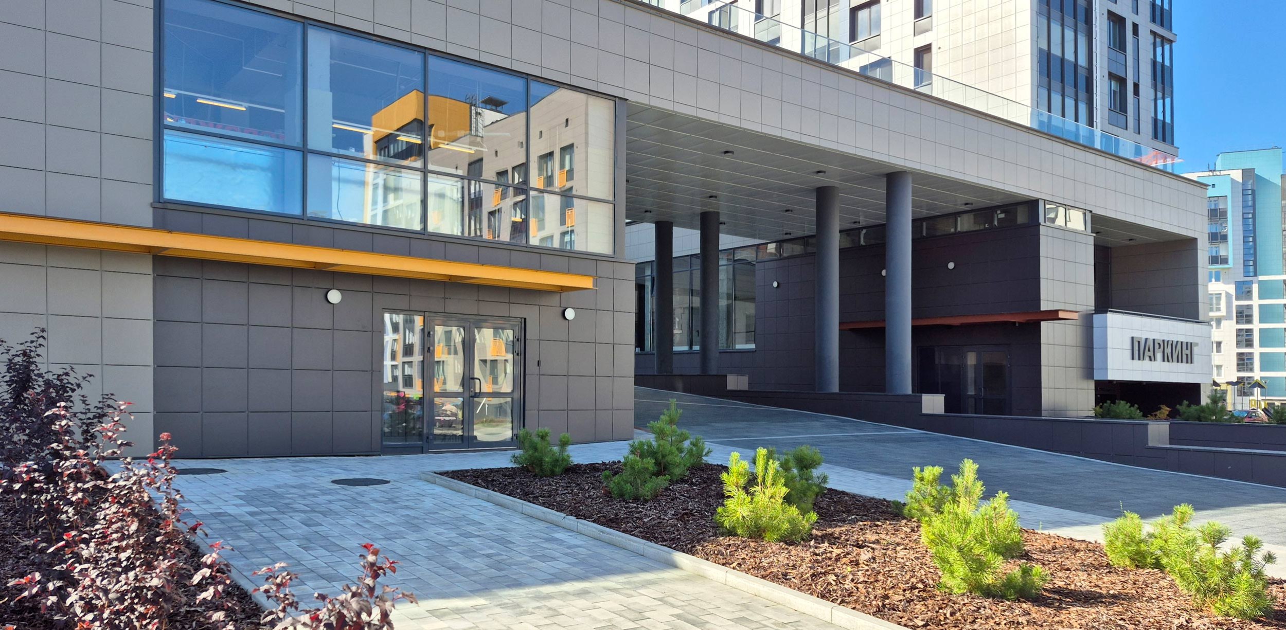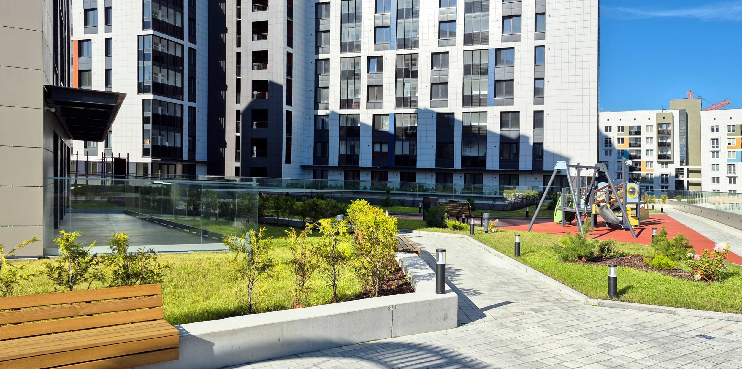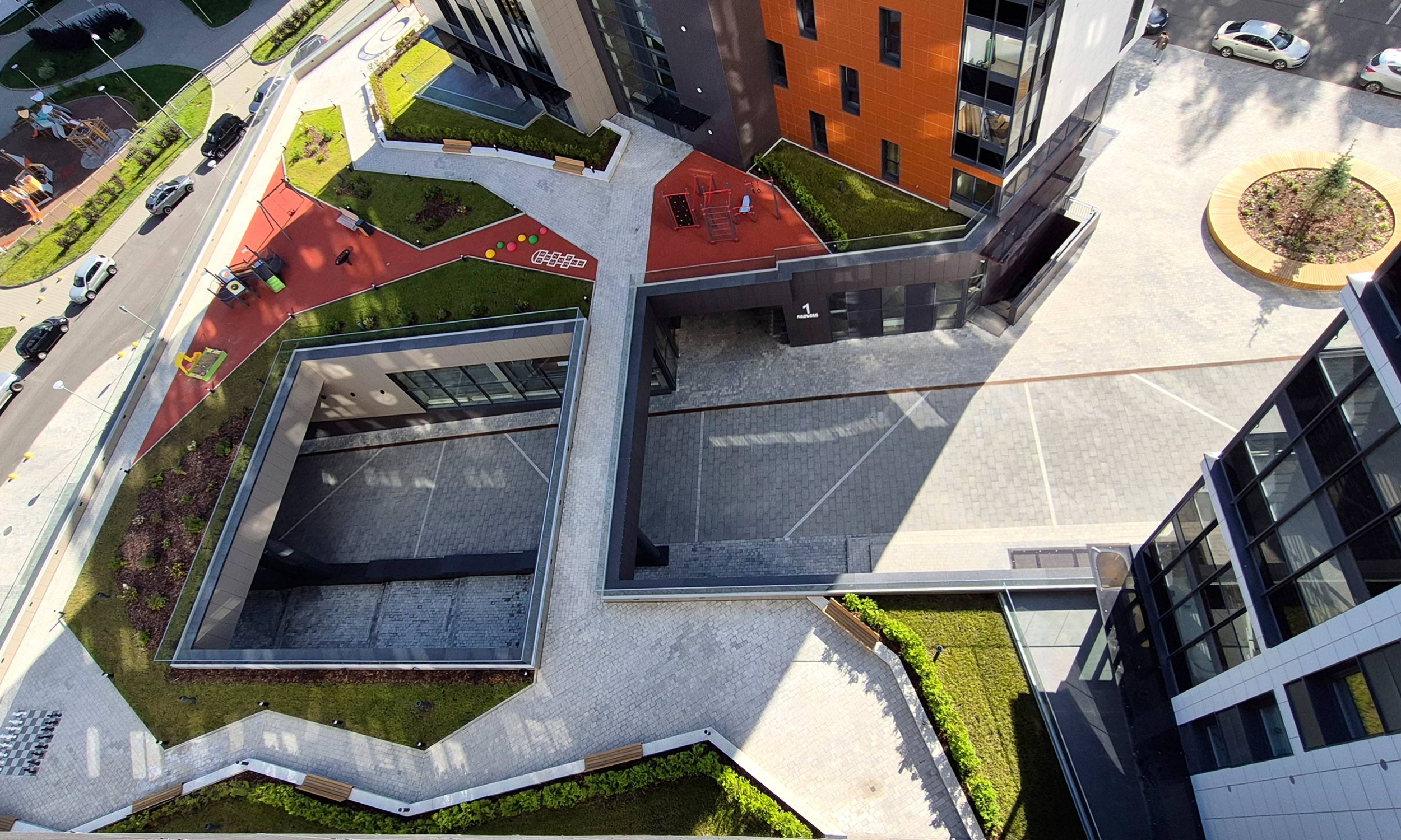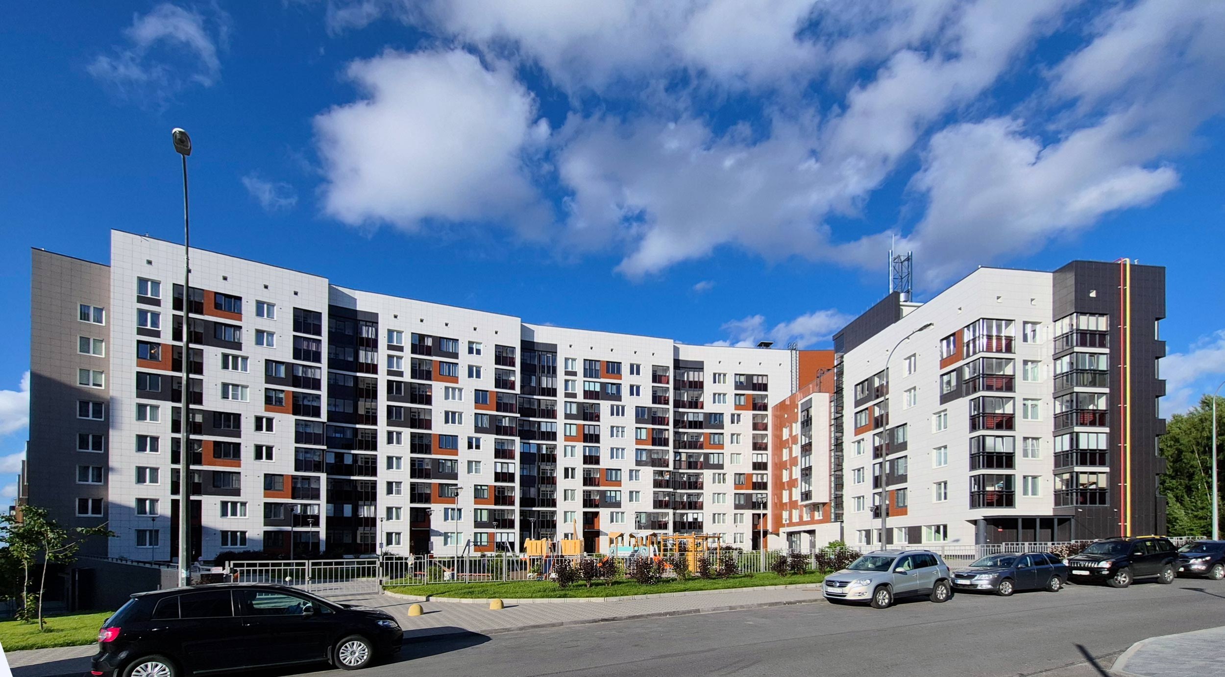 Этот активный язык усиливается решением фасадов: оно также индивидуально в разных корпусах и в разных секциях одного дома. Используются широкий набор приемов – от акцентирования лестничных клеток и выноса балконов, до подрезки первых этажей с выносом на опоры, углового остекления и сбивки оконного ритма. Плюс активная работа с цветом – палитра очень разнообразна. При все том в проекте не возникает визуального хаоса и даже появляется ощущение родства с жилой архитектурой северных стран, которая, как известно, тяготеет к минимализму. Возможно, тому способствует разнообразная этажность и невысокая плотность, большие дворы и обилие зеленых благоустроенных зон.