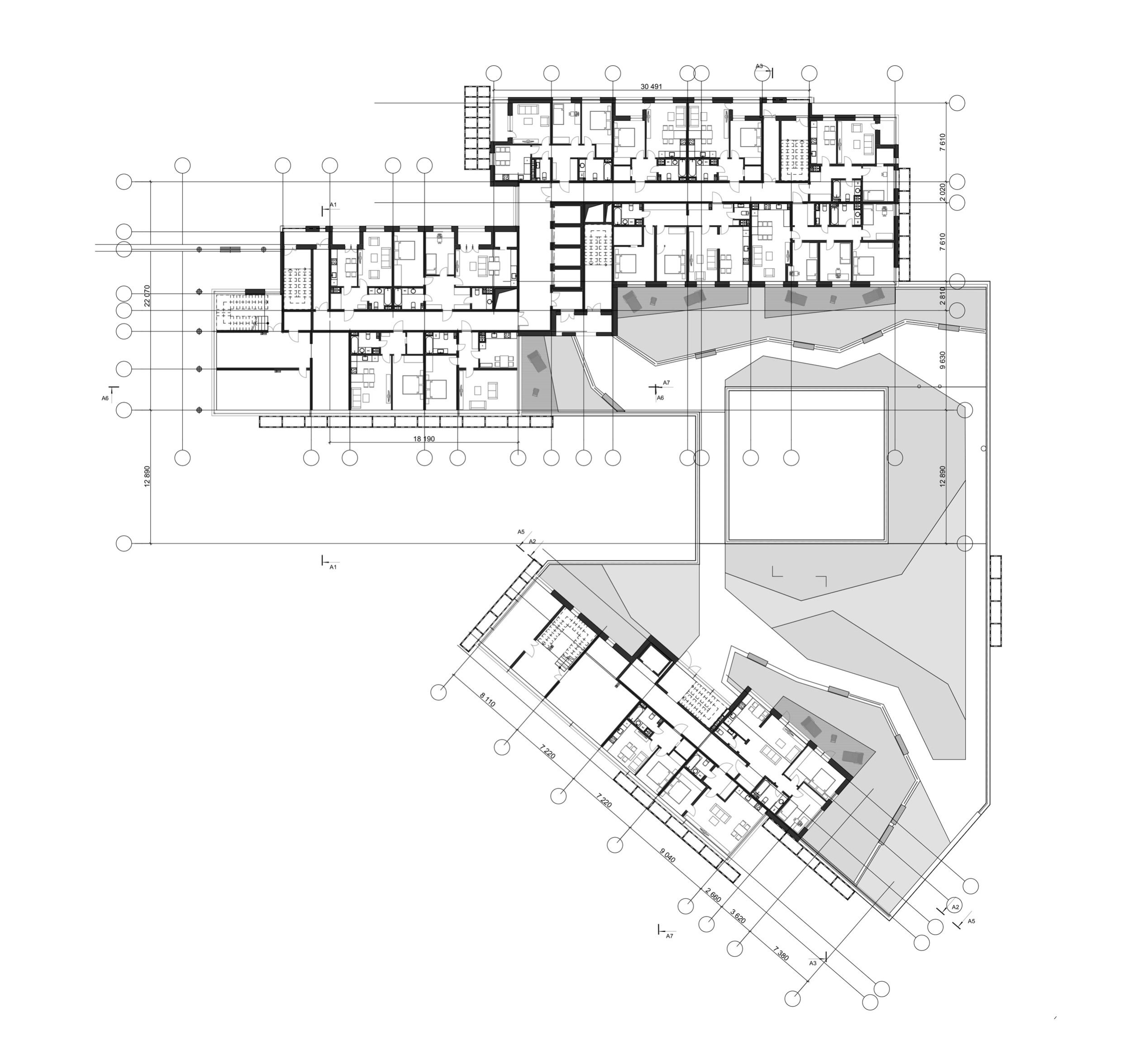 Центр ЖК – это дом №12, через который проходит главная планировочная ось – бульвар от улицы Попова. Полукругом вокруг него выстраиваются остальные корпуса, образующие полузамкнутые дворы. Любопытна блокировка секций: всего пара корпусов имеет классический ортогональный план (Г-образный). Остальные же изгибаются очень живописно: двух одинаковых компоновок нет. Секции заглубляются, поворачиваются, разнятся по высотам, в целом ведут себя очень разнообразно и пластично, создавая при этом систему уютных дворов.