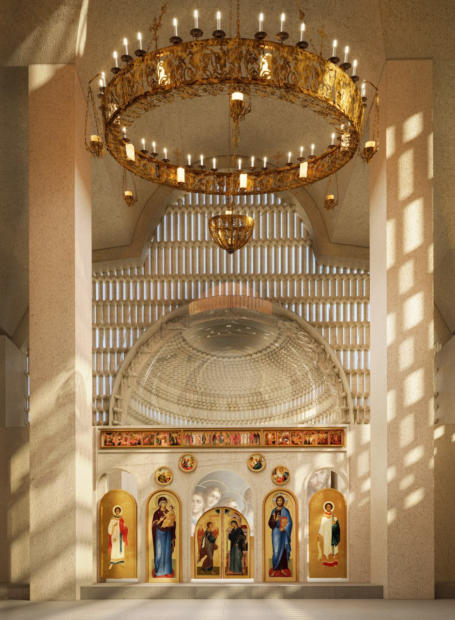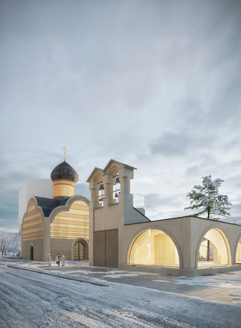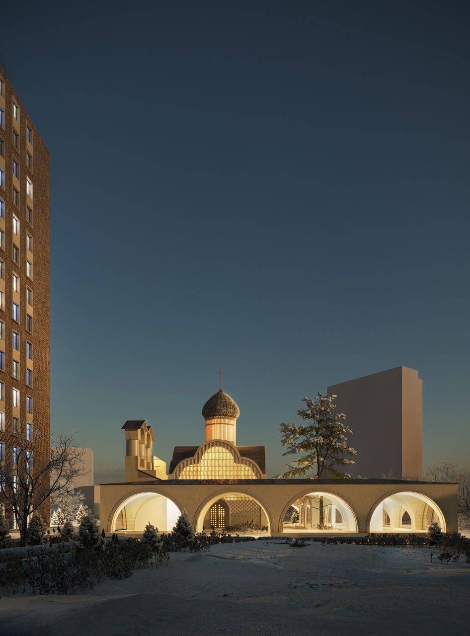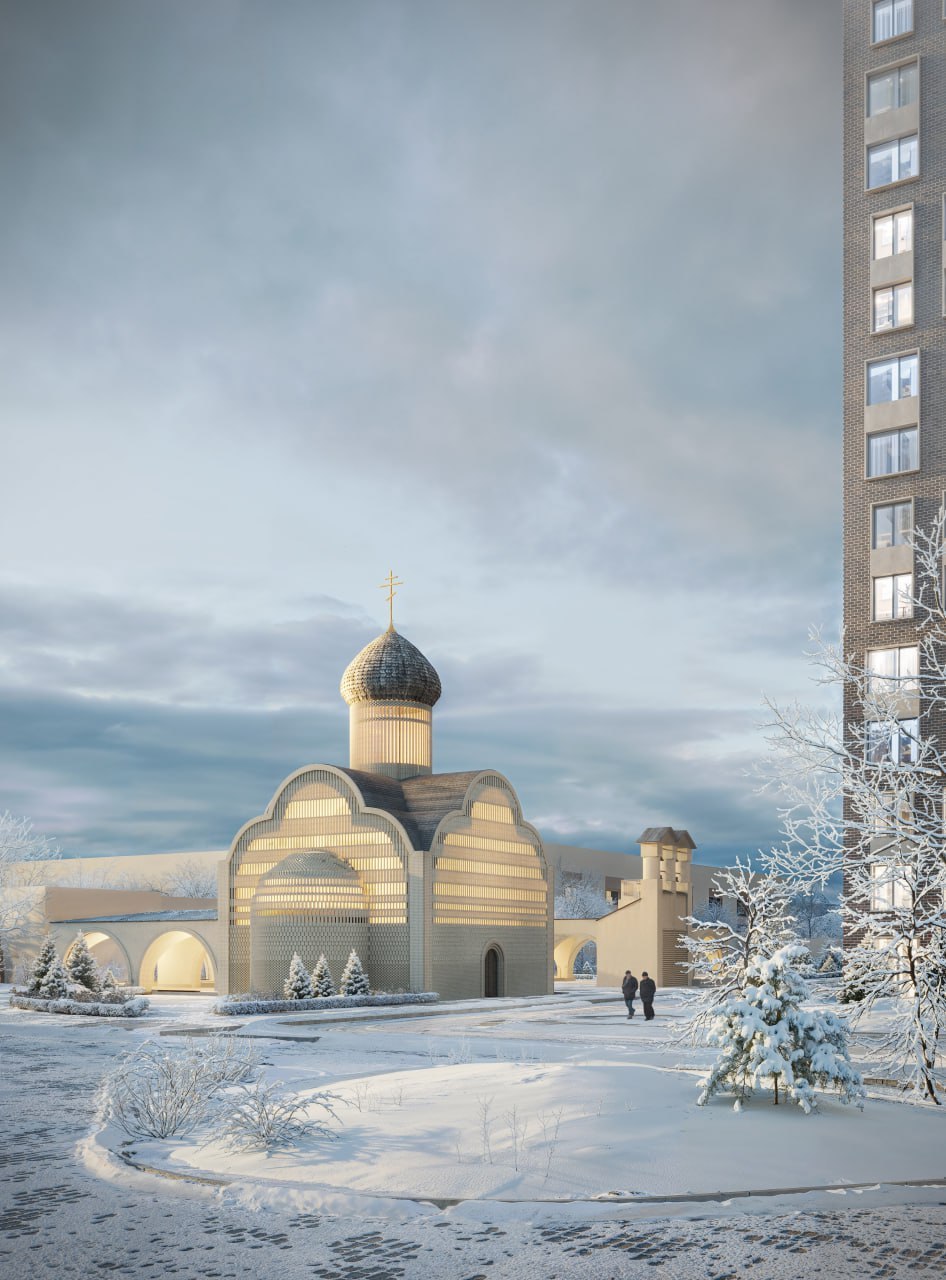 Проект храма – это не просто архитектурный образ, а переосмысление формата взаимодействия. Храм становится социальным объектом со своей площадью и дополнительными помещениями. Он размещен в точке пересечения основных потоков людей, что позволяет ему выступать центром притяжения и одновременно создавать пространство взаимодействия.