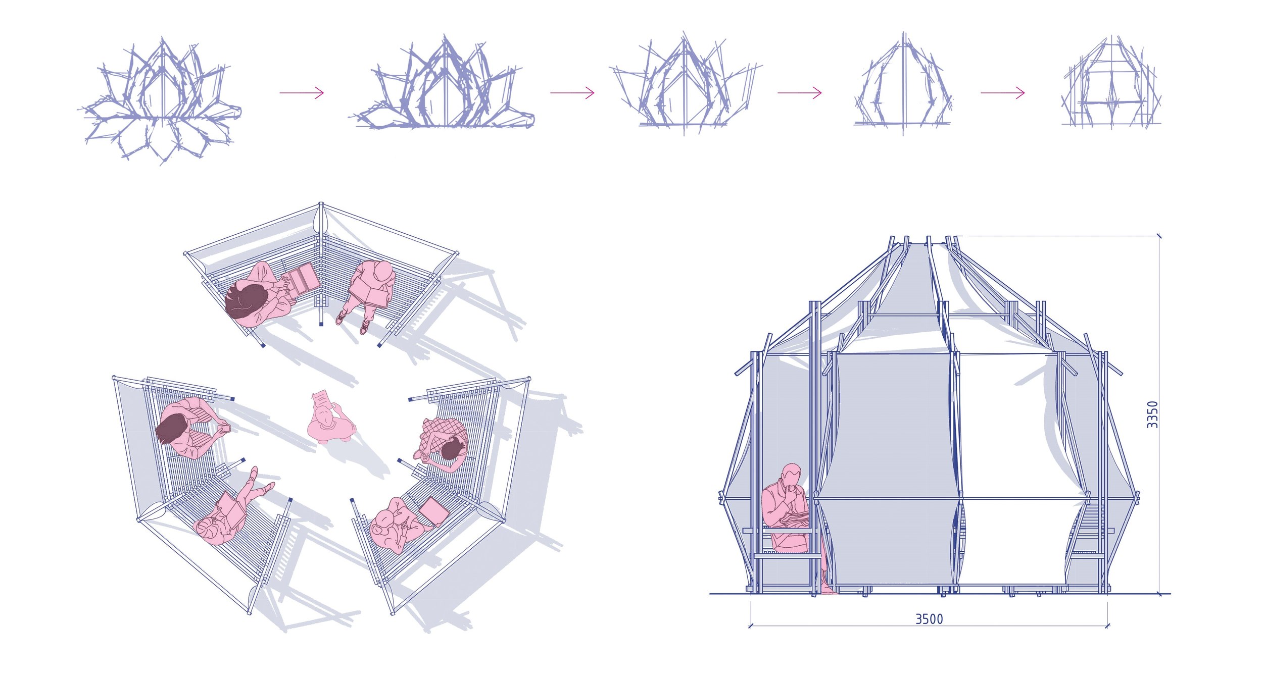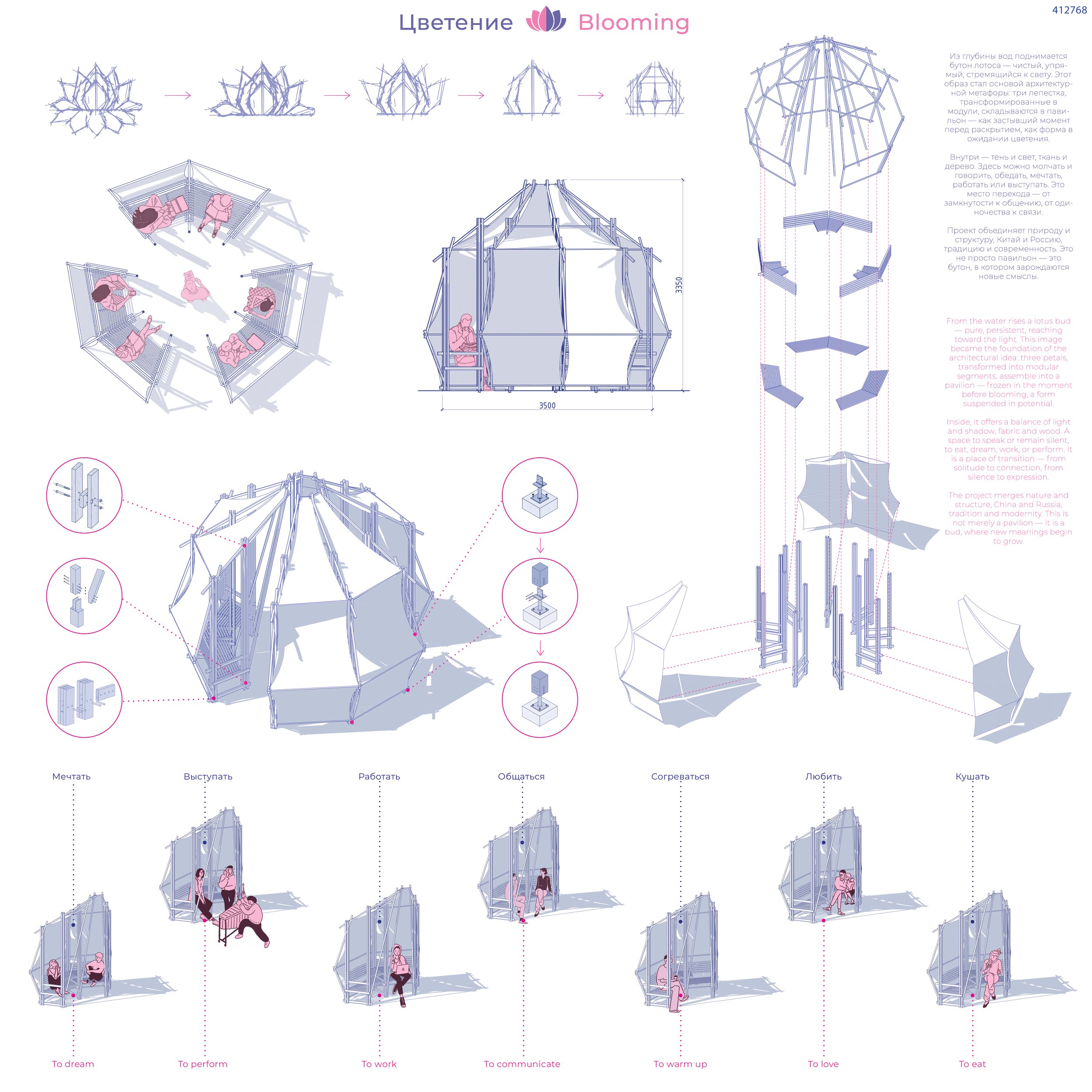 Проект вдохновлен образом лотоса – растения, которое в китайской культуре символизирует просветление, чистоту и силу внутреннего роста. Лотос – это не просто цветок: это путь. Он прорастает сквозь толщу ила и воды, чтобы распуститься на поверхности, устремляясь к свету. Этот процесс можно сравнить с развитием студента: путь от замкнутости к открытому диалогу, от тишины – к совместному смыслу. Форма беседки трансформируется из естественного цветка в геометрическую структуру. Мы как будто «высекаем» архитектуру из природного образа: упрощаем, ограняем, делим форму на модули. В результате рождается композиция из трех идентичных сегментов, которые собираются в единое целое по принципу радиальной симметрии.