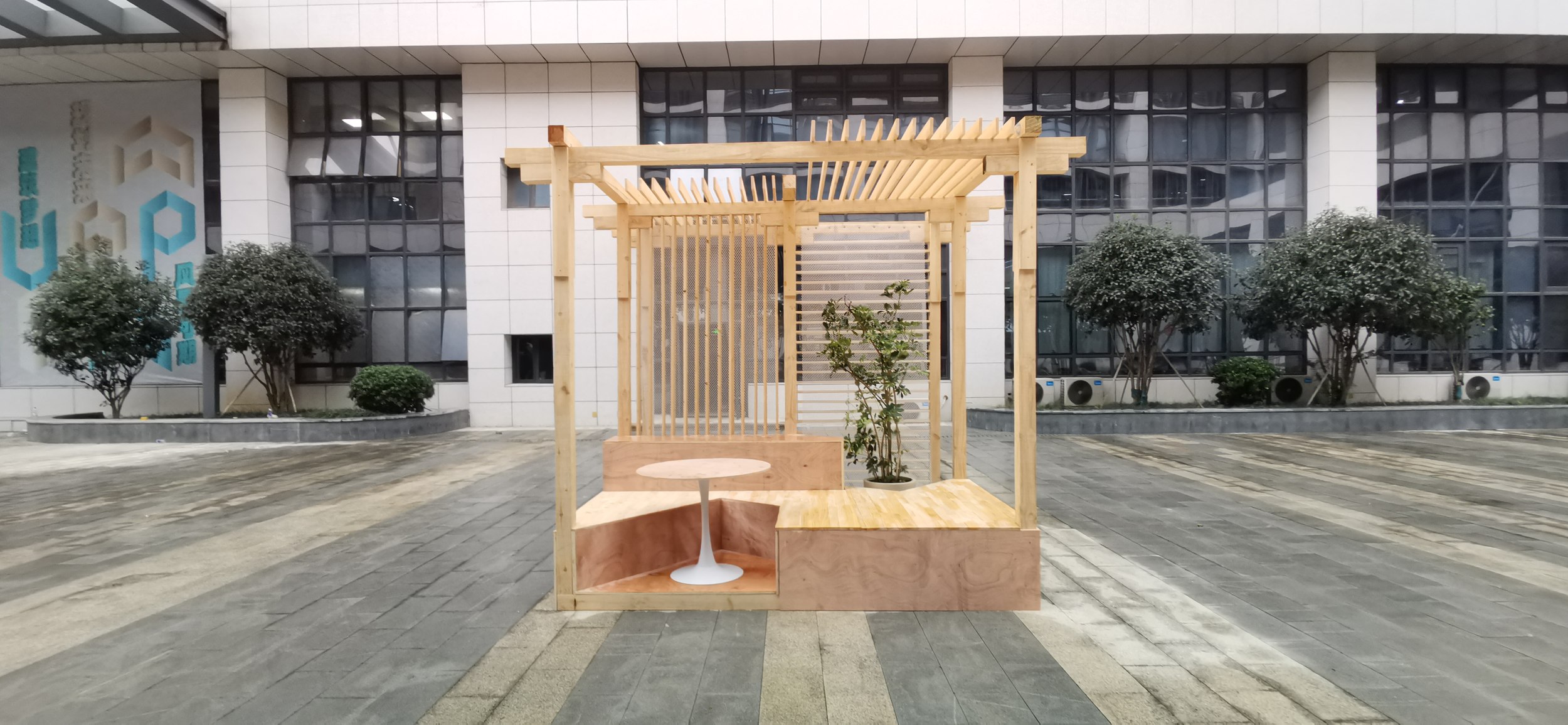 Форма павильона образована из восьми колонн, что является счастливым числом в китайской культуре, и представляет собой условную «куб-коробку» для совместного общения студентов разных эмоциальных типов личности – экстравертов и интровертов. Он образован двумя связанными друг с другом пространствами. Пространство для экстравертов организовано по принципу амфитеатра и дополнено небольшим круглым столом, чтобы было удобно осуществлять различную коллективную активность – проводить публичные выступления, лекции, беседовать, играть в игры, обедать, просто посидеть и отдохнуть вместе. Пространство для интровертов устроено по принципу отдельных тканевых ячеек, создающих ощущение приватности.