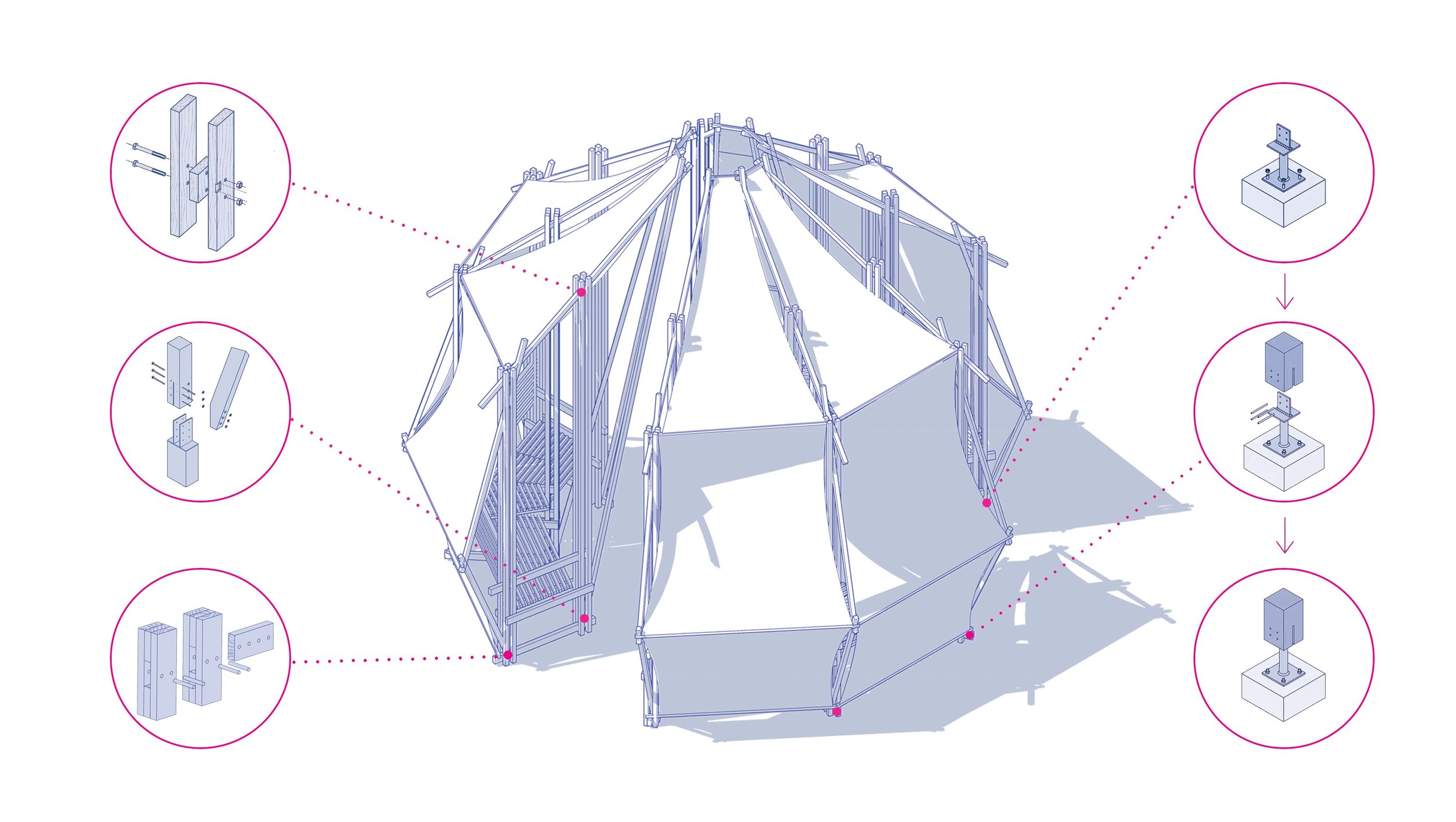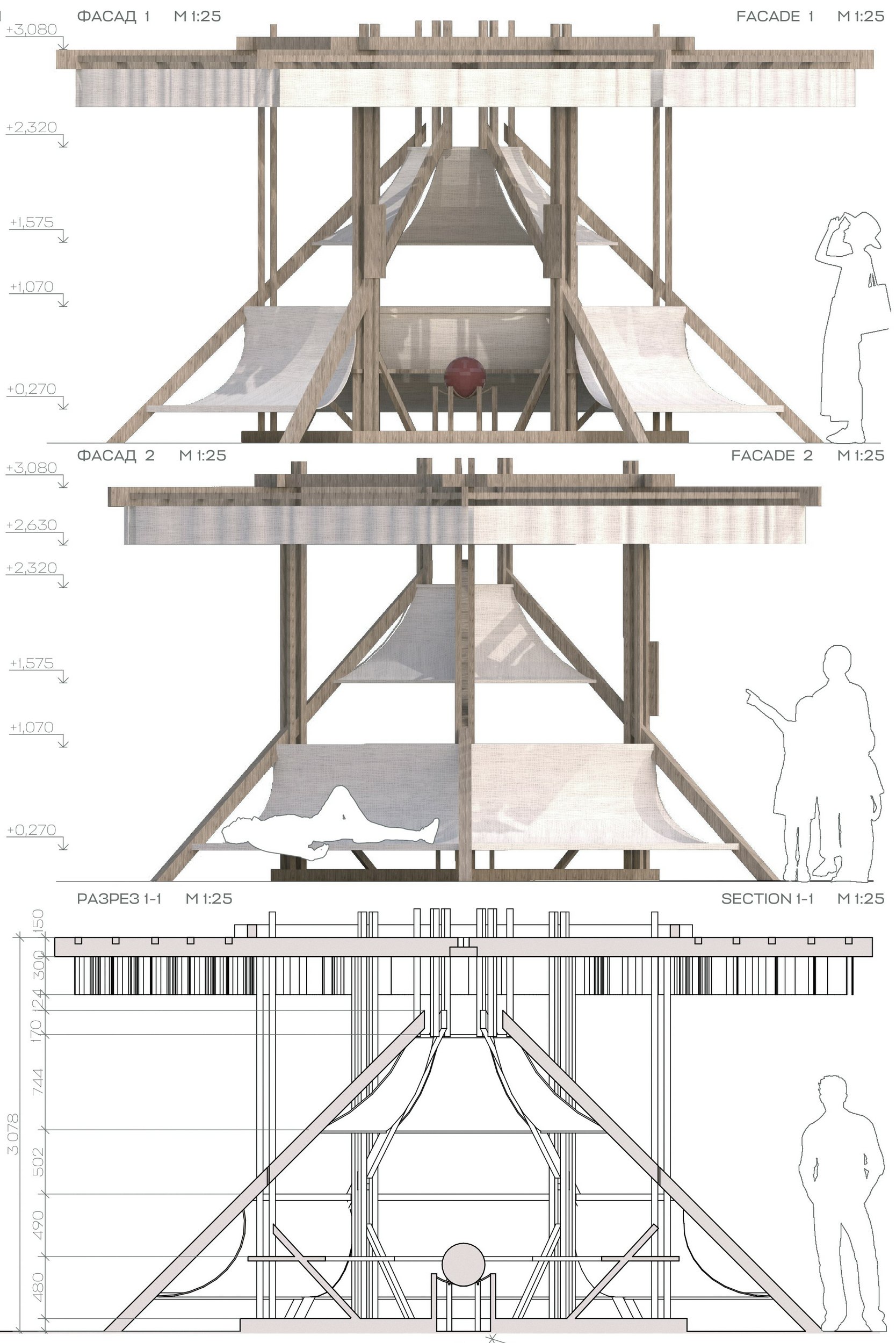 Внешний вид павильона символизирует четыре природные стихии. Проект реализован исключительно с использованием натуральных материалов – древесины, ткани и металла. Детали, выполненные из дерева, соединяются при помощи металлических гвоздей и уголков. Навесы и гамаки выполнены из ткани, прикрепляются к каркасу с помощью строительного степлера. Большинство деталей унифицировано по форме и габаритам, что облегчает процесс изготовления и сборки конструкции. Павильон разработан таким образом, чтобы привлечь внимание своей необычной формой и веселой атмосферой игры».