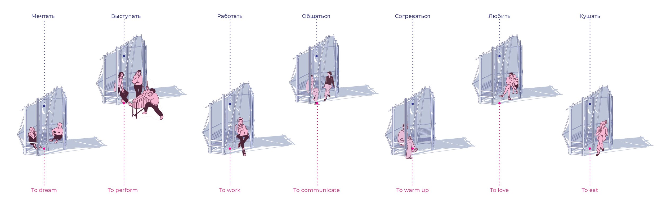 Внутри павильона нет строгих границ и это дает постоянную возможность для налаживания контакта друг с другом. Даже один и тот же человек в разное время имеет разное настроение и может выбирать, из какой части павильона ему будет комфортнее общаться с другими в данный момент».