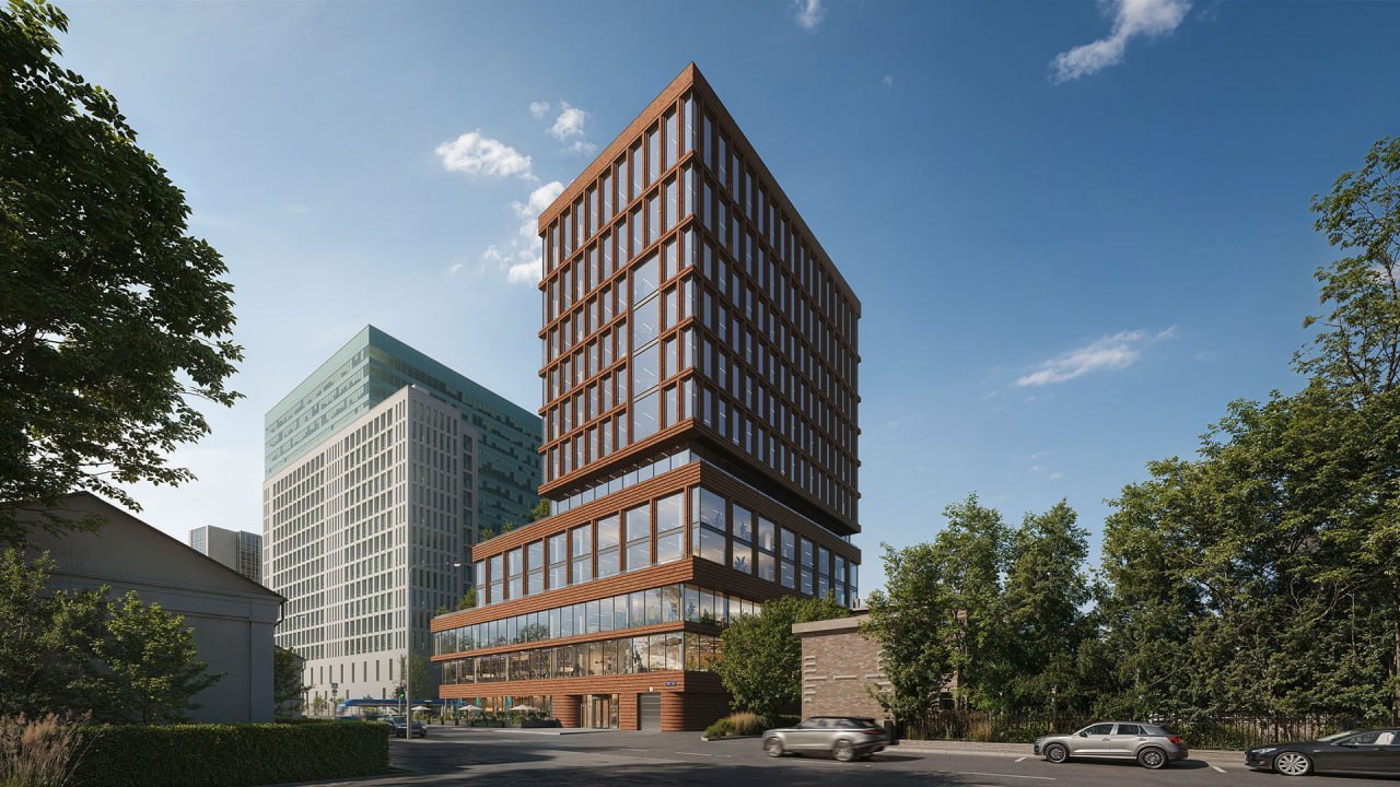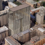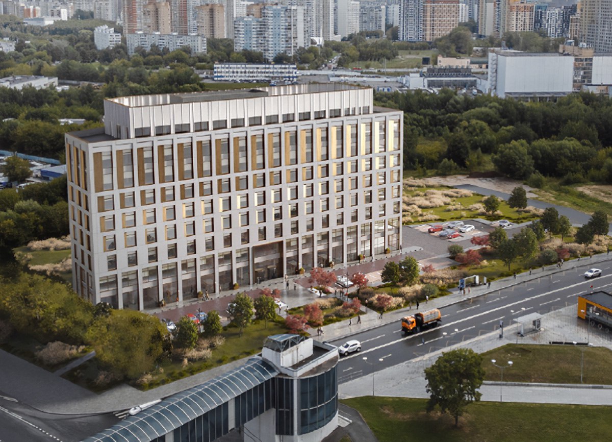 Последний в нашей подборке проект можно было бы отнести к категории «спокойная уверенность», если бы не его расположение. Сравнительно небольшой, 9-этажный бизнес-центр в виде простого параллелепипеда, в стилистике позднего советского модернизма, но с неожиданно «богатой» фасадной отделкой из натурального камня (!) и с вертикальными металлическими вставками золотистого цвета в левой части оконных проемов, по информации канала «Стройки и точка» будет построен возле метро «Боровское шоссе».