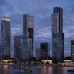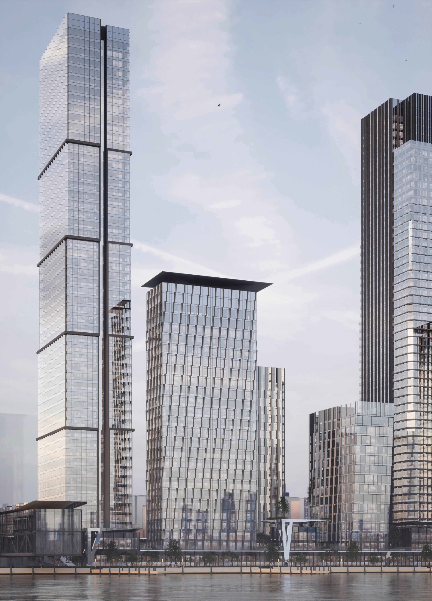 Проекты двух блоков выглядят и устроены идентично: есть высотная доминанта (куда же без нее), есть корпуса пониже. Объемы решены достаточно лаконично, за исключением выноса одного из низких зданий вперед к воде. Все упаковано в стеклянную «броню», немного декорированную разного рода выступами, вставками и рассечками.