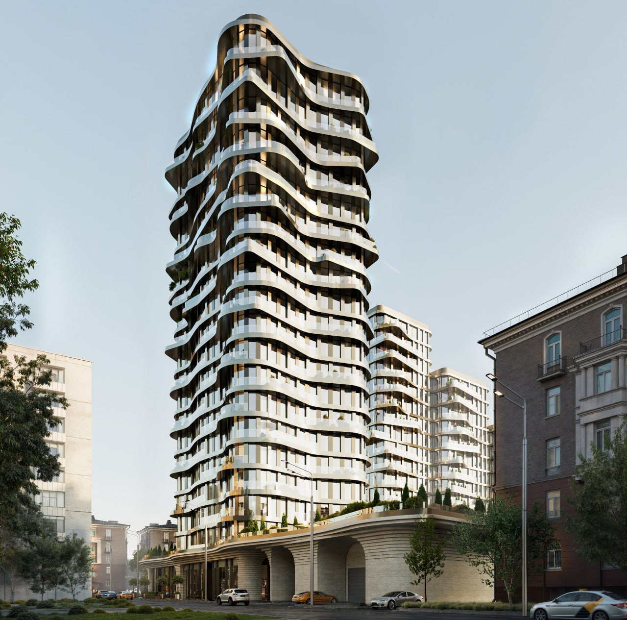 Если предыдущий проект на Мосфильмовской улице можно сказать затронул тему волнистых лоджий, то комплекс на ЗУ «Красноармейская, 11» с интригующим названием «Авторская коллекция резиденций “Муза”» от компании «Мангазея» раскрыл ее потенциал полностью и всеобъемлюще.
