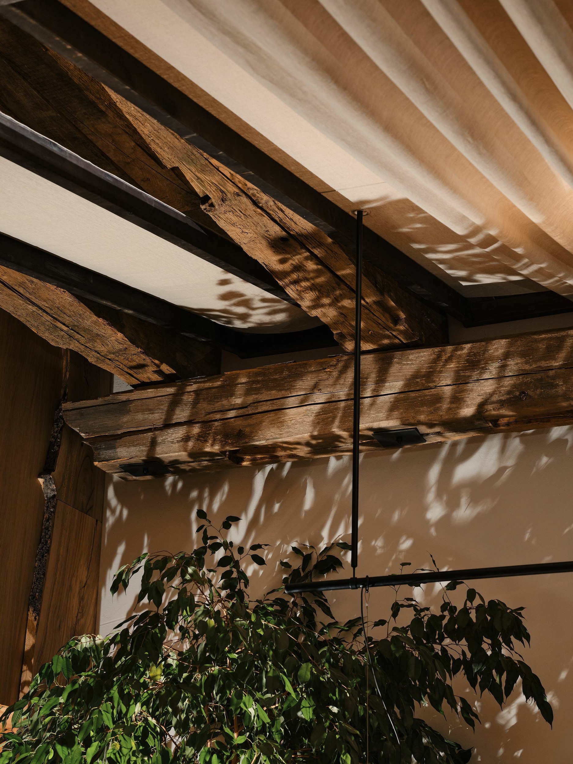 Все балки были бережно восстановлены с сохранением текстуры, дефектов, прожилок – всего того, что делает дерево живым. Каждая балка была вручную очищена, восстановлена и встроена в новую конструкцию – уже не как утилитарная часть крыши, а как эмоциональный акцент пространства.