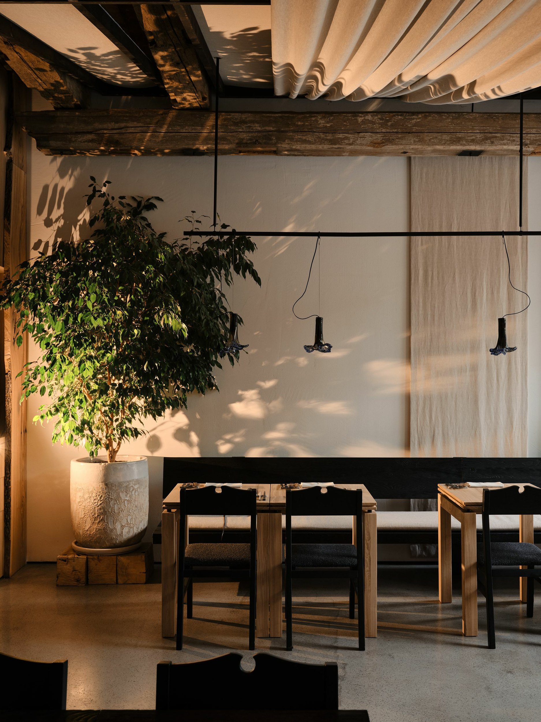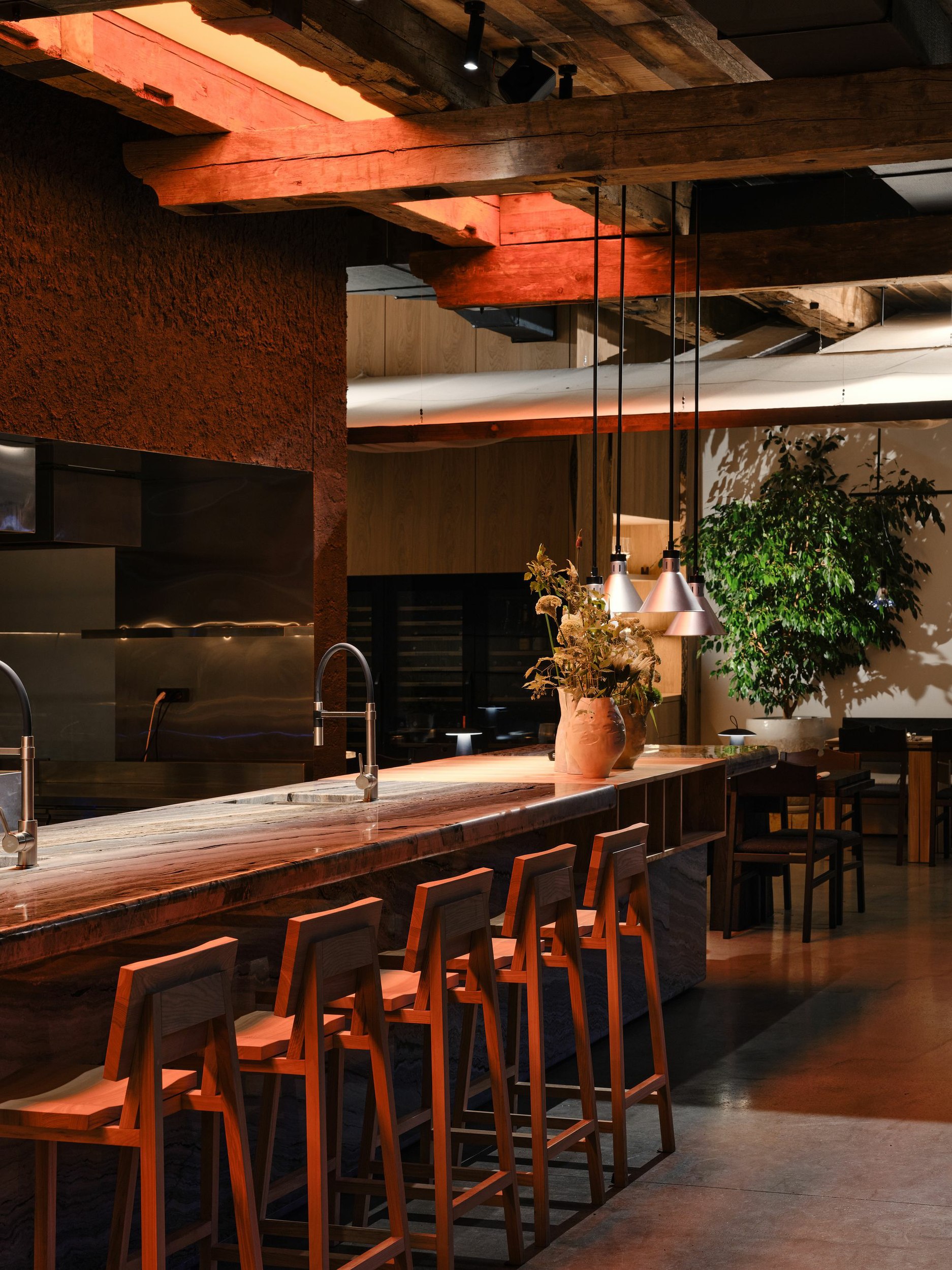 Интерьер основан на принципе локальности: каждый материал имеет местное происхождение и собственную историю.